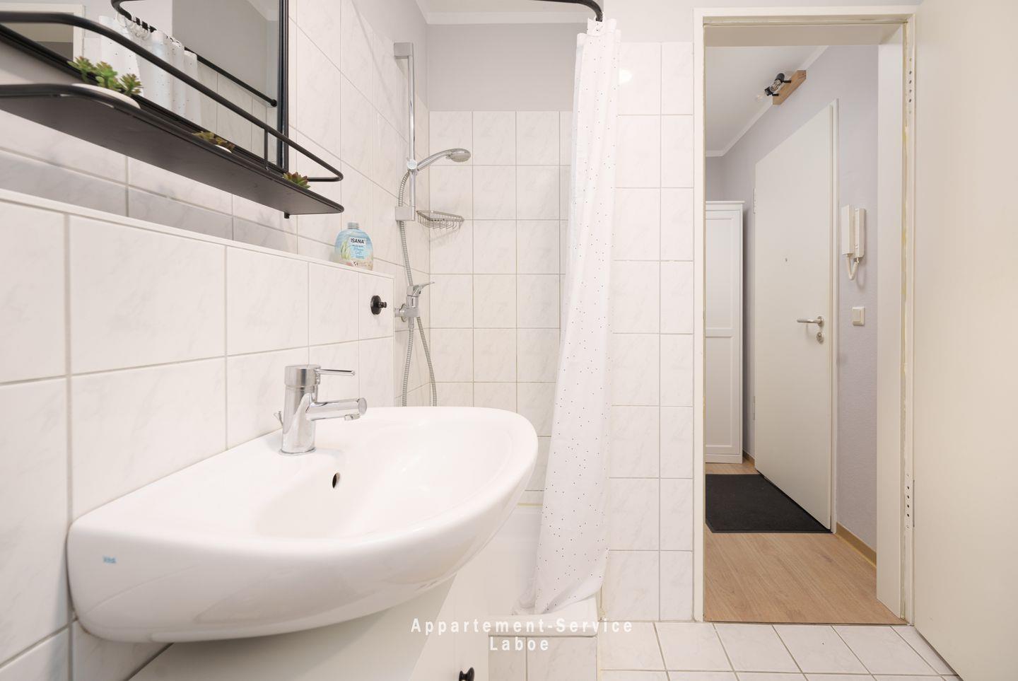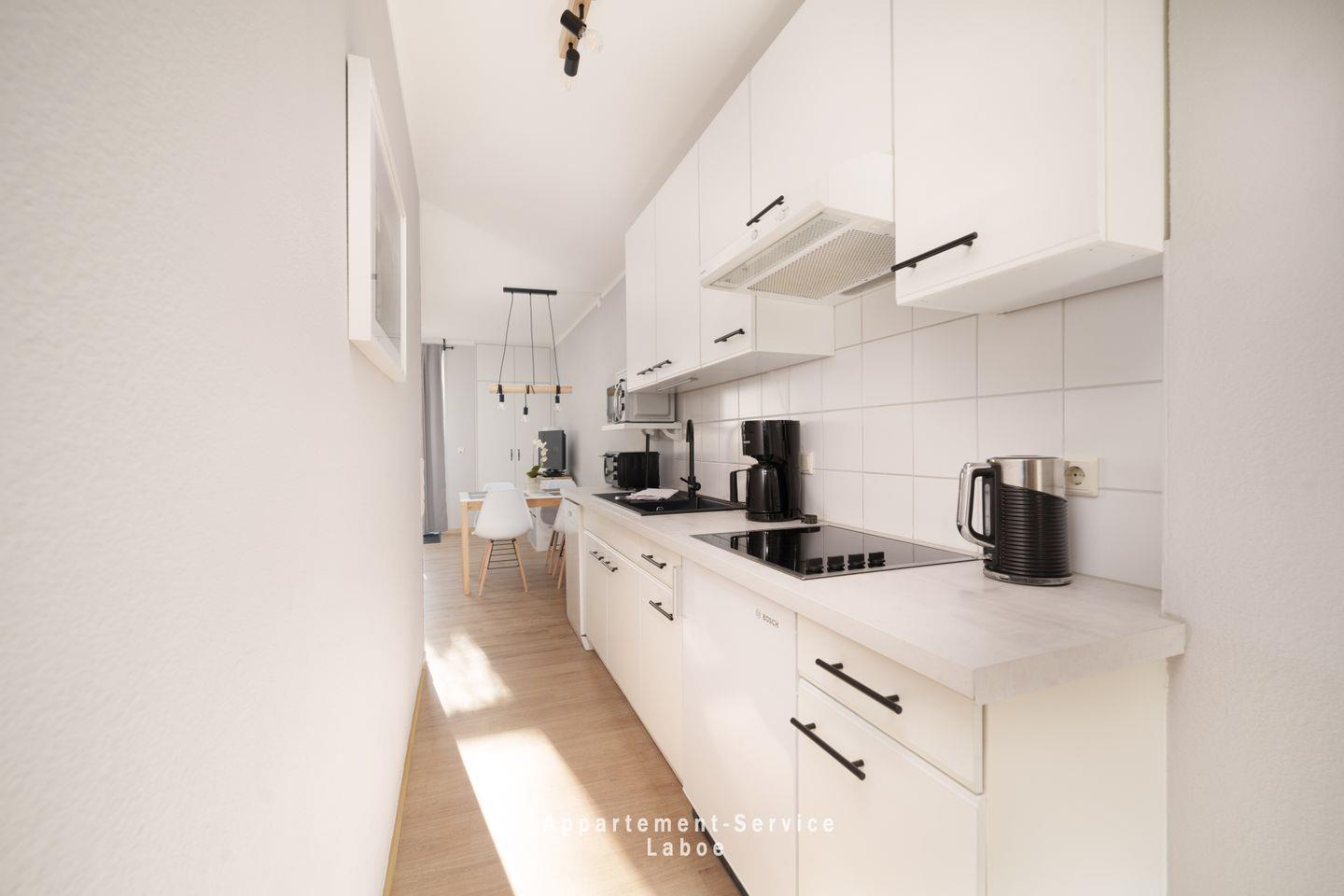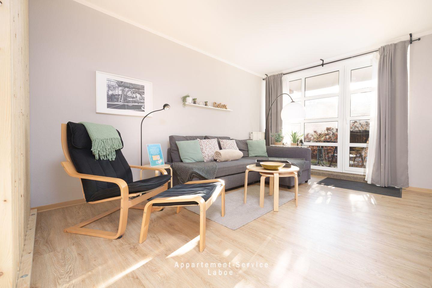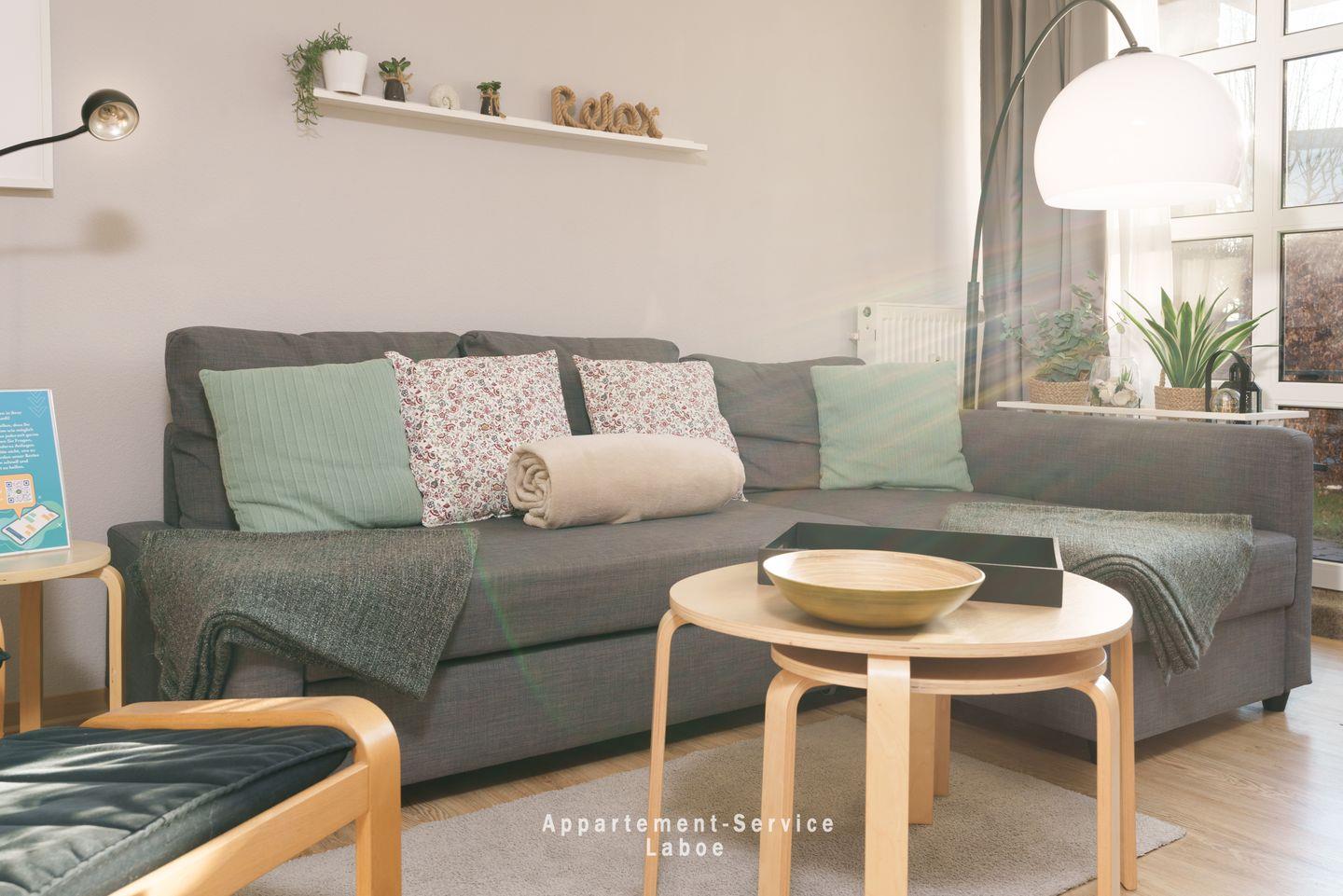 FeWo Strandglück: 1-Zimmer-Wohnung im EG mit 43 m², Wohn-Schlafzimmer mit Sitzgruppe, Schlafnische mit Doppelbett, vollausgestattete Küchenzeile mit Essplatz, Badezimmer mit Dusche und WC, möblierte Terrasse, WLAN, TV, Blu-Ray-Player, Bluetooth-Box, Tiefgaragenstellplatz (Duplexparkanlage max. Höhe 1,50 m, Breite: 2 m, Länge 5 m)