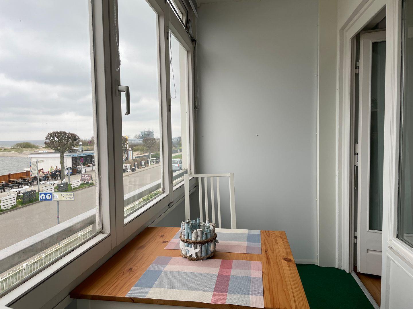 Die Wohnung liegt im ersten Stock und bietet auf ca. 35?m² ein offenes Raumkonzept für ein bis zwei Personen. Wohn- und Schlafbereich sind kombiniert, sodass du den traumhaften Meerblick sowohl vom Bett als auch vom Sofa aus genießen kannst. Das Herzstück der Wohnung ist die verglaste Loggia, in der ein kleiner Esstisch mit zwei Stühlen steht – ideal, um beim Frühstück oder Abendessen den Blick auf die Ostsee schweifen zu lassen, ganz gleich bei welchem Wetter.