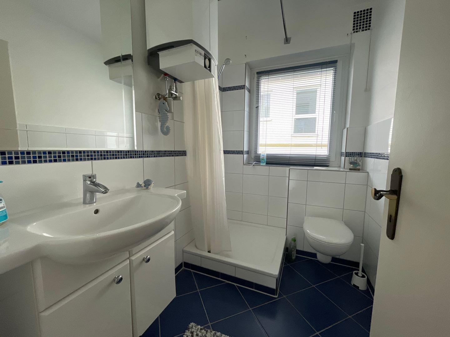 Das Badezimmer ist mit Dusche und WC ausgestattet – kompakt, sauber und zweckmäßig.
