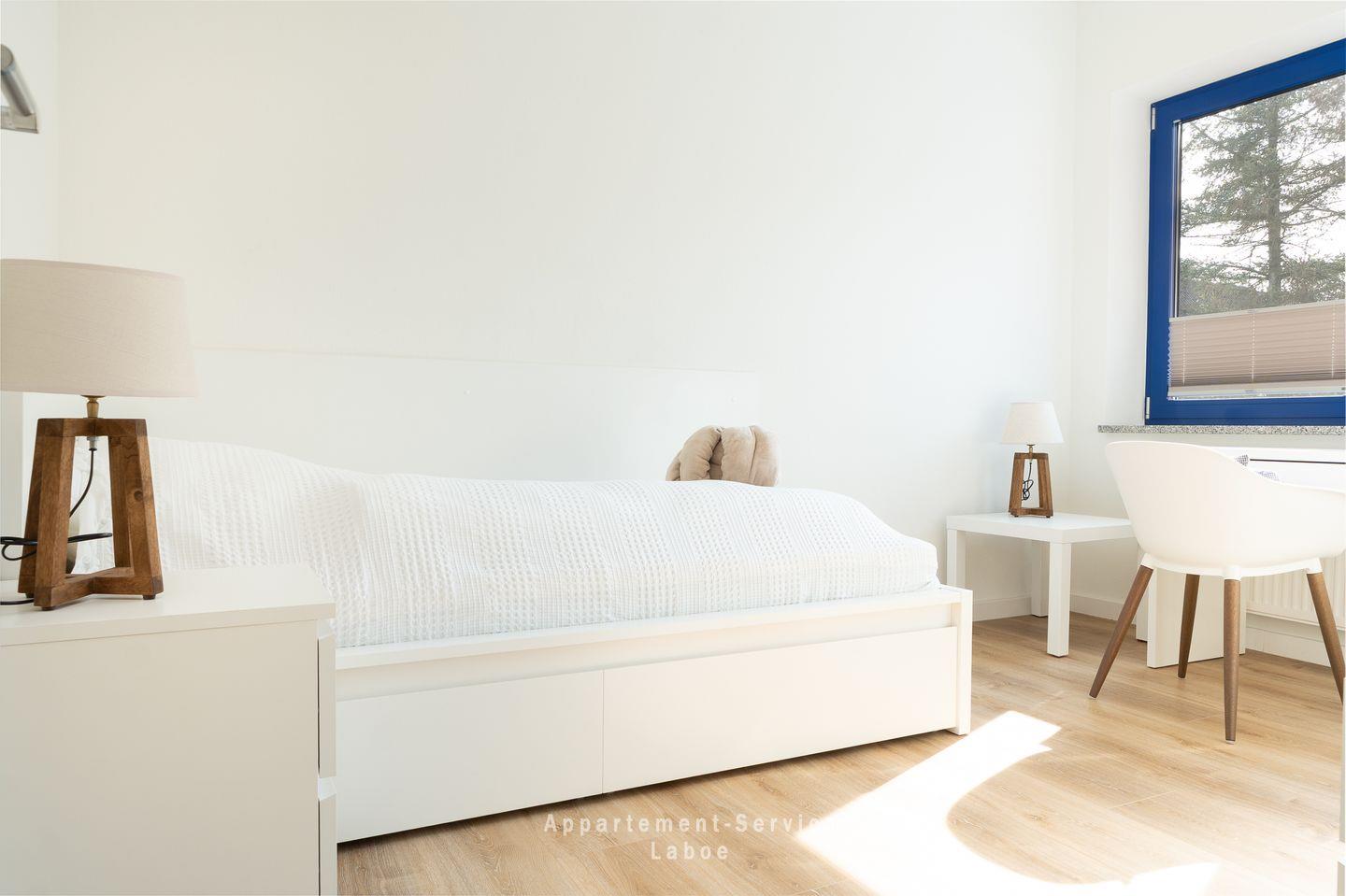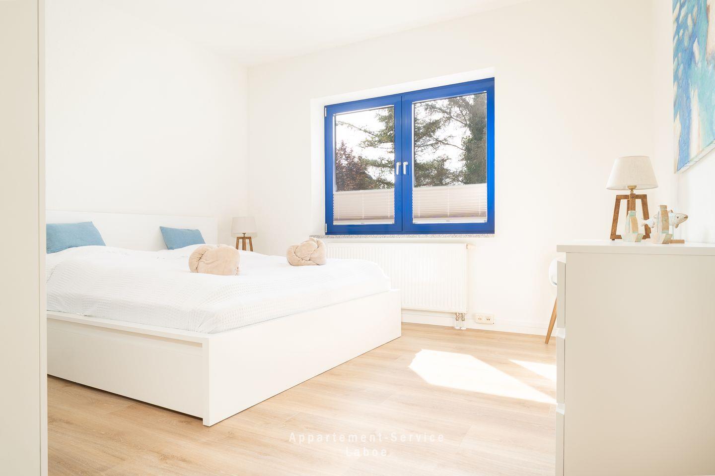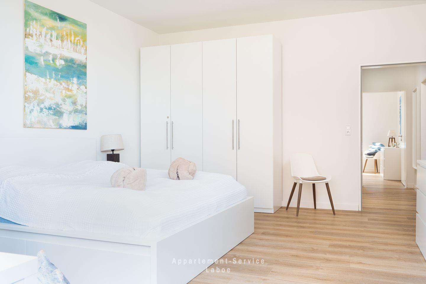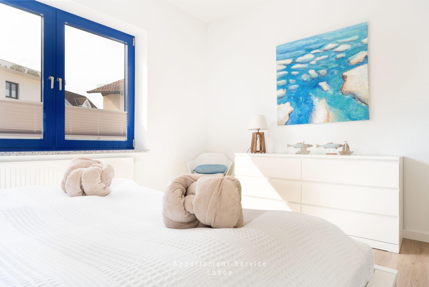 Die Wohnung verfügt über drei Schlafzimmer: zwei mit komfortablen Doppelbetten und eines mit einem Einzelbett. Alle Räume sind mit Kleiderschränken und Kommoden ausgestattet, sodass Sie sich ganz wie zu Hause einrichten können. Besonders hervorzuheben ist das große Schlafzimmer mit einem charmanten Erker, der zum Verweilen einlädt – ideal für eine kurze Auszeit oder konzentriertes Arbeiten mit Blick auf die Förde.