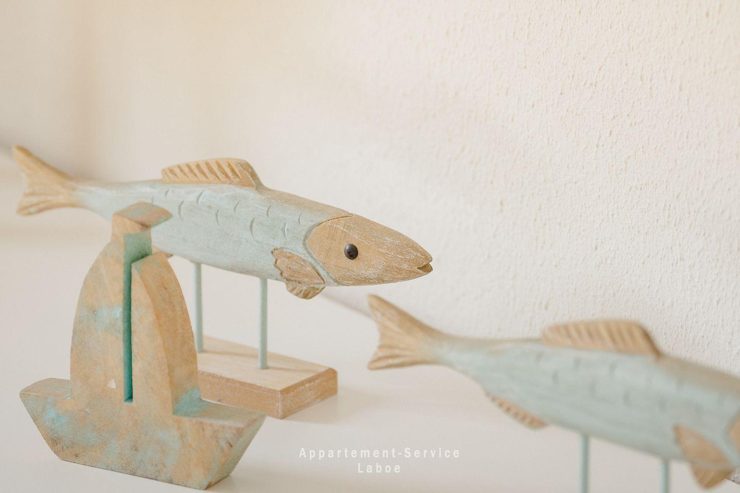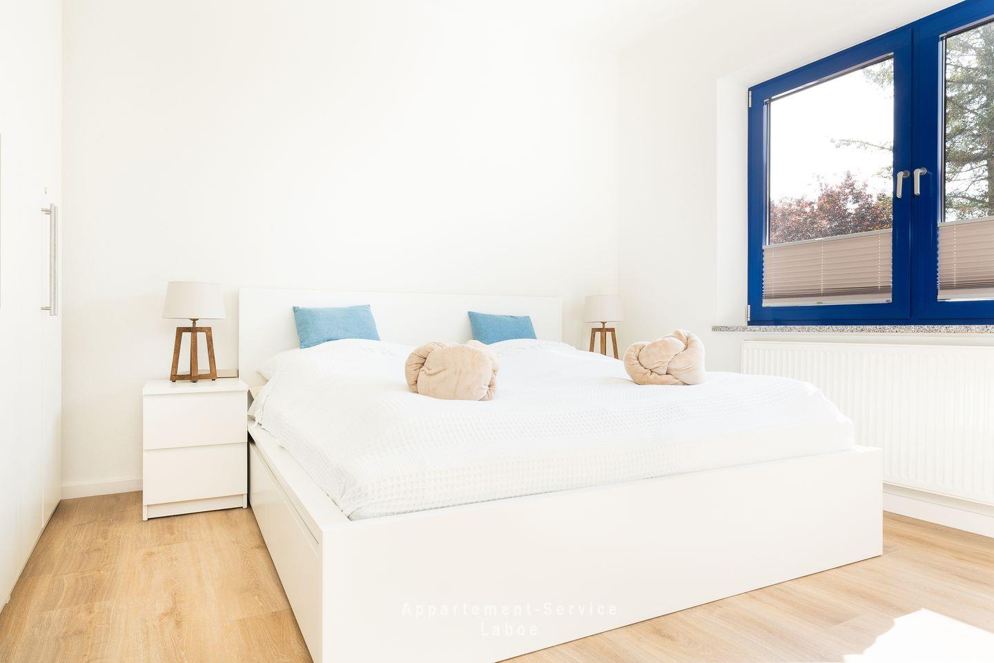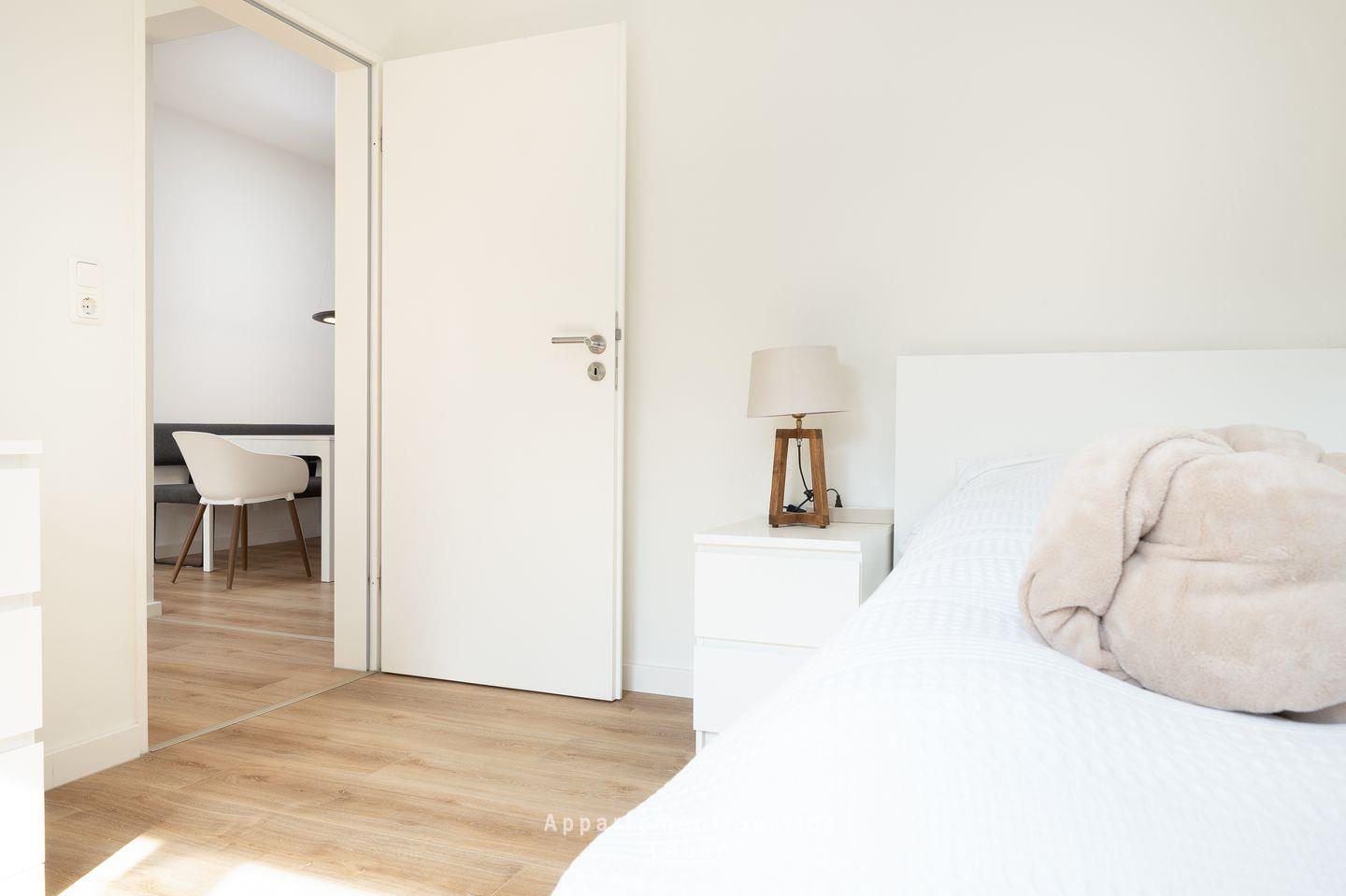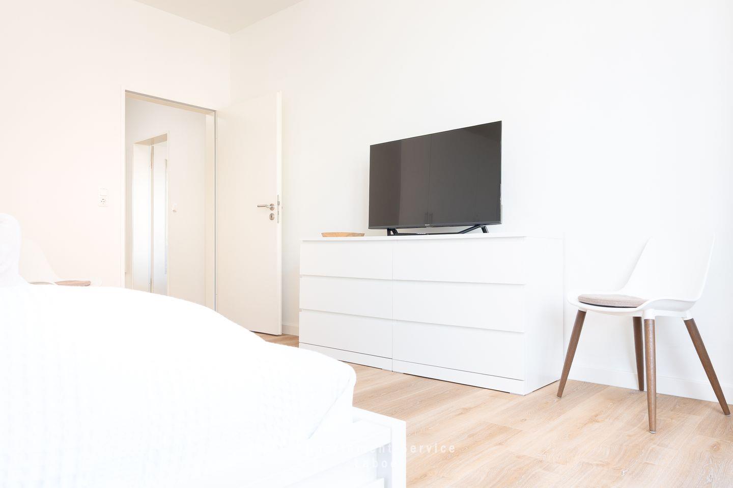 Die Wohnung verfügt über drei Schlafzimmer: zwei mit komfortablen Doppelbetten und eines mit einem Einzelbett. Alle Räume sind mit Kleiderschränken und Kommoden ausgestattet, sodass Sie sich ganz wie zu Hause einrichten können. Besonders hervorzuheben ist das große Schlafzimmer mit einem charmanten Erker, der zum Verweilen einlädt – ideal für eine kurze Auszeit oder konzentriertes Arbeiten mit Blick auf die Förde.