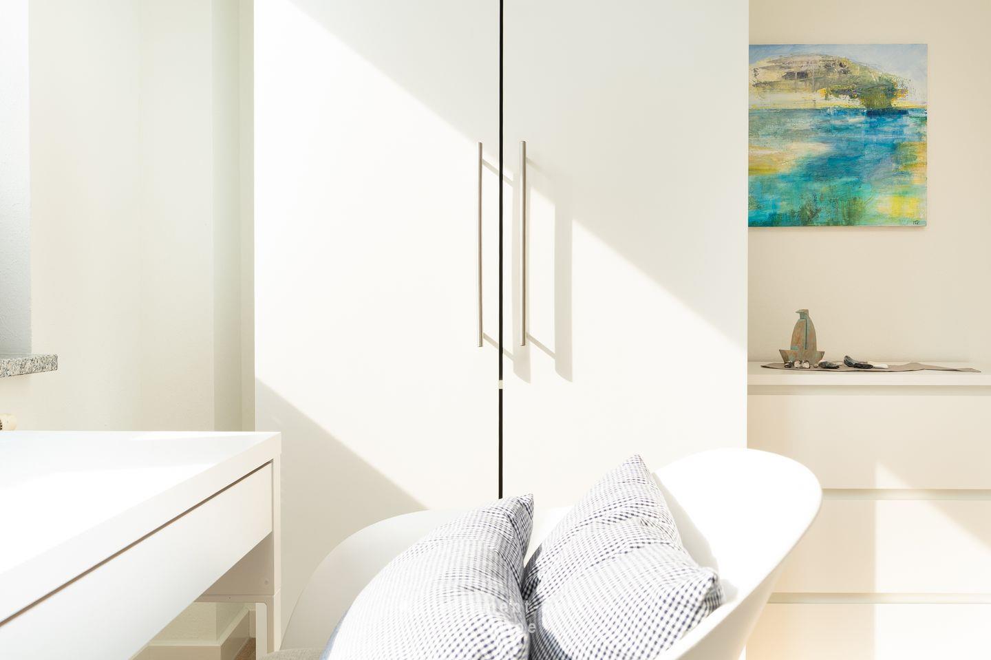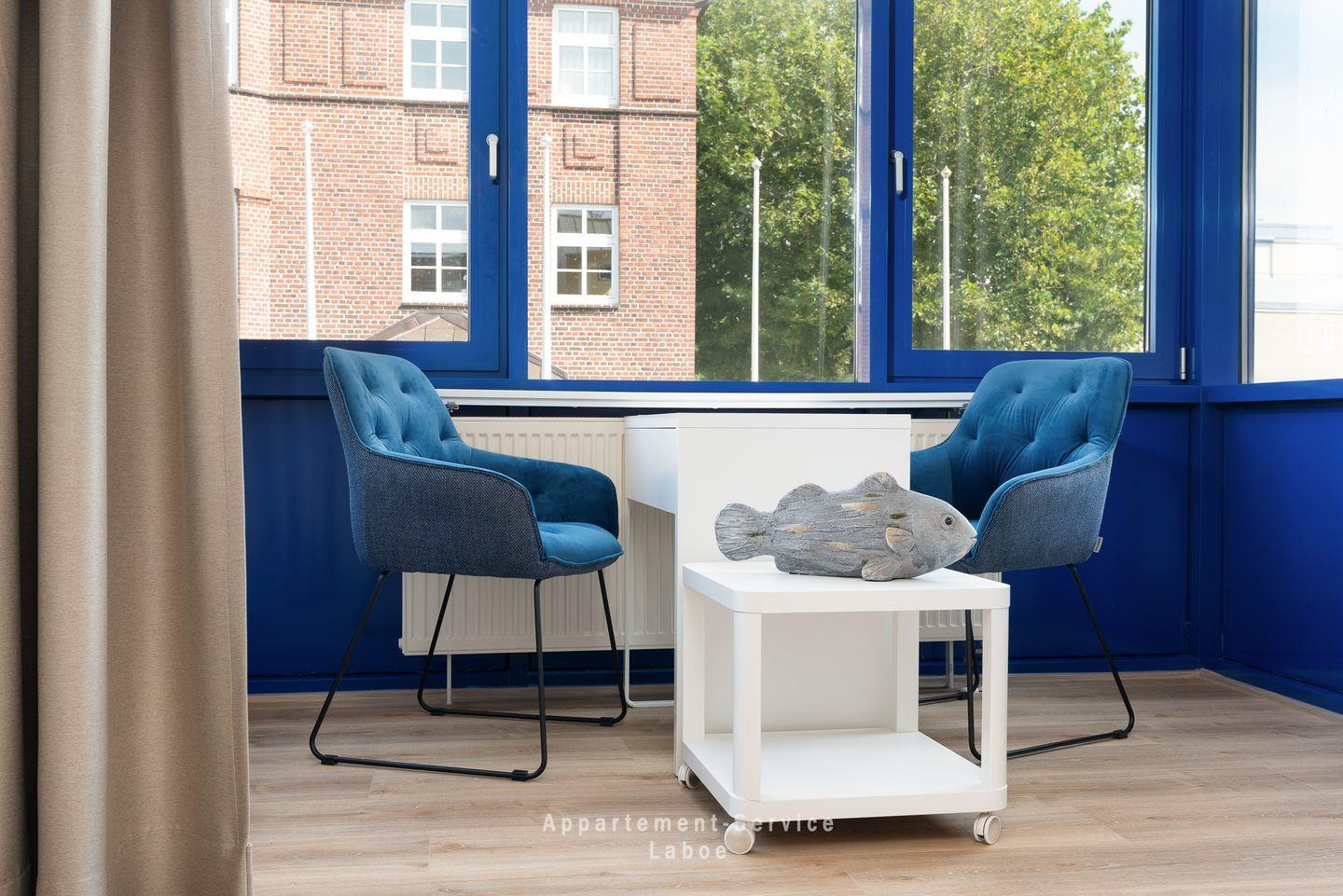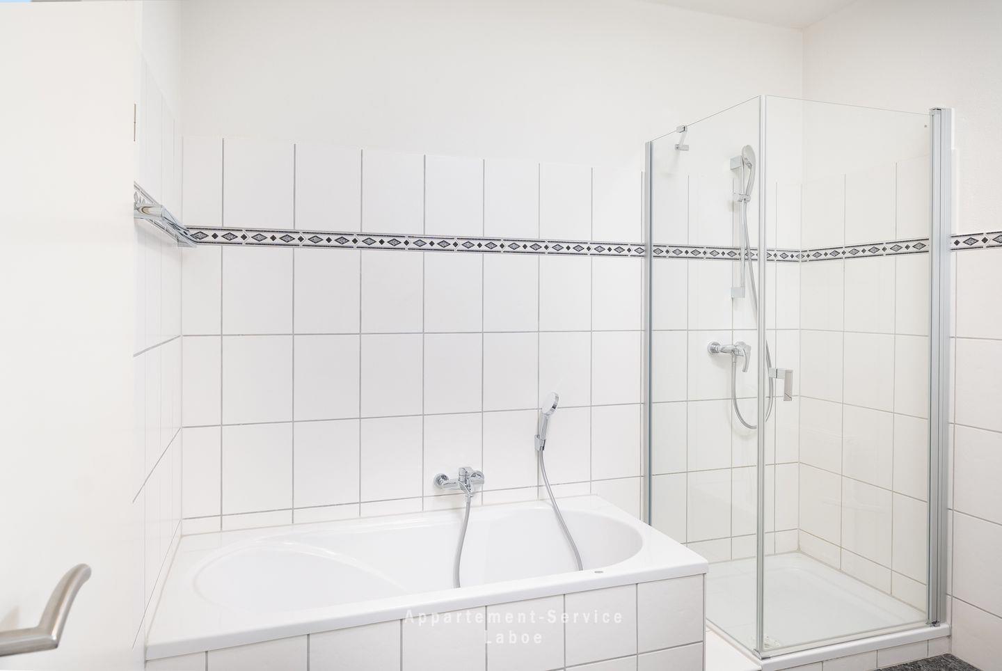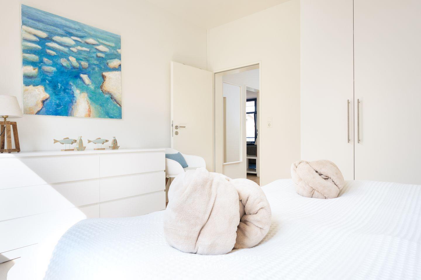 Die Wohnung verfügt über drei Schlafzimmer: zwei mit komfortablen Doppelbetten und eines mit einem Einzelbett. Alle Räume sind mit Kleiderschränken und Kommoden ausgestattet, sodass Sie sich ganz wie zu Hause einrichten können. Besonders hervorzuheben ist das große Schlafzimmer mit einem charmanten Erker, der zum Verweilen einlädt – ideal für eine kurze Auszeit oder konzentriertes Arbeiten mit Blick auf die Förde.