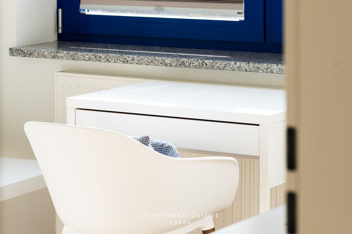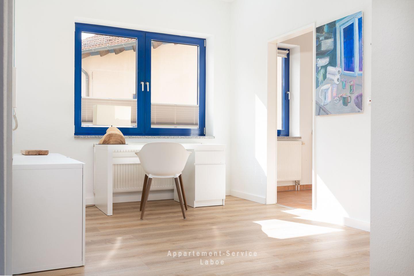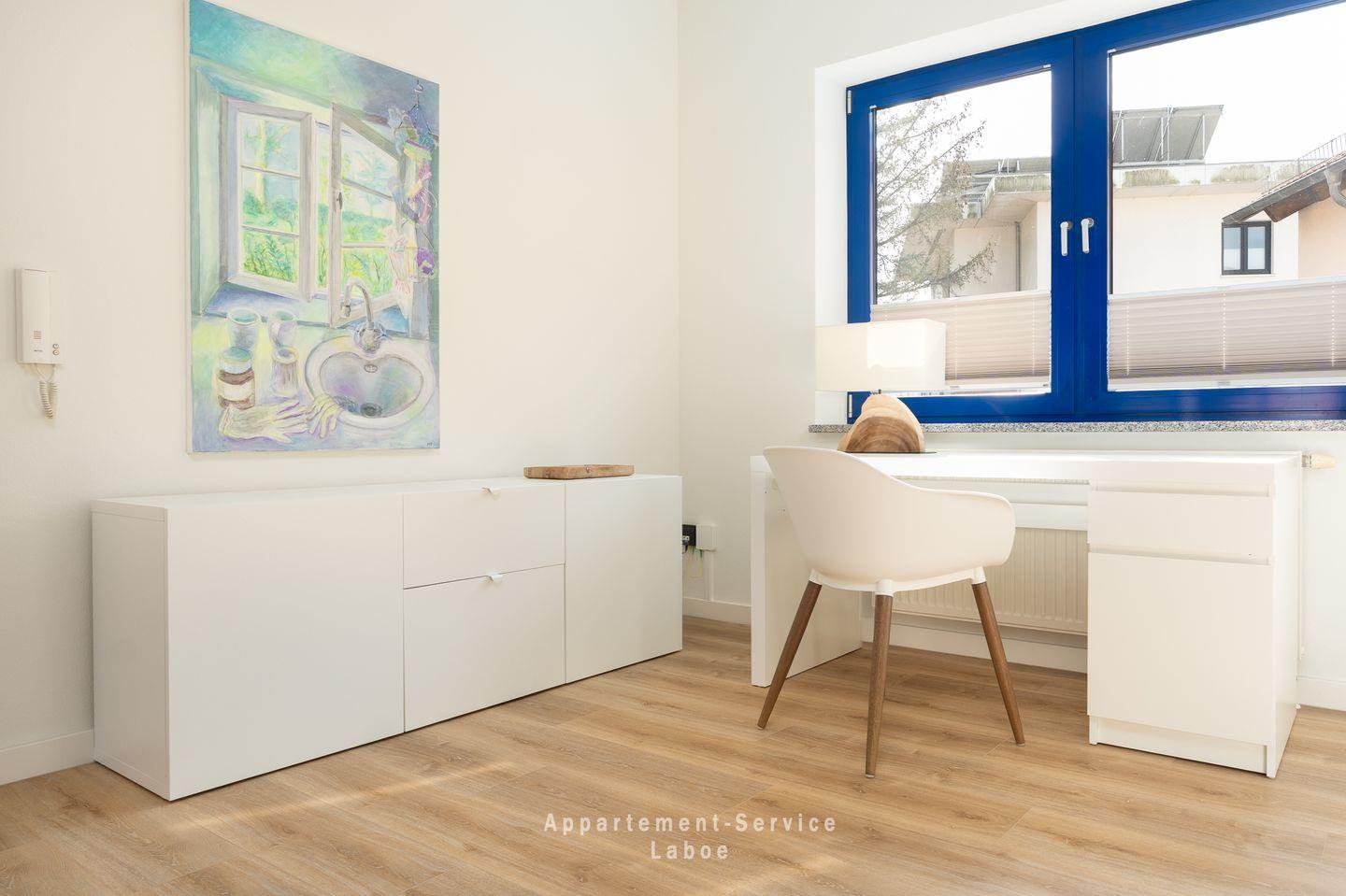 Fürs Arbeiten stehen zwei Schreibtischplätze zur Verfügung, unterstützt durch eine schnelle Internetverbindung via Glasfaser. Eine moderne Einbauküche, ein Abstellraum sowie ein Gäste-WC runden das Angebot im Wohnbereich ab.