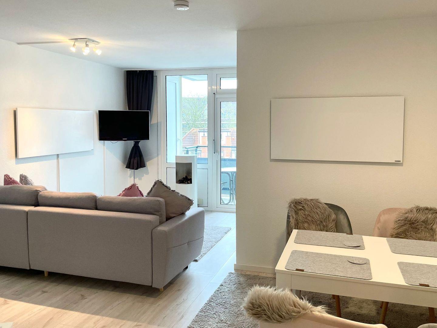 Für Deinen Komfort stehen in der Ferienwohnung zwei Fernseher (Schlafbereich und Wohnbereich), kostenloses WLAN (ideal für Homeoffice oder Streaming), Waschmaschine zur Eigennutzung, Wäscheständer, Staubsauger, Bügelbrett und Bügeleisen zur Verfügung. Moderne Annehmlichkeiten wie Zentralheizung, Kaminofen (Ethanol) für gemütliche Stunden in der kühleren Jahreszeit sowie ein Ganzkörperspiegel, Kosmetikspiegel und Haartrockner im Badezimmer sind ebenfalls vorhanden.