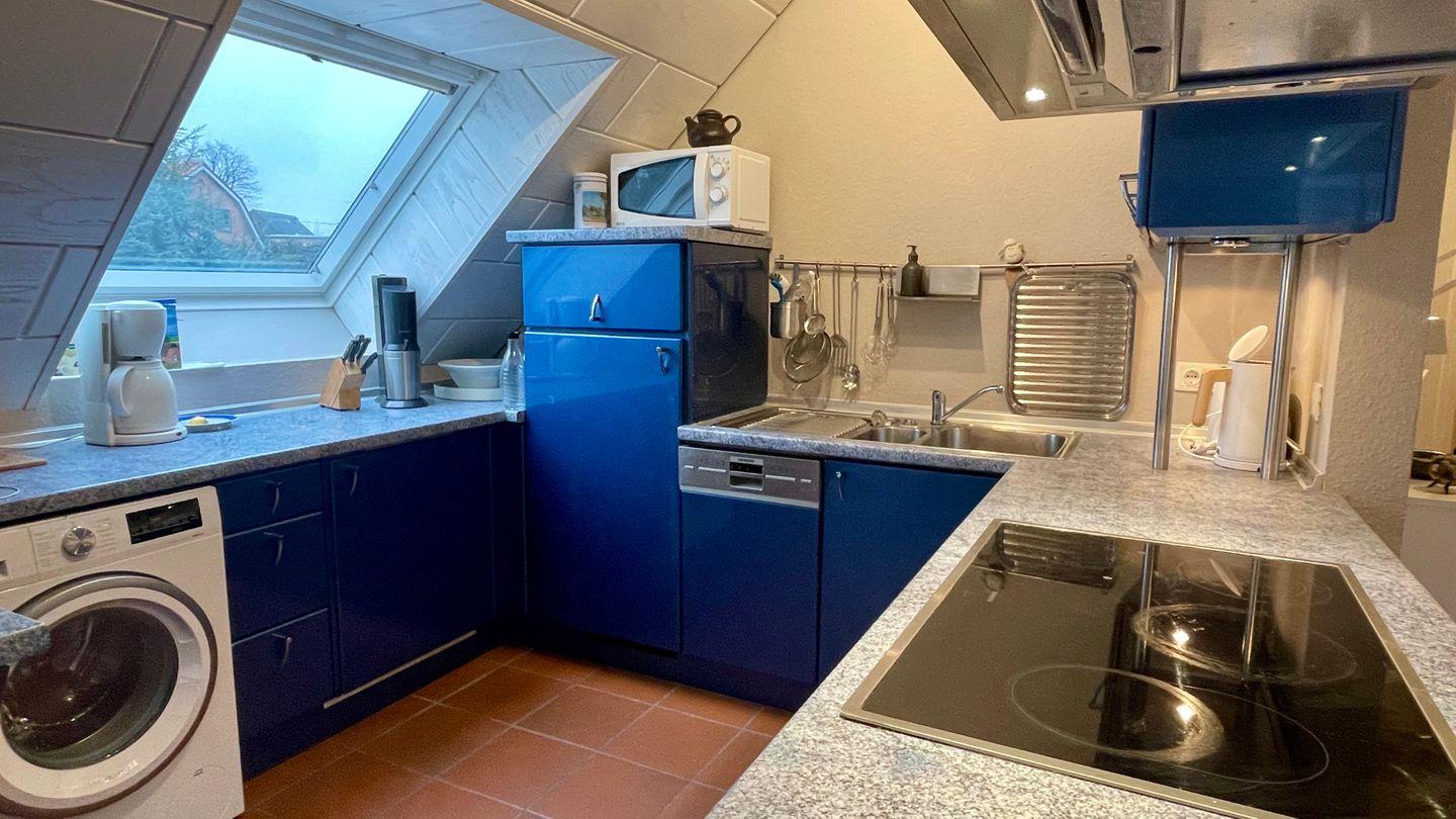 Die offene Küche ist direkt zum Wohnzimmer gestaltet und vollständig für die Selbstversorgung ausgestattet: Ceran-Herd, Backofen, Mikrowelle, Kühlschrank sowie ein extra Gefrierschrank stehen ebenso bereit wie Spülmaschine, Kaffeemaschine, Wasserkocher, Toaster, Küchenutensilien sowie Geschirr und Besteck; Geschirrhandtücher sind ebenfalls vorhanden. Für längere Aufenthalte profitierst Du zusätzlich von einer Waschmaschine, Wäscheständer und Staubsauger.