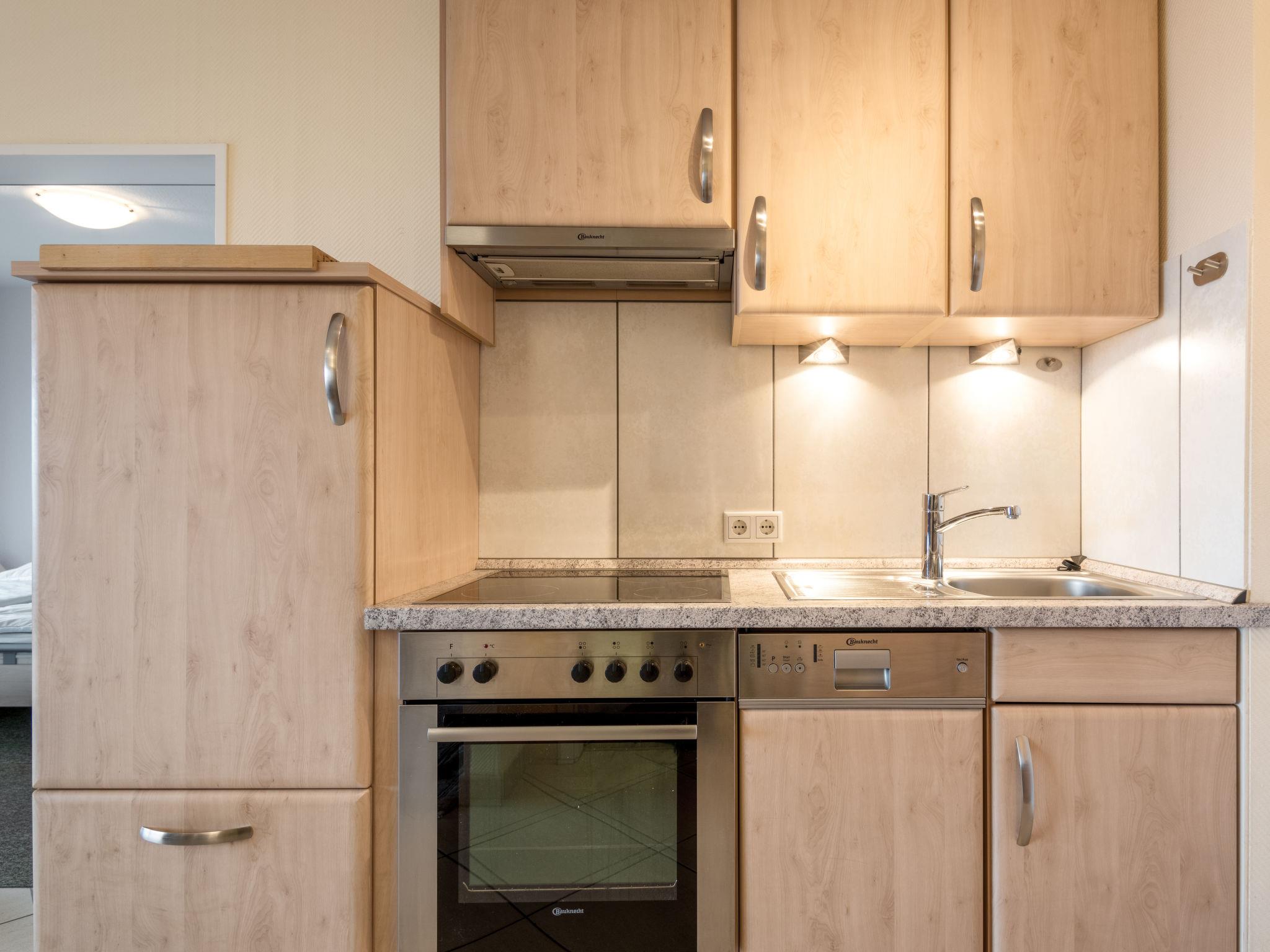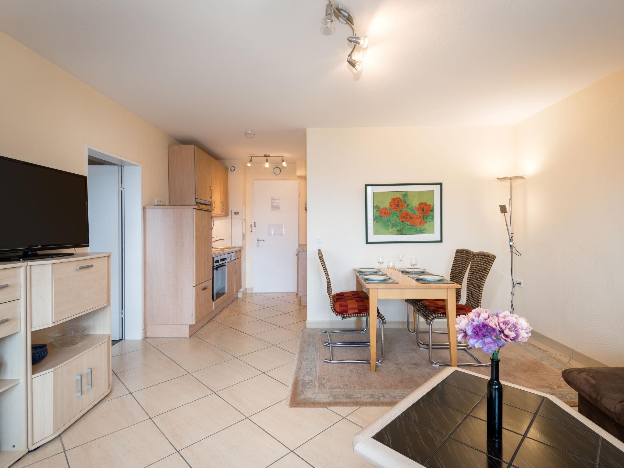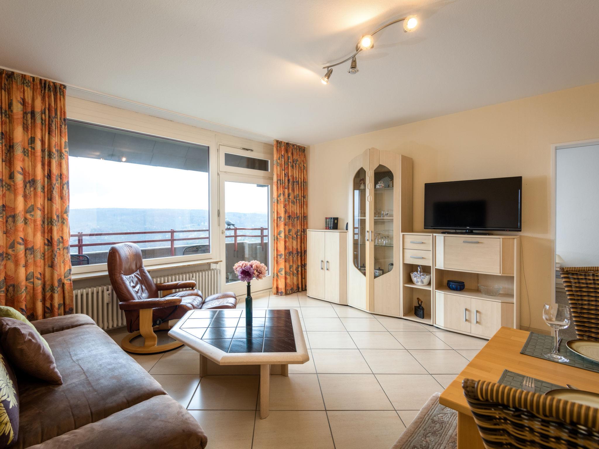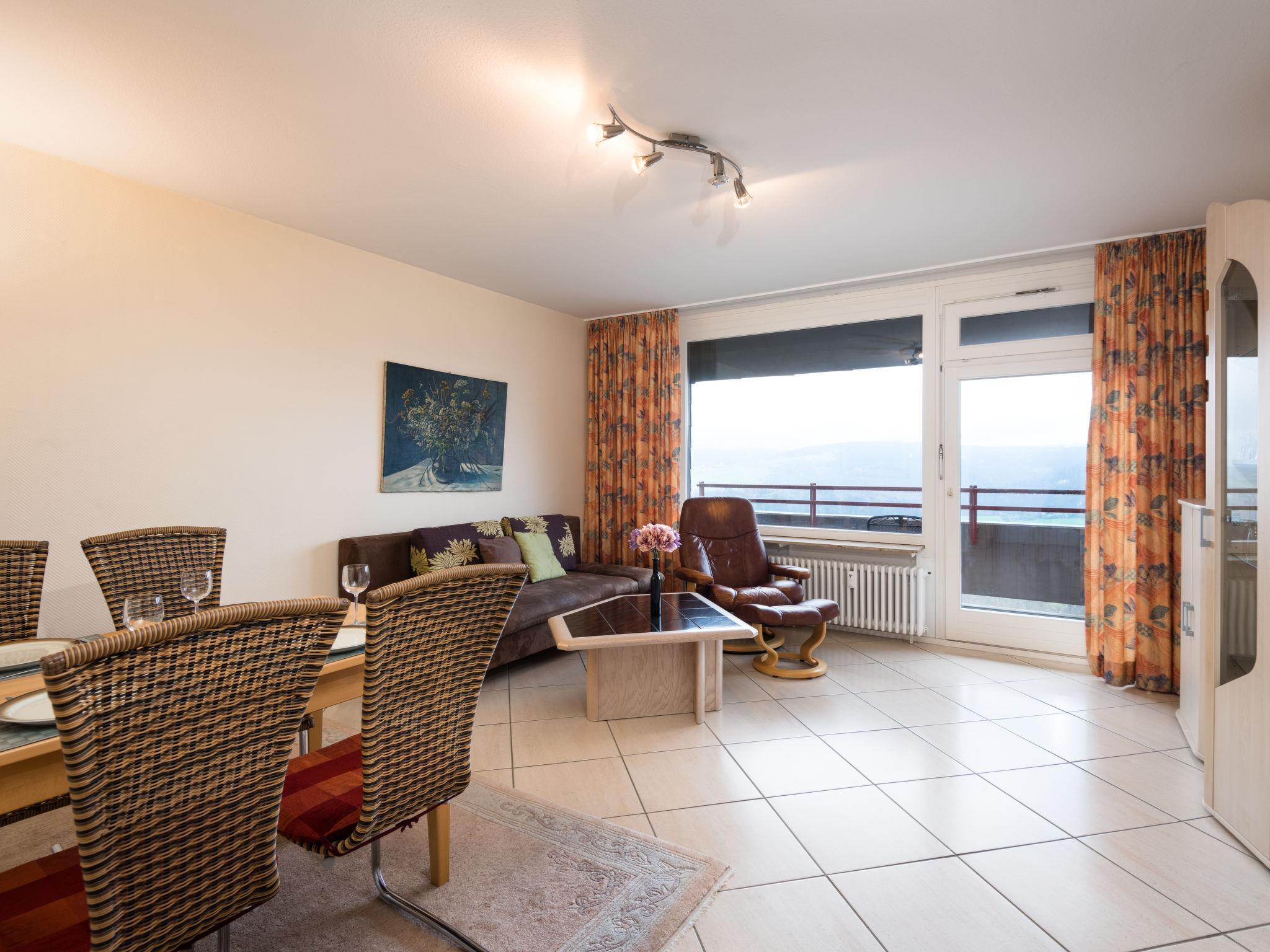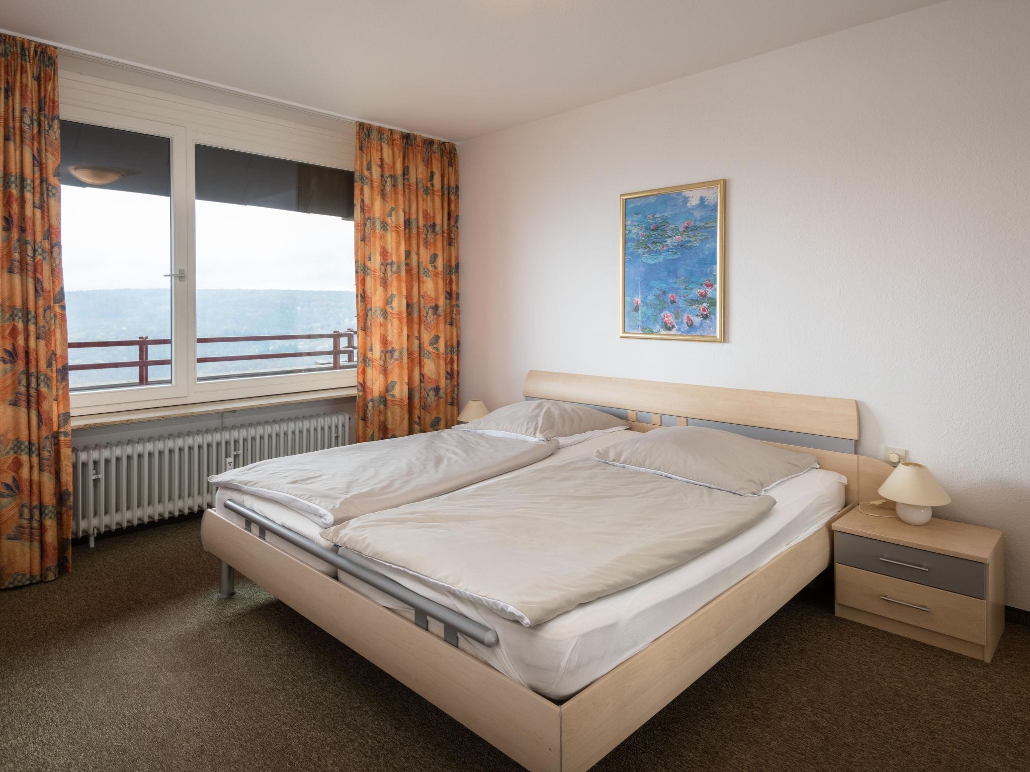 "Talblick (B1101)", 2-room apartment 52 m2 on 11st floor, east facing position. Living/dining room with 1 double sofabed (140 cm, length 200 cm), satellite TV (flat screen). Exit to the balcony. 1 room with 1 double bed (2 x 100 cm, length 200 cm). Open kitchen in the entrance (oven, dishwasher, 4 ceramic glass hob hotplates, toaster, kettle, electric coffee machine). Shower/WC. Balcony furniture. Marvellous view of the countryside. Facilities: Internet (WiFi, free). Please note: non-smokers only. Smoke alarm.