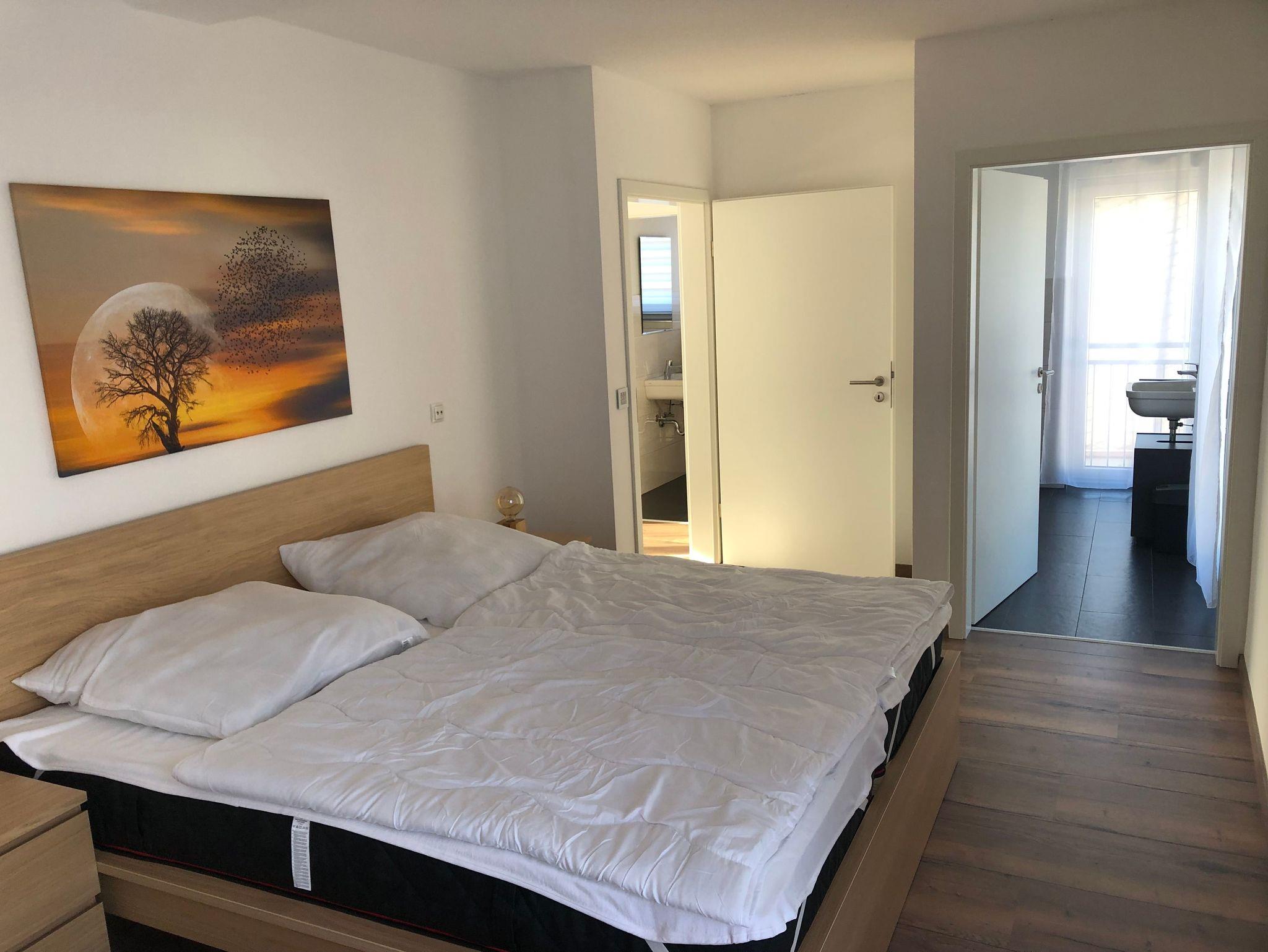 Schlafzimmer, das Gäste WC, der Küchenbereich und der grosse SÜD-Balkon mit