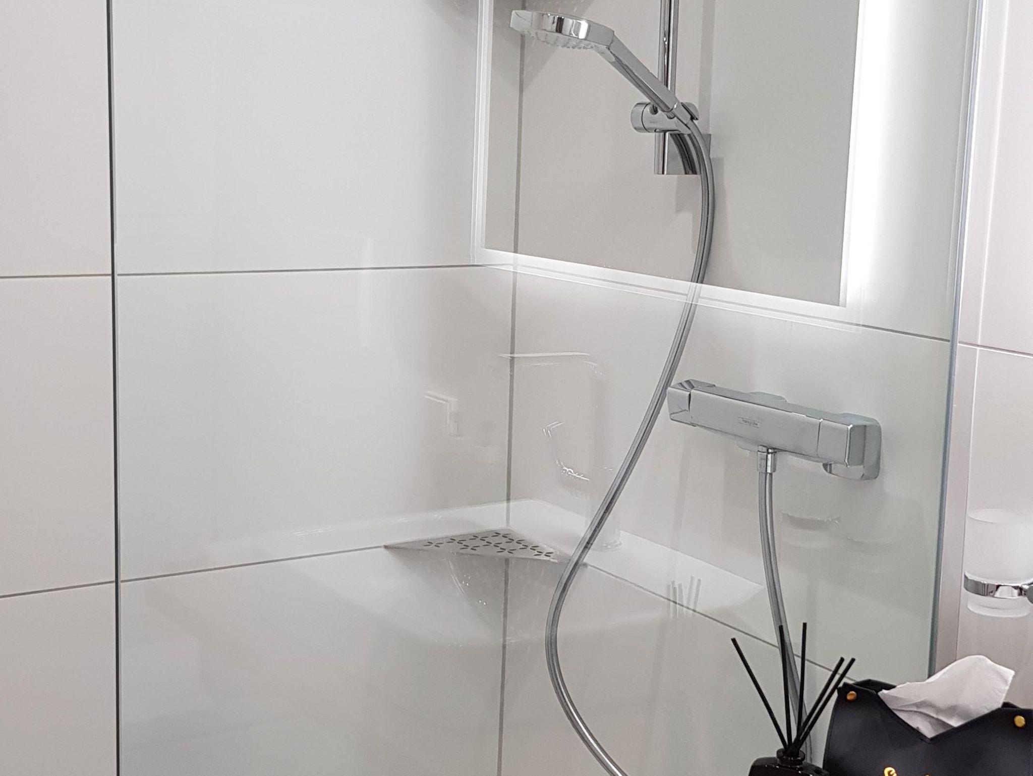 Kabel -TV, Küche mit Esstheke, Bad mit Dusche, Fön und WC.