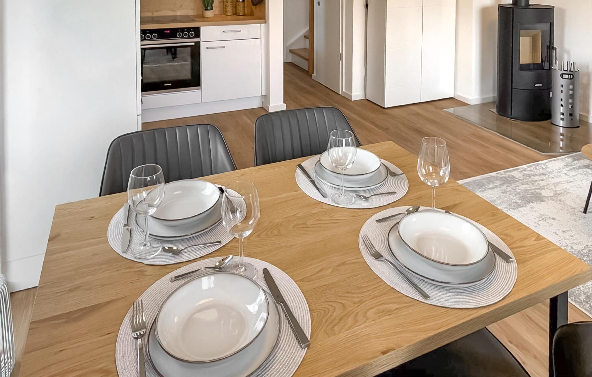 Ihr Haus erstreckt sich über 2 Etagen. Im Erdgeschoss befindet sich ein offener, gemütlicher Wohnbereich mit angrenzender Gartenterrasse und einer modernen Einbauküche, welche durch bodentiefe Fenster zum Verweilen einlädt. An kalten Tagen können Sie es sich vor dem eingebauten Kamin gemütlich machen. Neben dem Wohnbereich befindet sich ein helles Badezimmer mit Duschkabine und Infrarotsauna.
