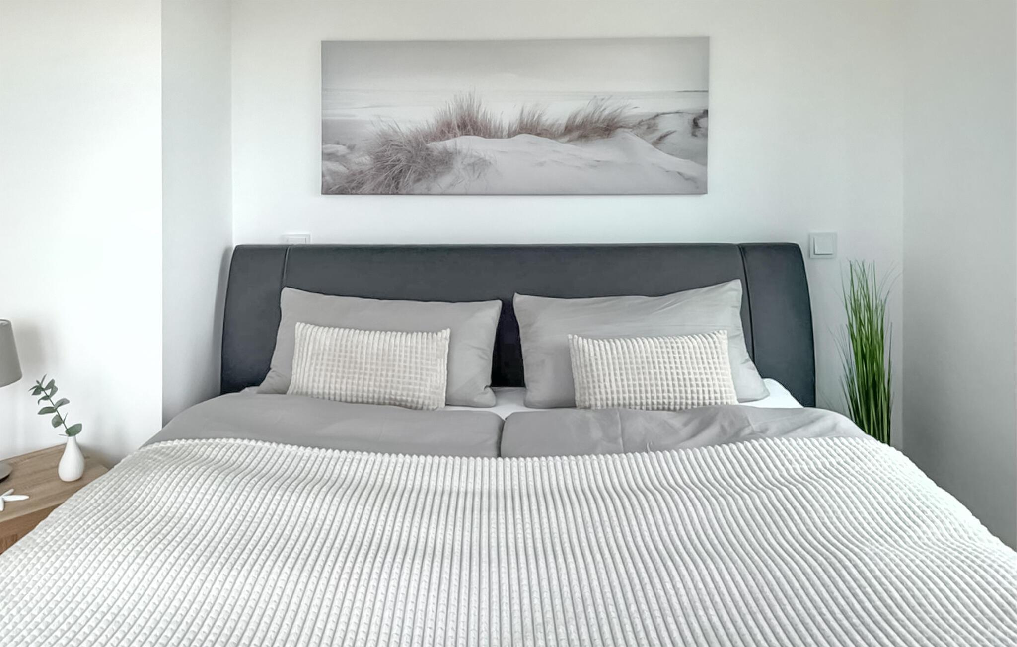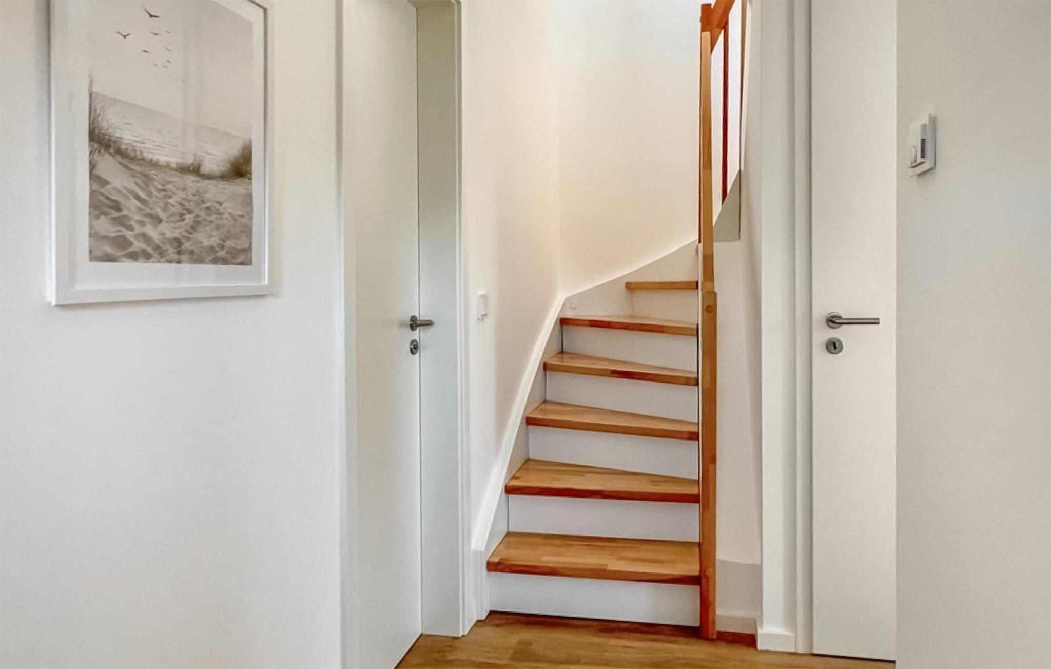 Vom Erdgeschoss gelangt man über eine geschwungene Treppe in das Obergeschoss des Doppelhauses, wo zwei geräumige Schlafzimmer auf Sie warten. Hier können Sie die schöne Nordseeluft von einem umlaufenden Balkon genießen, welcher von beiden Schlafzimmern aus zugänglich ist. Hochwertige Möbel und eine gelungene Raumaufteilung machen dieses Ferienhaus zu einem traumhaften Urlaubsdomizil.