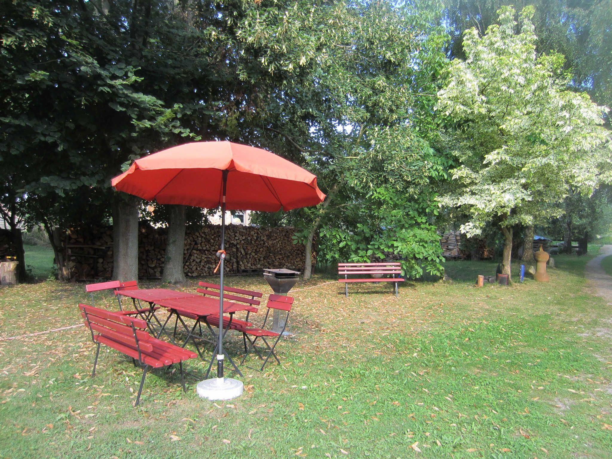 Im großen Hof stehen Bänke, Gartentische, Stühle, Sonnenschirm, Grill und Buddelkasten zur Verfügung. Im Garten gibt es einen Lagerfeuerplatz und genügend Holz. Auf dem Grundstück gibt es Schafe und Katzen. Frische Eier und Honig gibt es im Nachbardorf, Gartenkräuter, Salat aus dem Garten der Vermieterin.