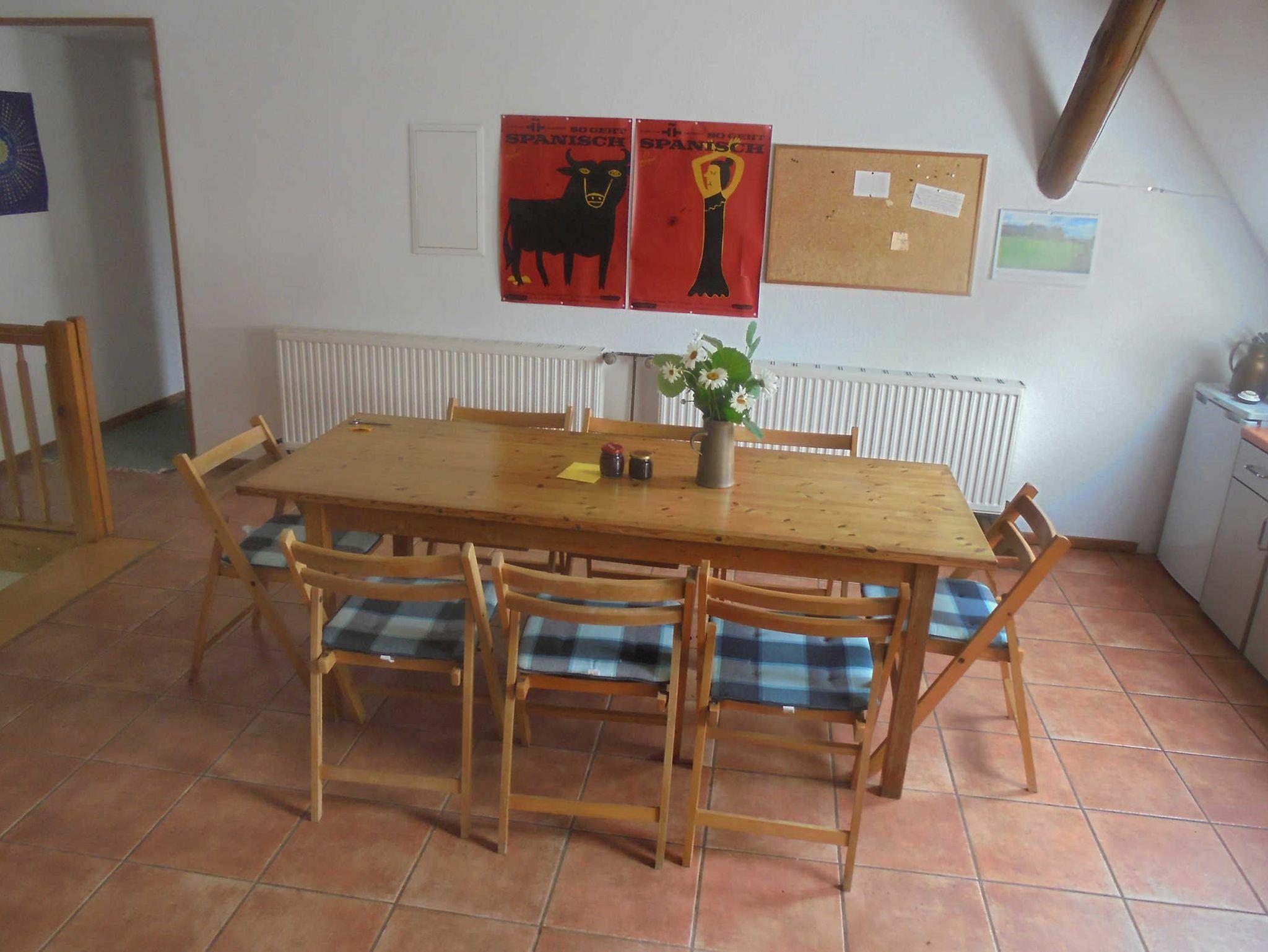 Die Ferienwohnung Bergfeld ist mit hellen Kiefernholzmöbeln eingerichtet. In den Zimmern liegt Dielenfußboden, in der bis in den Dachfirst ausgebauten Essdiele und in den Bädern ist gefließt. Die Ferienwohnung in Bergfeld kann mit bis zu 8 Personen gemietet werden.