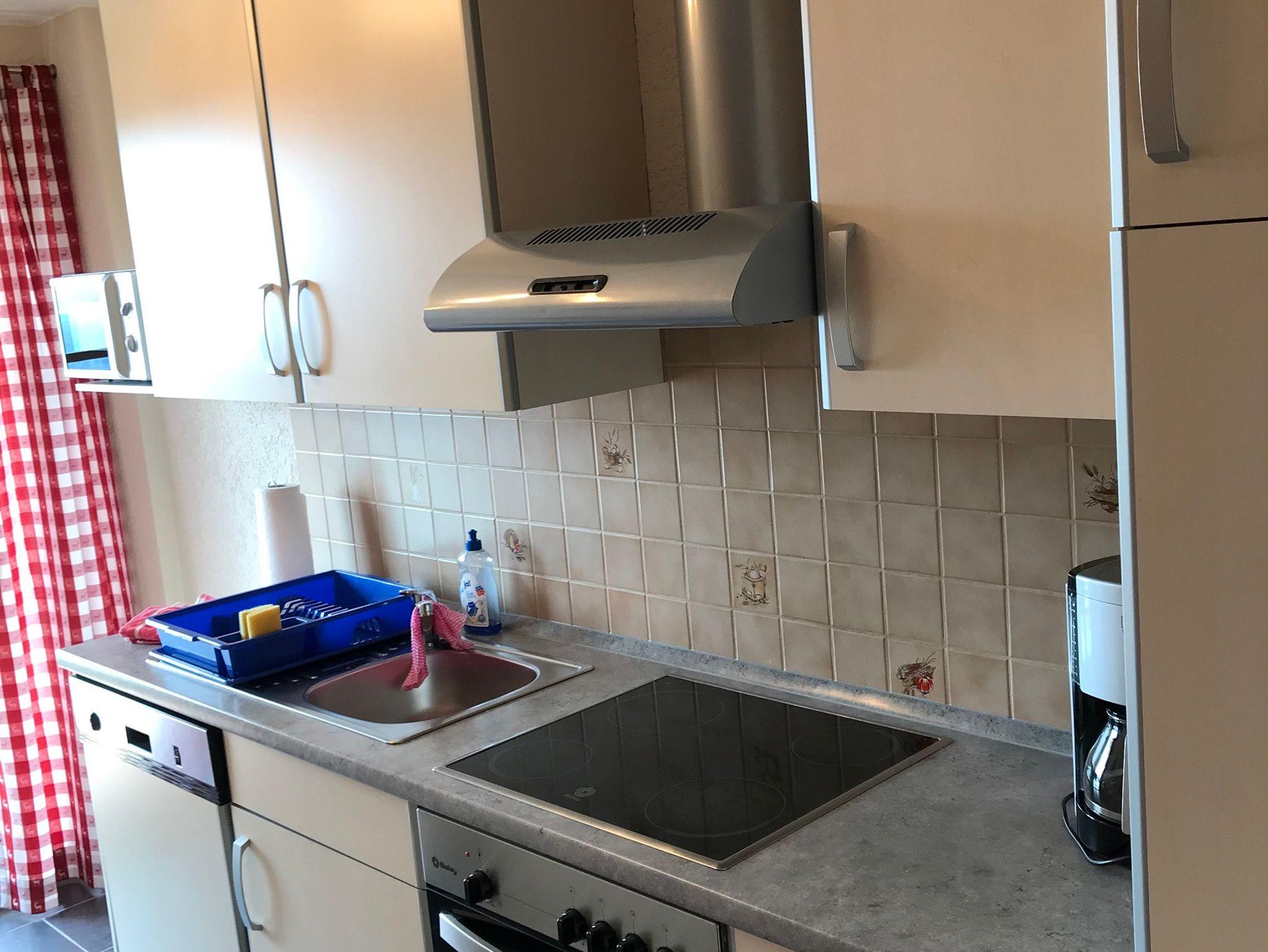 • Küche mit Kühlschrank, separatem Gefrierteil, 4-Platten-E-Herd mit Backofen, Spülmaschine