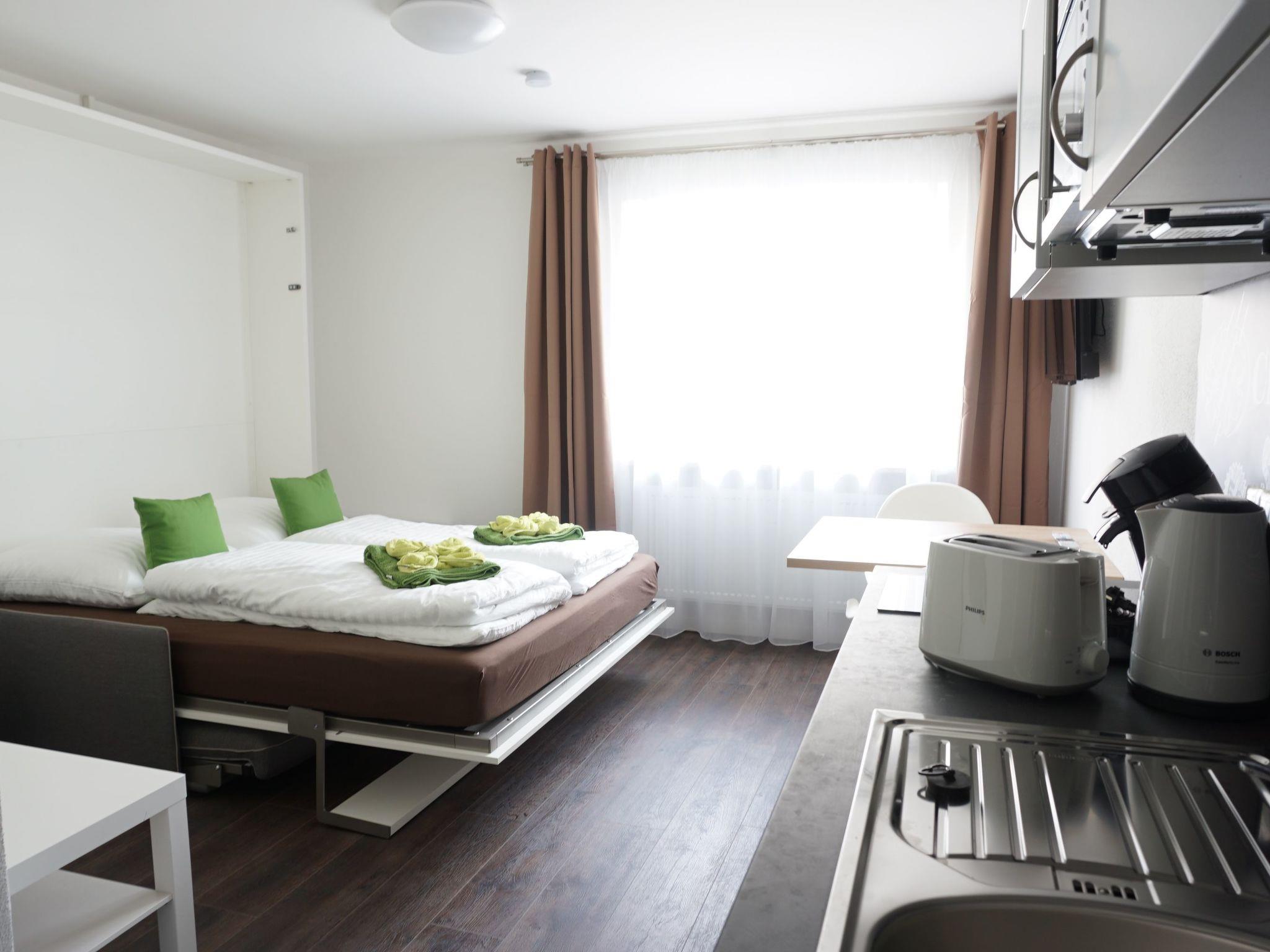 Our Tiny-Studio has a living/bedroom equipped with a folding bed 160x200 which makes room for a comfortable sofa during the day. The separate kitchenette with dining table for two makes you independent. The shower room is directly accessible from the living room/bedroom.