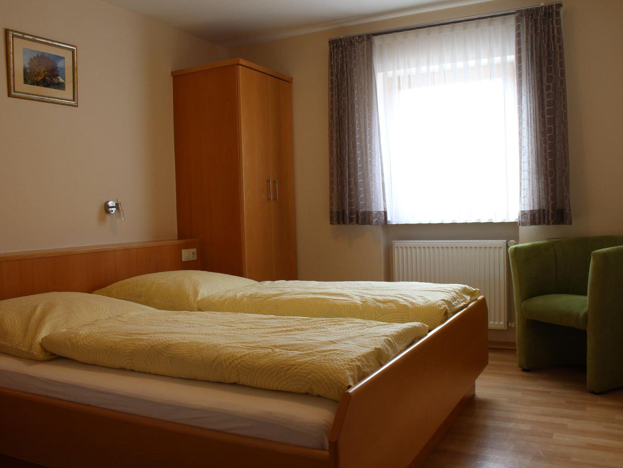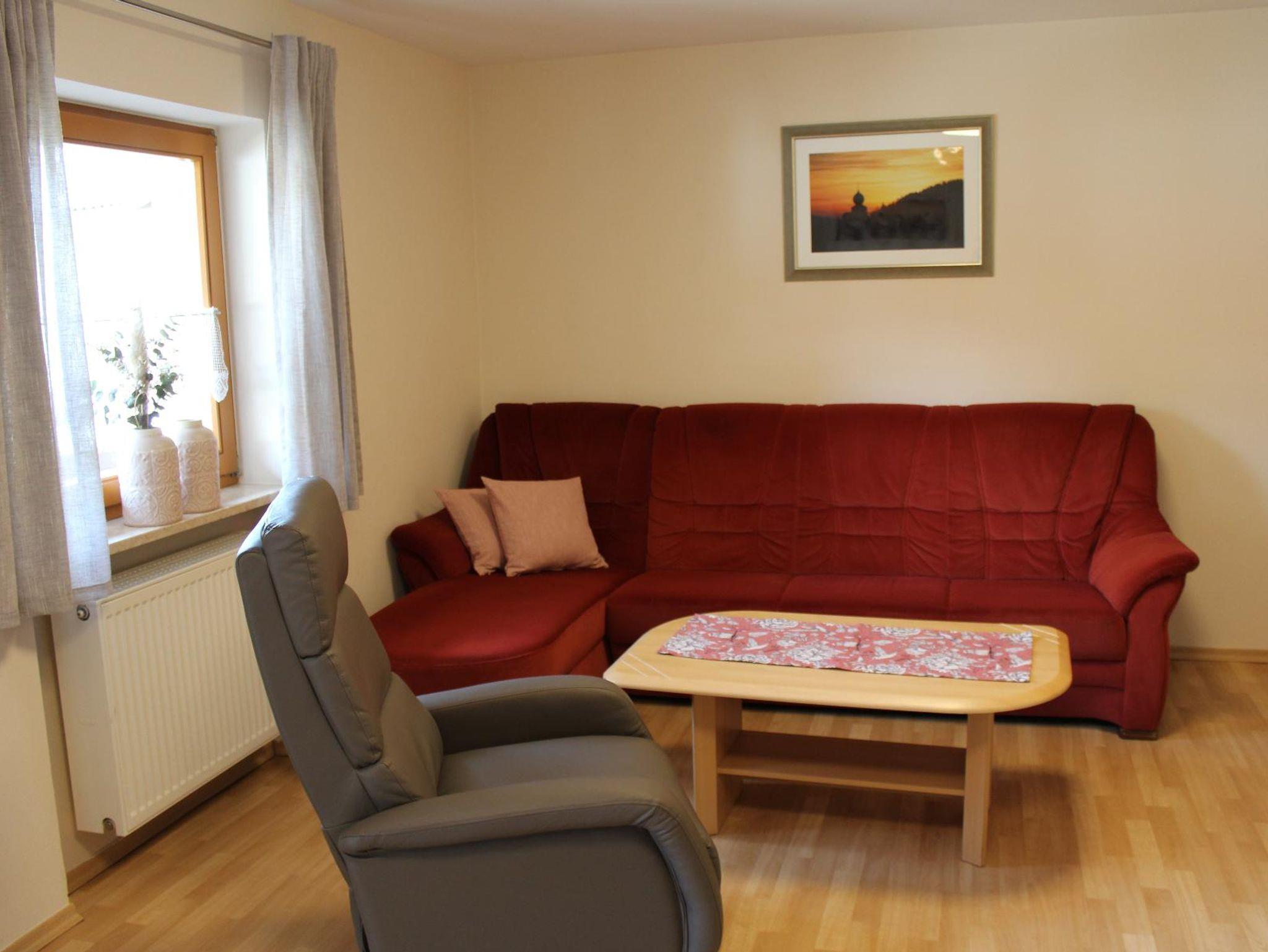 Die Ferienwohnung (60 qm) mit Balkon befindet sich im ersten Stock und hat einen separaten Eingang. Sie besteht aus einer Wohnküche, zwei Schlafräumen und einem Bad mit DU/WC.