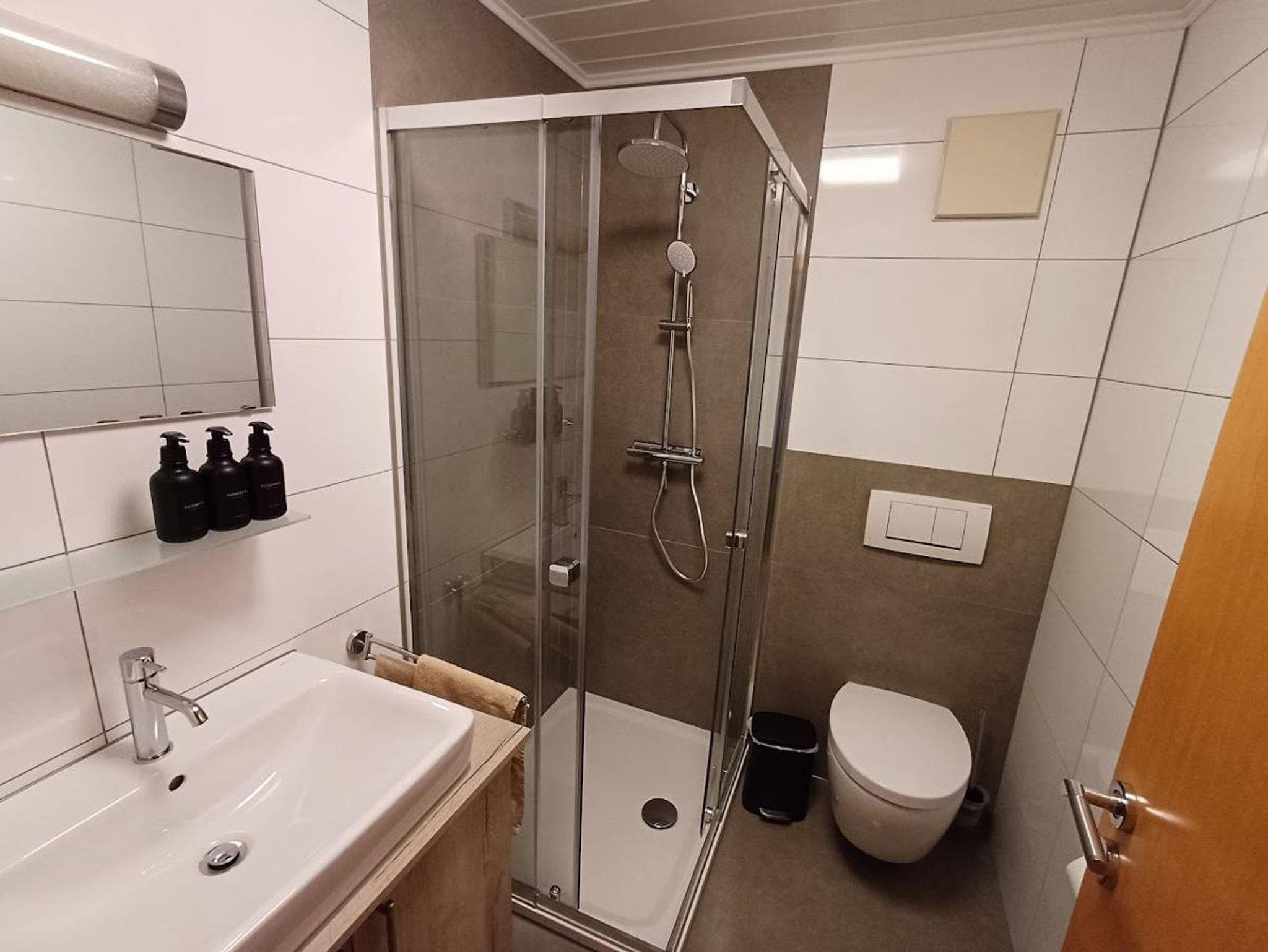 Im neu renovierten Bad mit Dusche/WC liegen je Gast ein Hand- und Duschtuch sowie Pflegeprodukte bereit.
