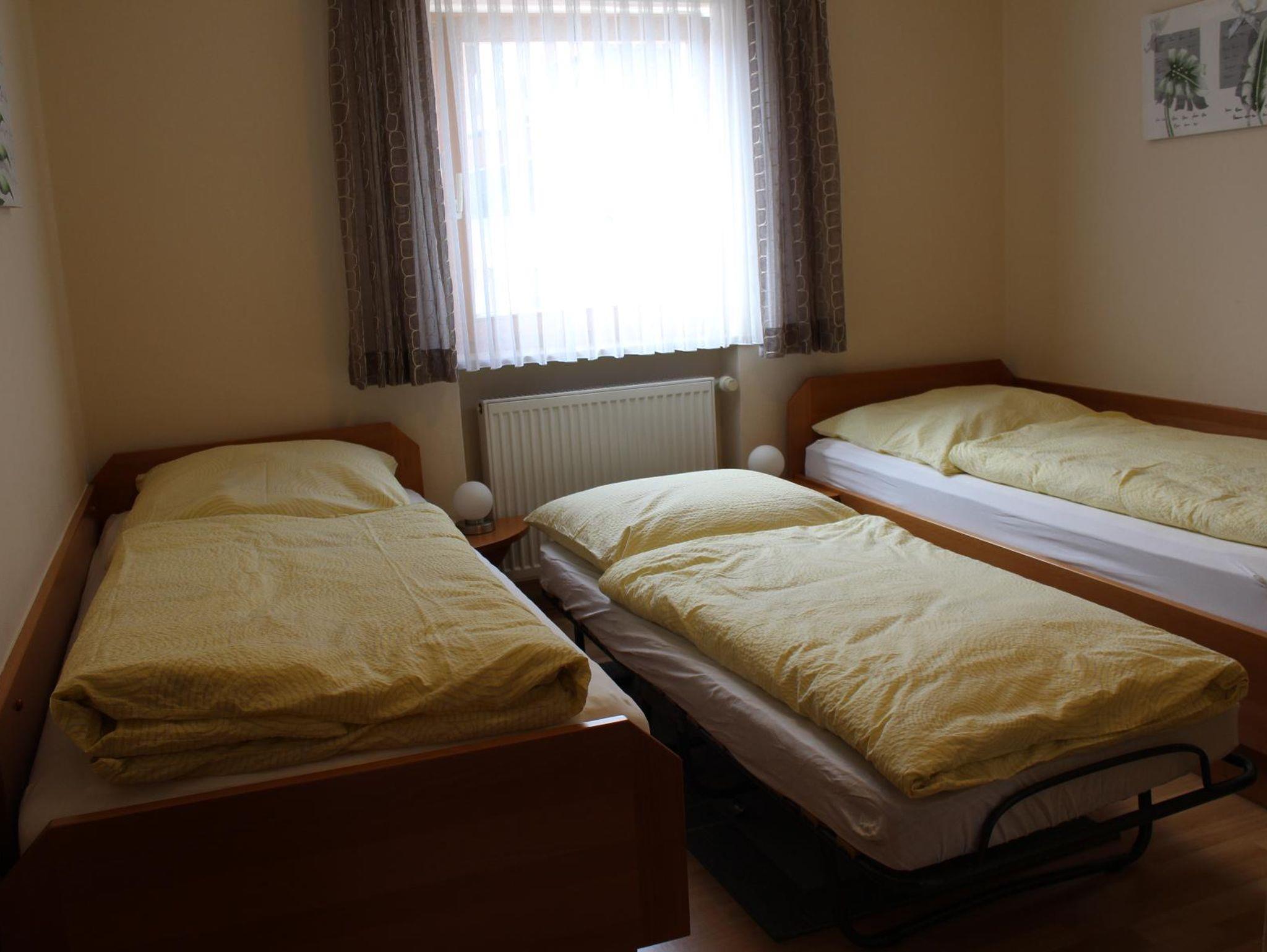 Ein Schlafraum verfügt über ein Doppelbett, der zweite über zwei Einzelbetten. Bei Buchung für fünf Personen wird im zweiten Schlafraum ein Klappbett hinzugestellt. Beide Schlafräume sind mit Rollläden ausgestattet.