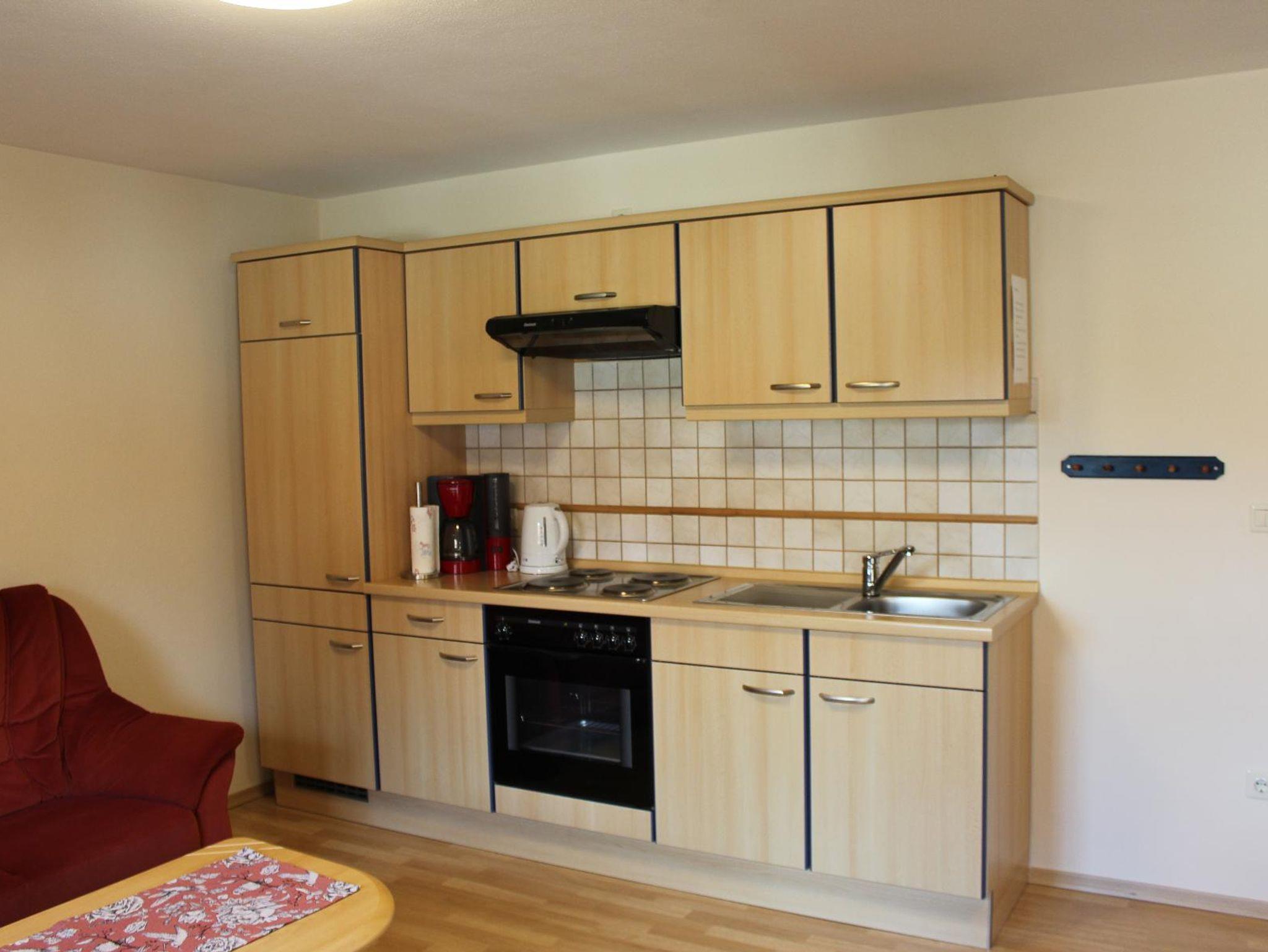In der Wohnküche erwartet Sie eine voll ausgestattete Küche (Kühlschrank, Kaffeemaschine, Wasserkocher, Toaster, Backofen und E-Herd mit vier Herdplatten). Außerdem liegen Geschirrtücher, Reinigungsmittel und Kaffee- und Teezubehör für Sie bereit. Des Weiteren ist der Raum mit einer Sitzgruppe, Coach, Sessel und Fernseher ausgestattet.