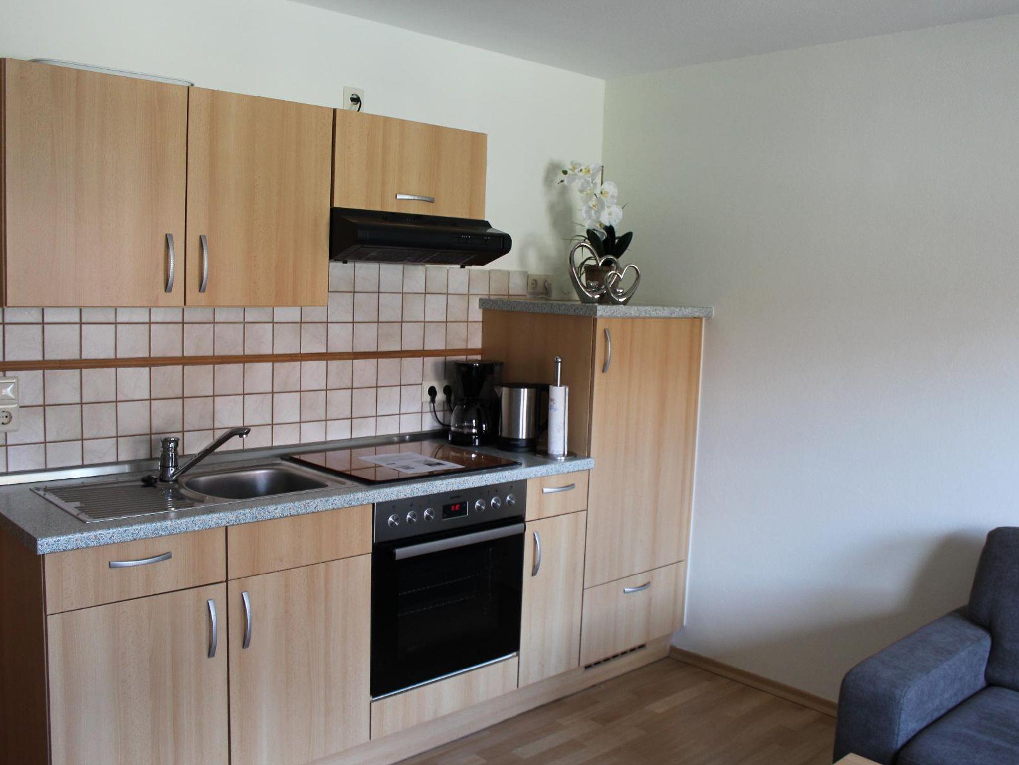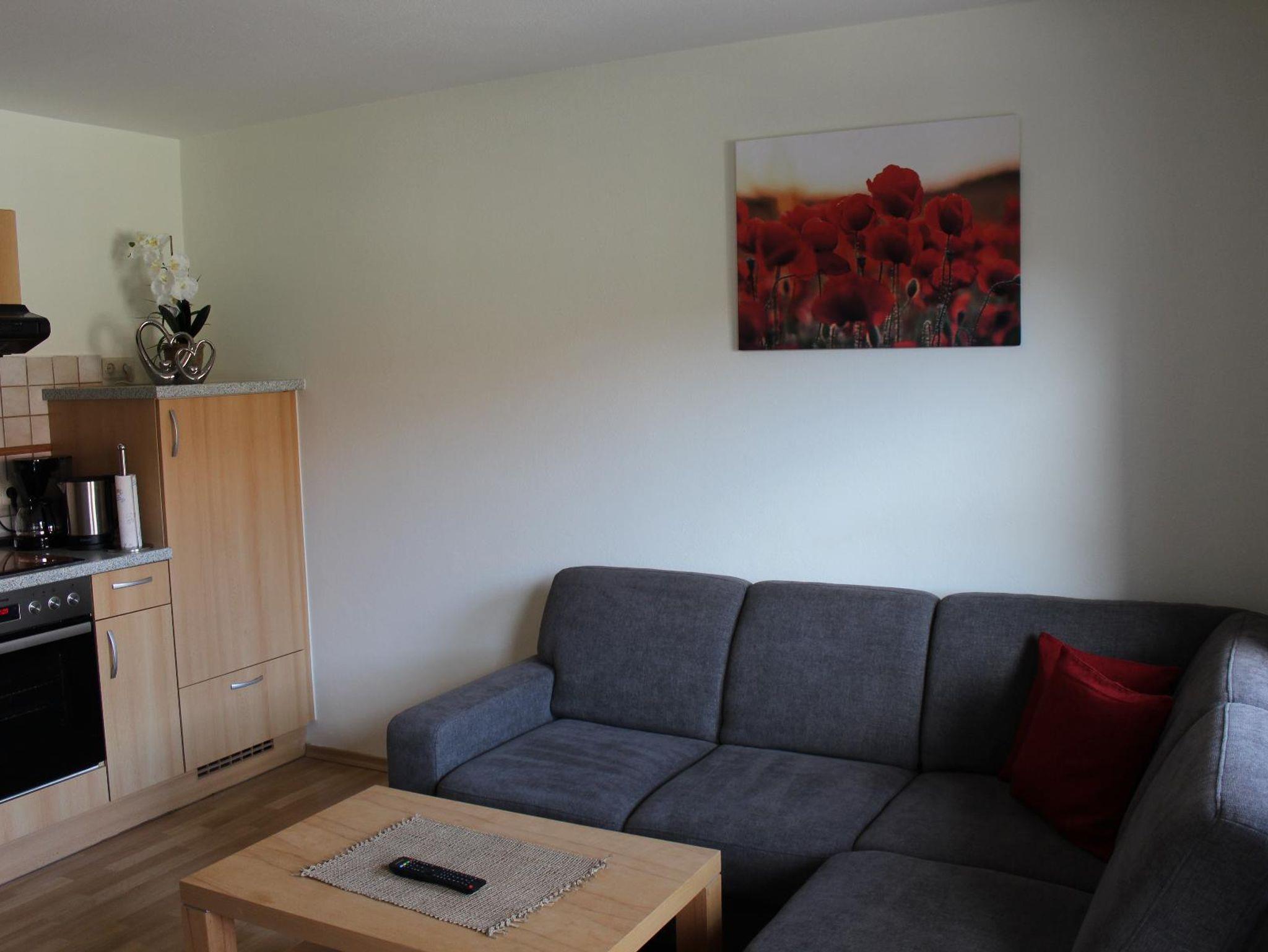 In der Wohnküche erwartet Sie eine voll ausgestattete Küche (Kühlschrank, Kaffeemaschine, Wasserkocher, Toaster, Backofen und E-Herd mit vier Herdplatten). Außerdem liegen Geschirrtücher, Reinigungsmittel und Kaffee- und Teezubehör für Sie bereit. Des Weiteren ist der Raum mit einer Sitzgruppe, Coach, und Fernseher ausgestattet.