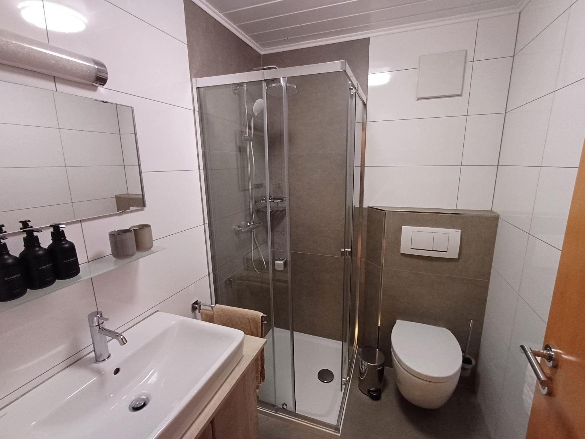 Im neu renovierten Bad mit Dusche/WC liegen je Gast ein Hand- und Duschtuch sowie Pflegeprodukte bereit.