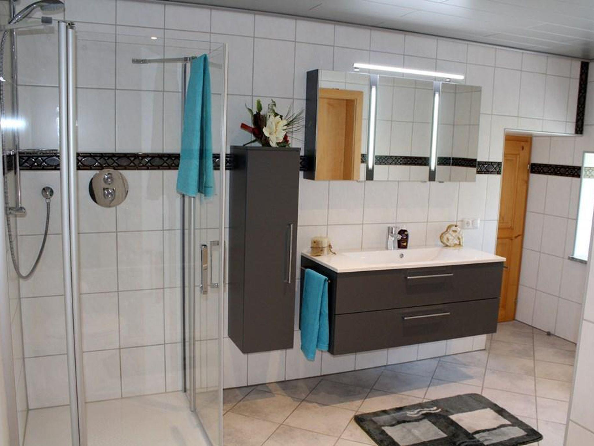 • Bad mit ebenerdiger Dusche, Badewanne, WC und Föhn incl. Handtücher und Toilettenpapier