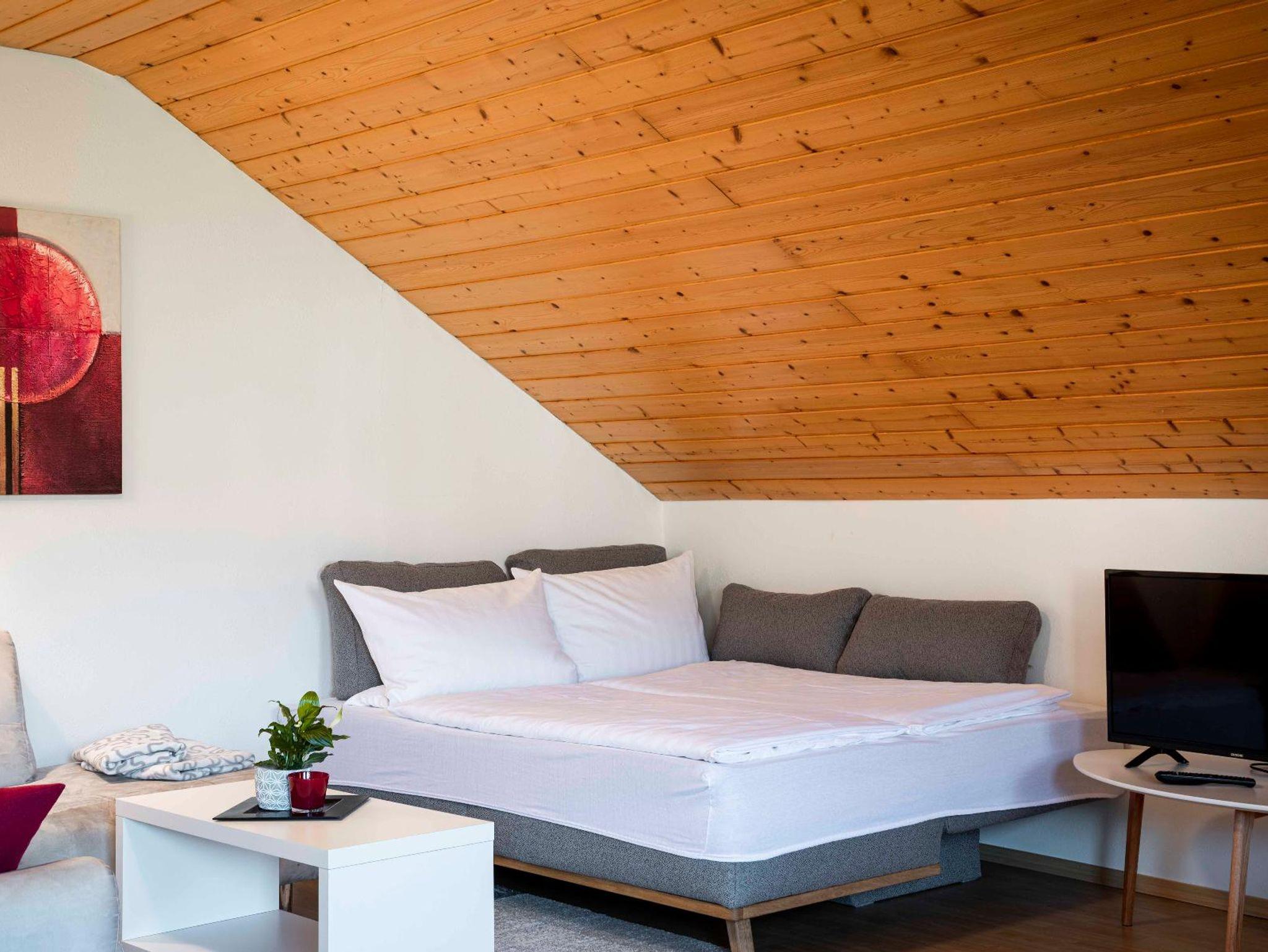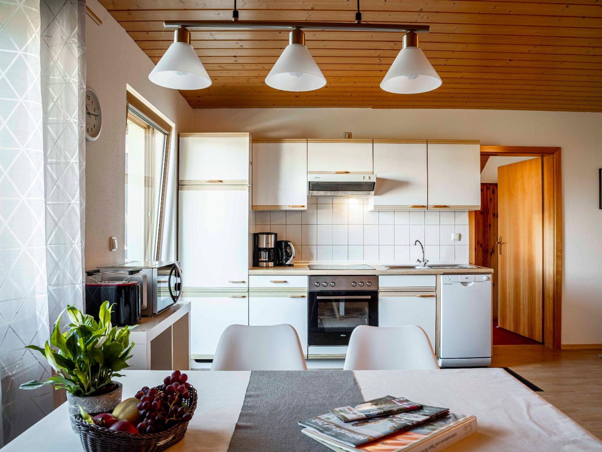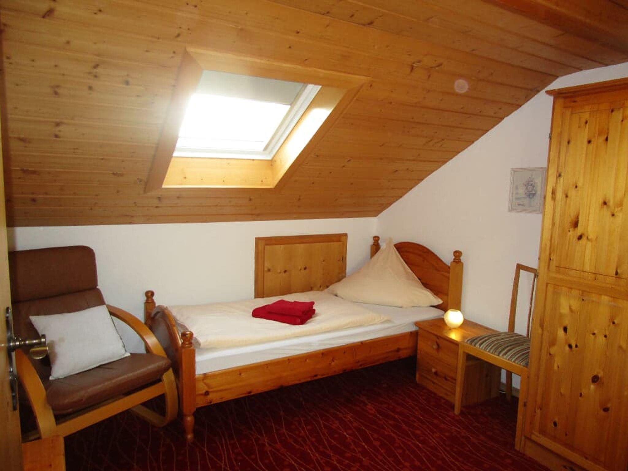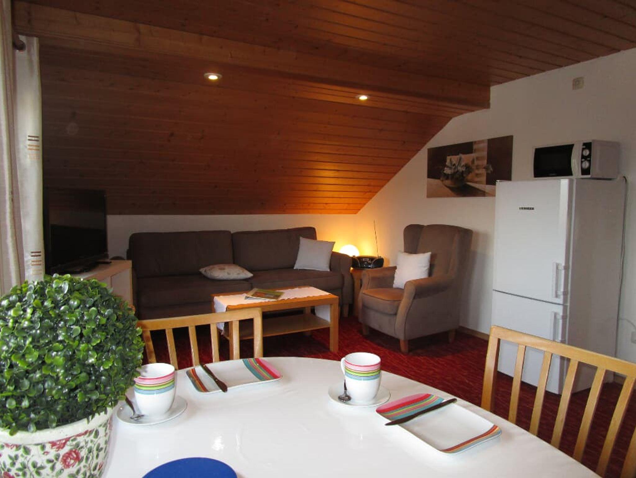 Im Dachgeschoß, mit Blick zum Obstgarten, befindet sich die großzügige Ferienwohnung für 4 Personen. Modern und doch gemütlich, so lädt die gerade neu renovierte Ferienwohnung zum Wohlfühlen und Erholen ein. Die Wohnung besteht aus 1 Doppel-Schlafzimmer, sehr großem Wohnbereich mit einer zusätzlichen gemütlichen Schlafcouch,r, gemütlicher Couchgarnitur, SAT-TV, W-LAN, Radio, Essecke und Küchenzeile mit Spülmaschine, Mikrowelle, Kaffeemaschine, Wasserkocher, Toaster, großem Balkon und Dusche/WC. Auf Wunsch - Brötchenservice! In der Wohnung bitte nicht rauchen!