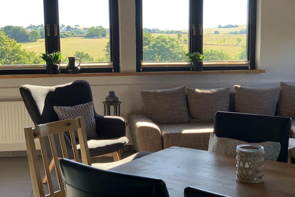 Die Wohnung verfügt über 5 Schlafplätze, ein Bad mit Dusche (im Dezember 2023 komplett saniert) und eine vollausgestattete Küche, eine Terasse, kostenfreies Wlan, Smart-TVs mit Satellitenfernsehen, 5.1 Heimkinoanlage, Spielekonsole, Gasheizung und einen Kaminofen mit kostenfreiem Brennholz für gemütliche Abende vorm wärmenden Kaminfeuer. Das Grundstück ist weitläufig, komplett eingezäunt und von außen nicht einzusehen. Zum Haus gehört ein großer, romantisch angelegter Garten, in dem Sie herrliche Grillabende verbringen oder einfach nur Sonne tanken und die Seele baumeln lassen können. Für unsere kleinen Gäste gibts einen Spielplatz mit Sandkasten, Rutsche und Schaukel direkt beim Haus. Genießen Sie also eine ungestörte, ruhige Zeit. Das Haus ist aufgeteilt in zwei Wohnungen mit separaten Eingängen und separat liegenden Terrassen im riesigen Garten. Dieses Insersat bezieht sich auf die Wohnung im oberen Stockwerk (Wohnung A)