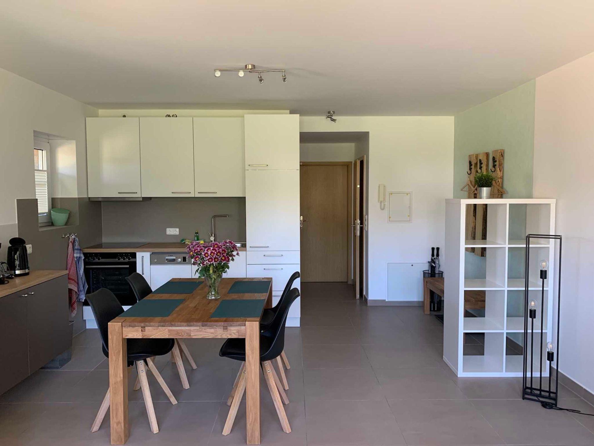Die 2-Zimmer Appartements (49 m²) für Paare oder Familien befinden sich im EG und bieten einen direkten Zugang zum Garten. Sie verfügen über ein Schlafzimmer mit Boxspringbett, einen großen Wohnraum mit Couchgarnitur (Schlafsofa), eine integrierte Einbauküche mit Essbereich, ein Duschbad und eine möblierte Terrasse. Die voll ausgestattete Küche ist in den Wohnraum integriert. Von hier haben Sie direkten Zugang zur Sonnenterrasse mit Gartenmöbeln und traumhaften Blick in die Natur.