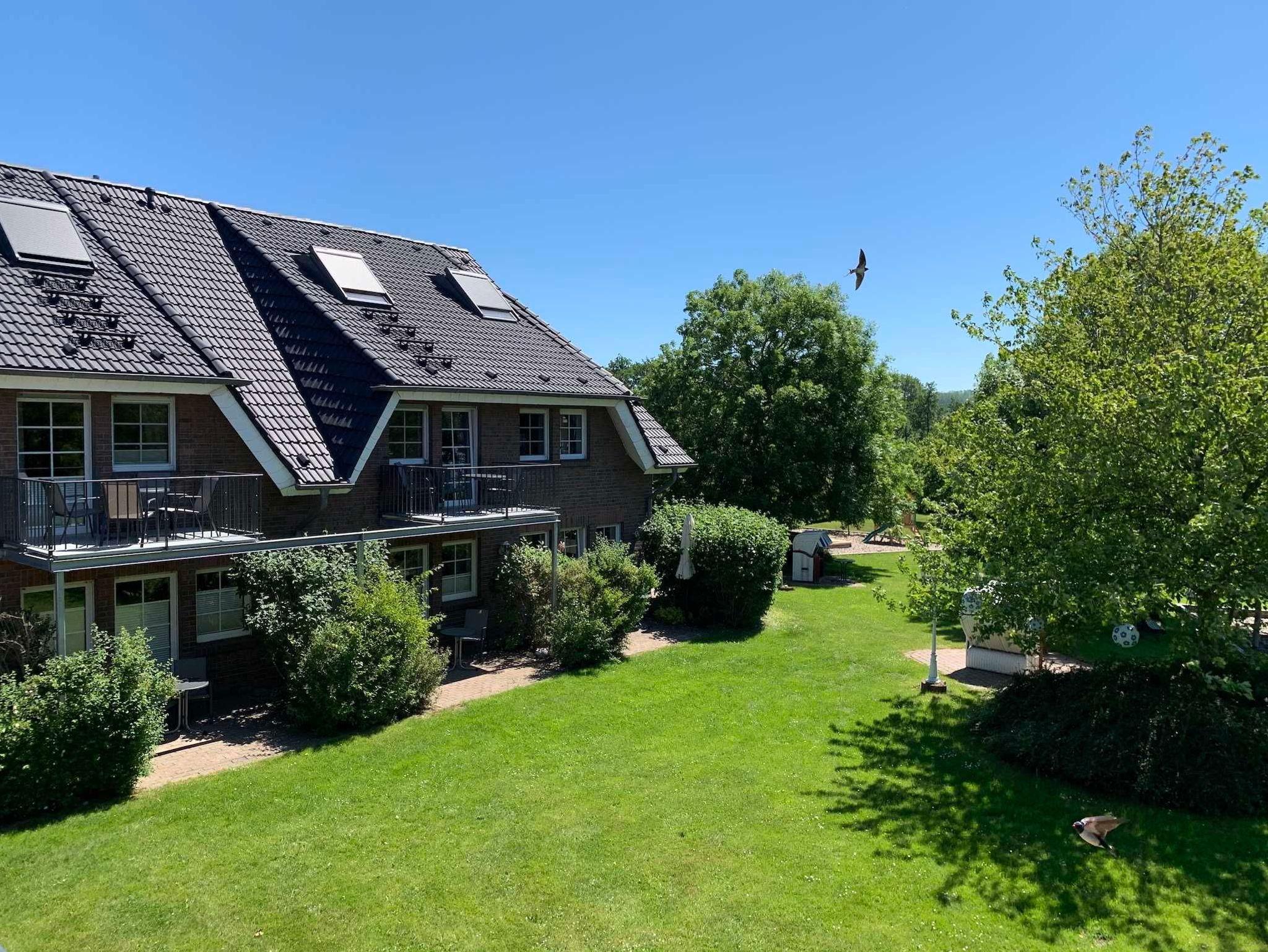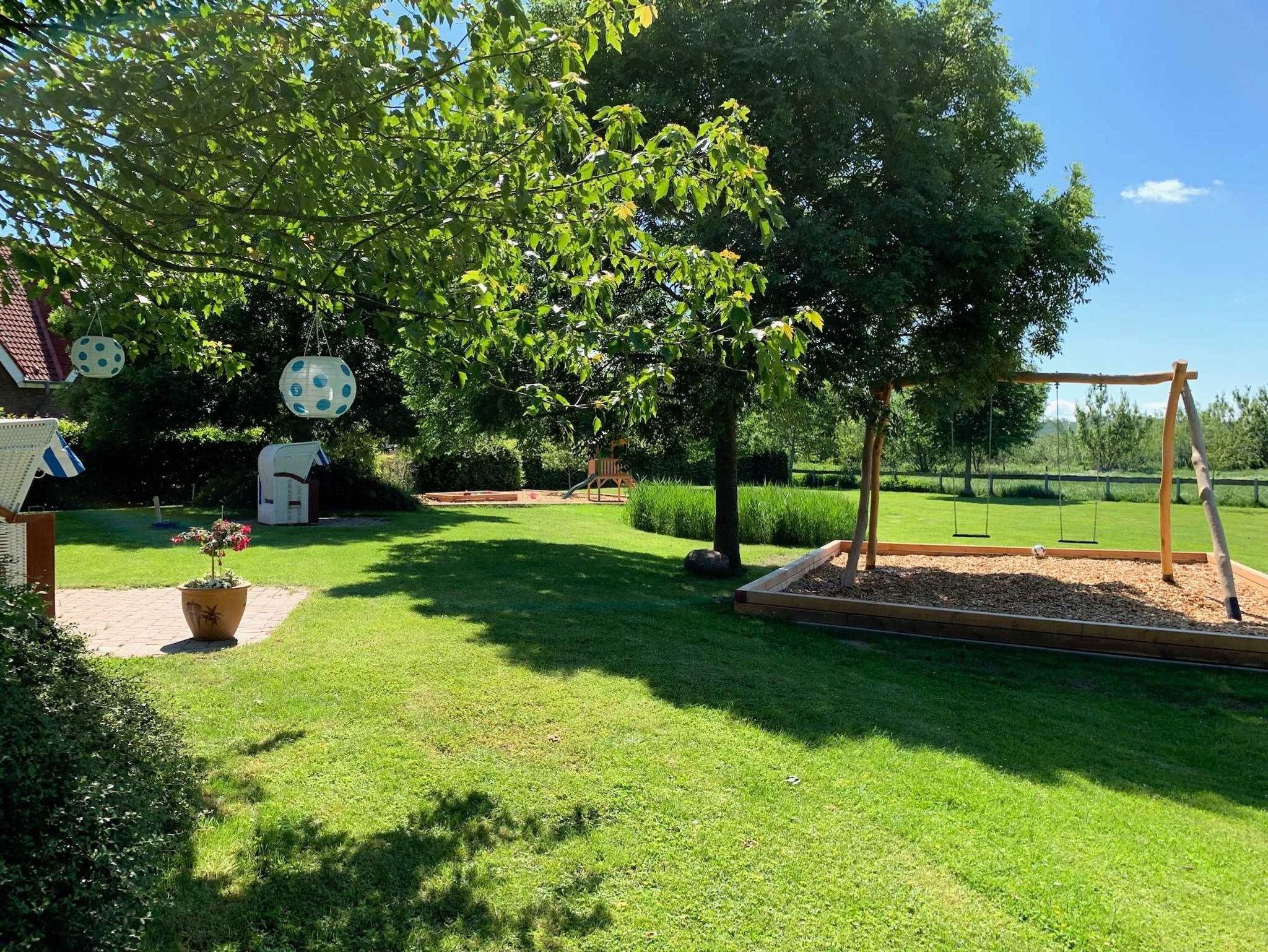 Die große Gartenanlage fügt sich harmonisch in die Landschaft ein und bietet viel Platz zum Erholen, Entspannen und Spielen. Im Garten befinden sich Terrassen mit Sitzgruppen, Strandkörbe, eine Liegewiese, Liegestühle und Sonnenschirme. Außerdem gibt es einen Grillplatz und einen Kinderspielplatz.
