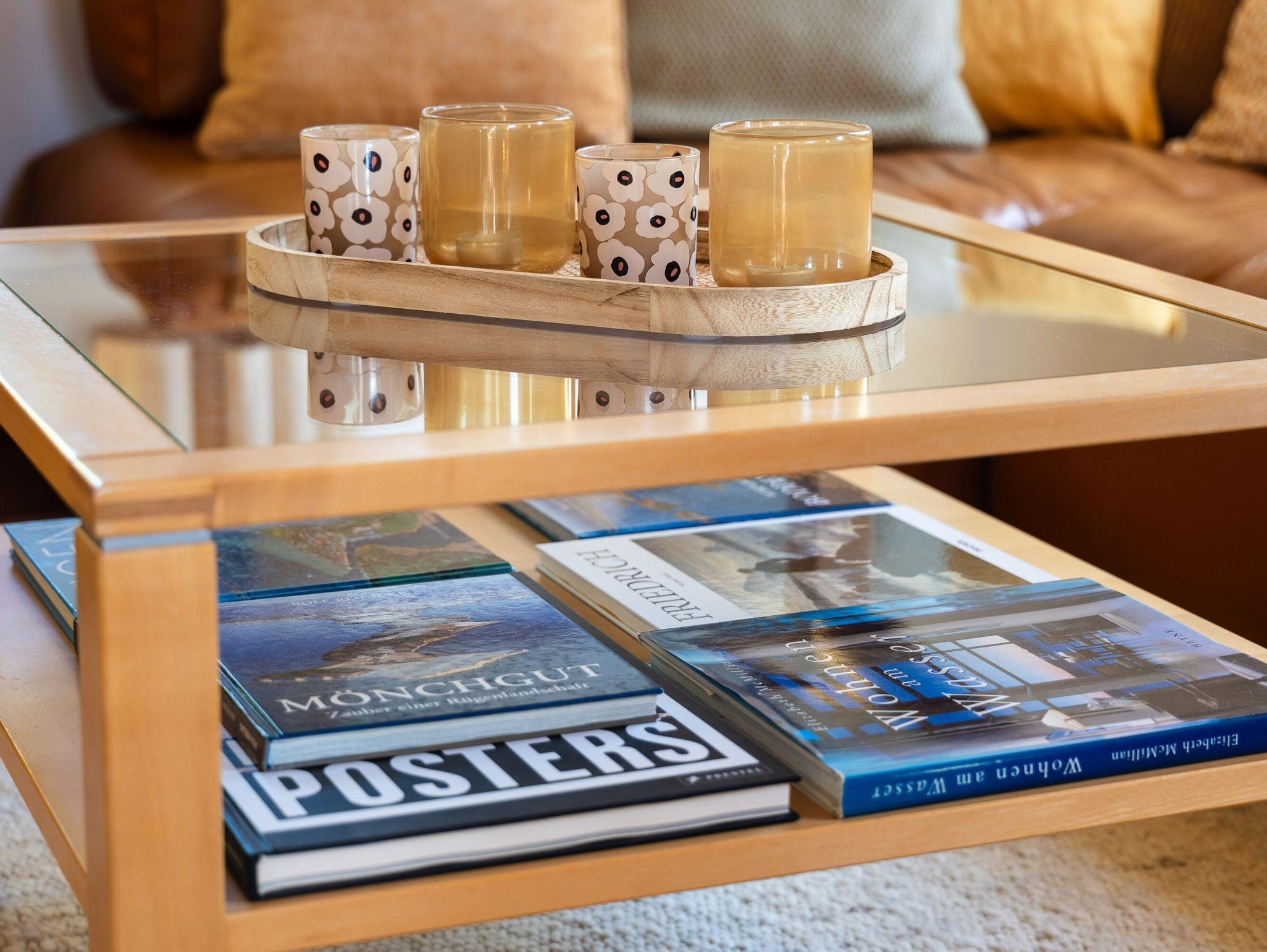 Im Erdgeschoss gibt es außerdem einen Flur mit Garderobe, eine Konsole mit großem Spiegel, ein Duschbad/WC, ein ausziehbares Schlafsofa (1,40 x 2,00m) und einen Hauswirtschaftsraum mit kostenfrei nutzbarer Waschmaschine nebst Bügel- und Reinigungsgeräten.