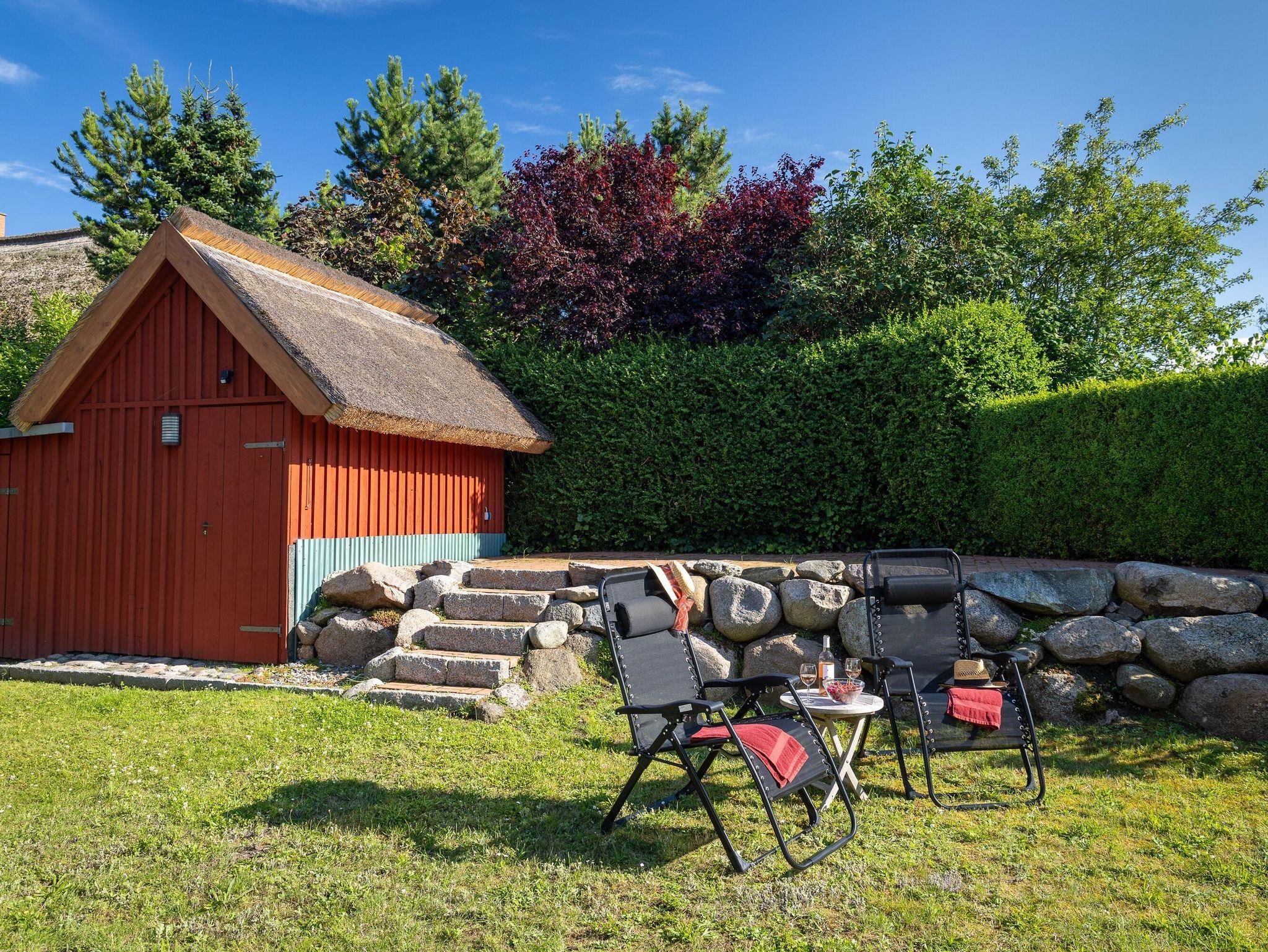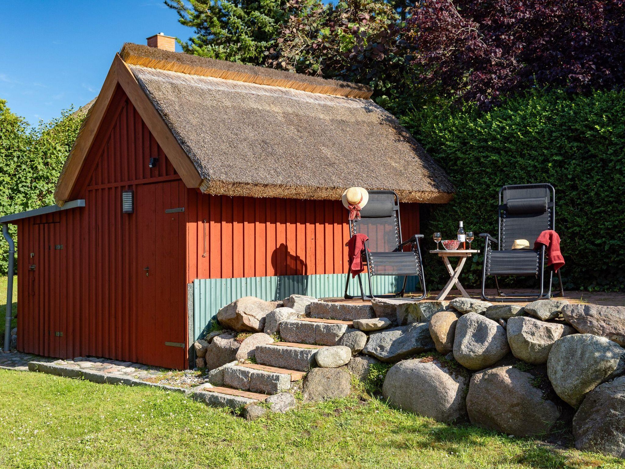 Auf dem gepflegten Gartengrundstück gibt es ein kostenfrei nutzbares Saunahäuschen und eine weitere, etwas erhöht liegende Terrasse. Von hier aus genießen Sie aus der bequemen XXL-Sitzgruppe einen wunderbaren Blick in die umgebende Landschaft und bis hinüber zum Jagdschloss Granitz.