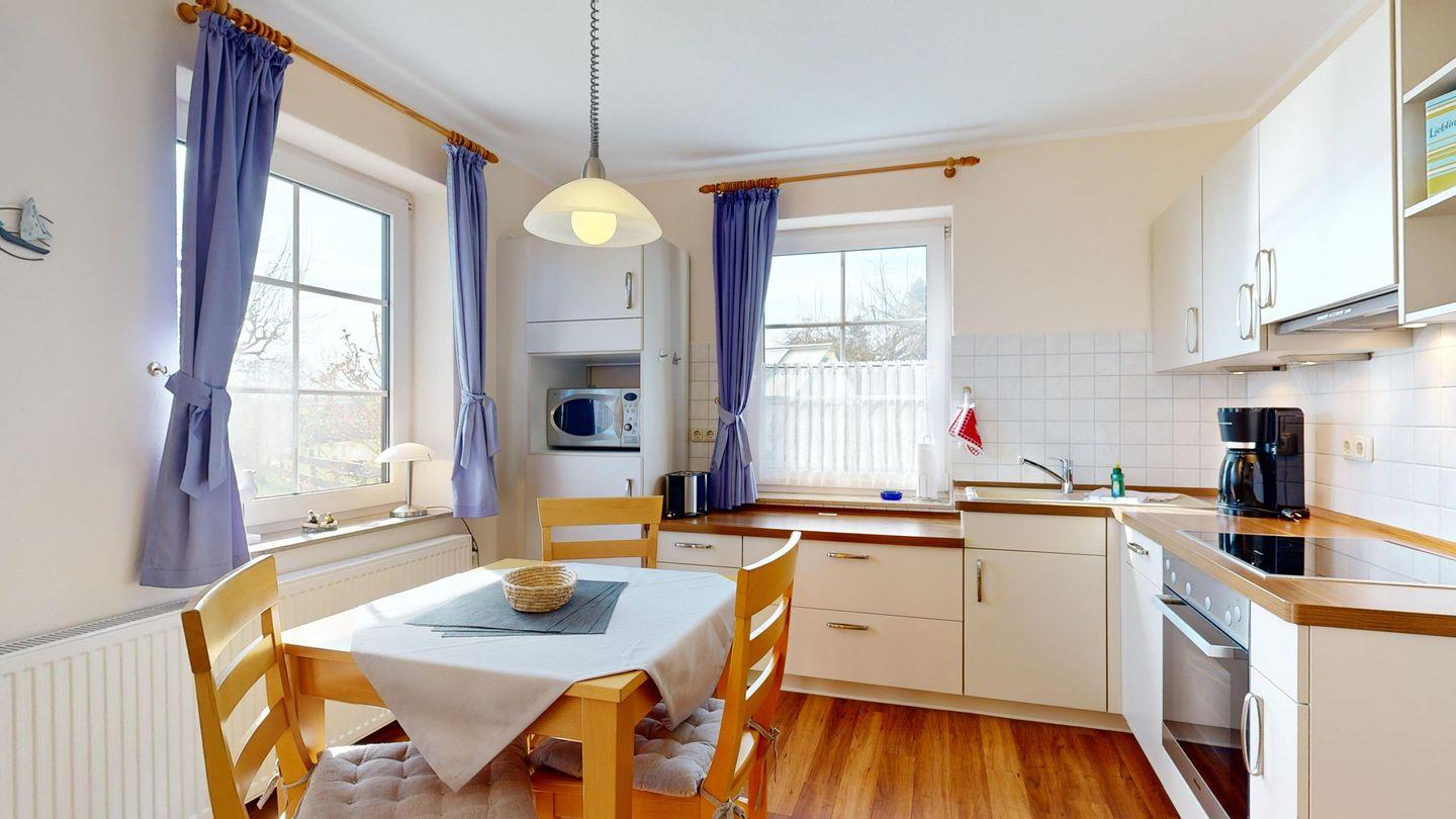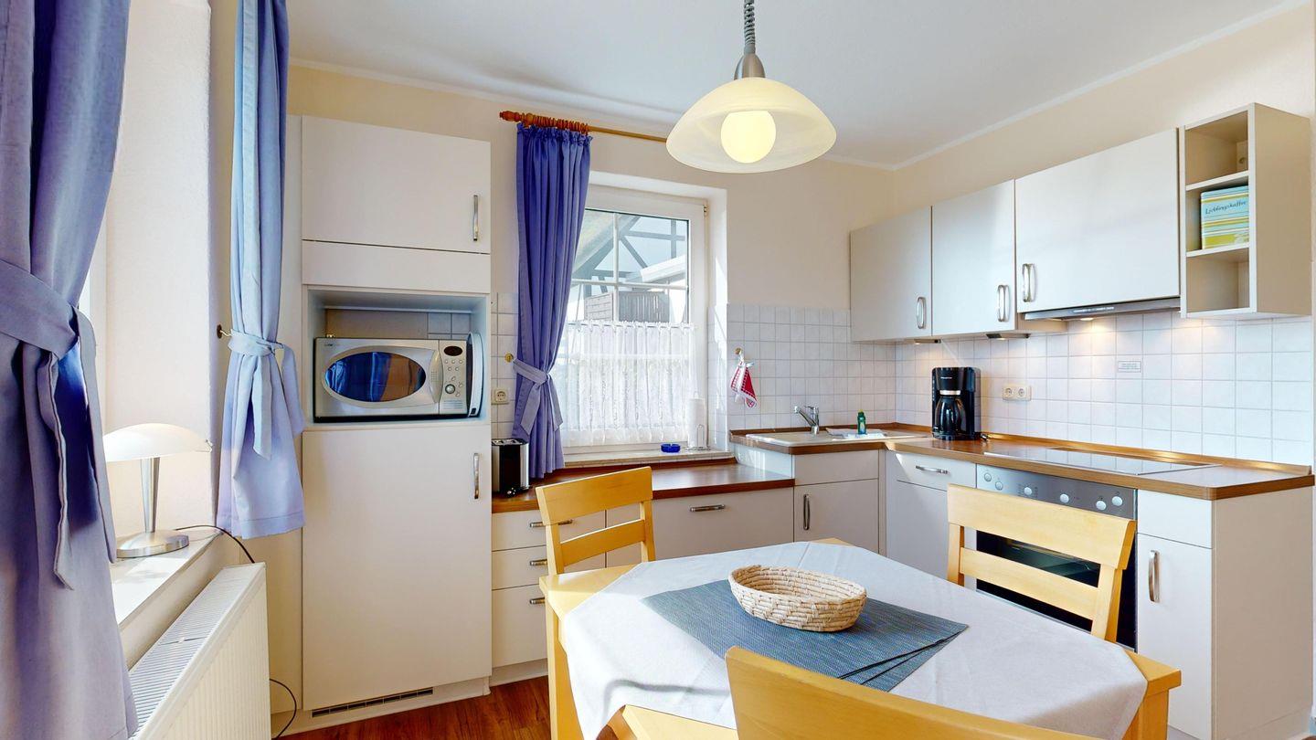* Küche: Moderne Küchenzeile mit Spülmaschine, Ceranherd mit Backofen, Mikrowelle, Essplatz, Kaffeemaschine, Toaster und Wasserkocher