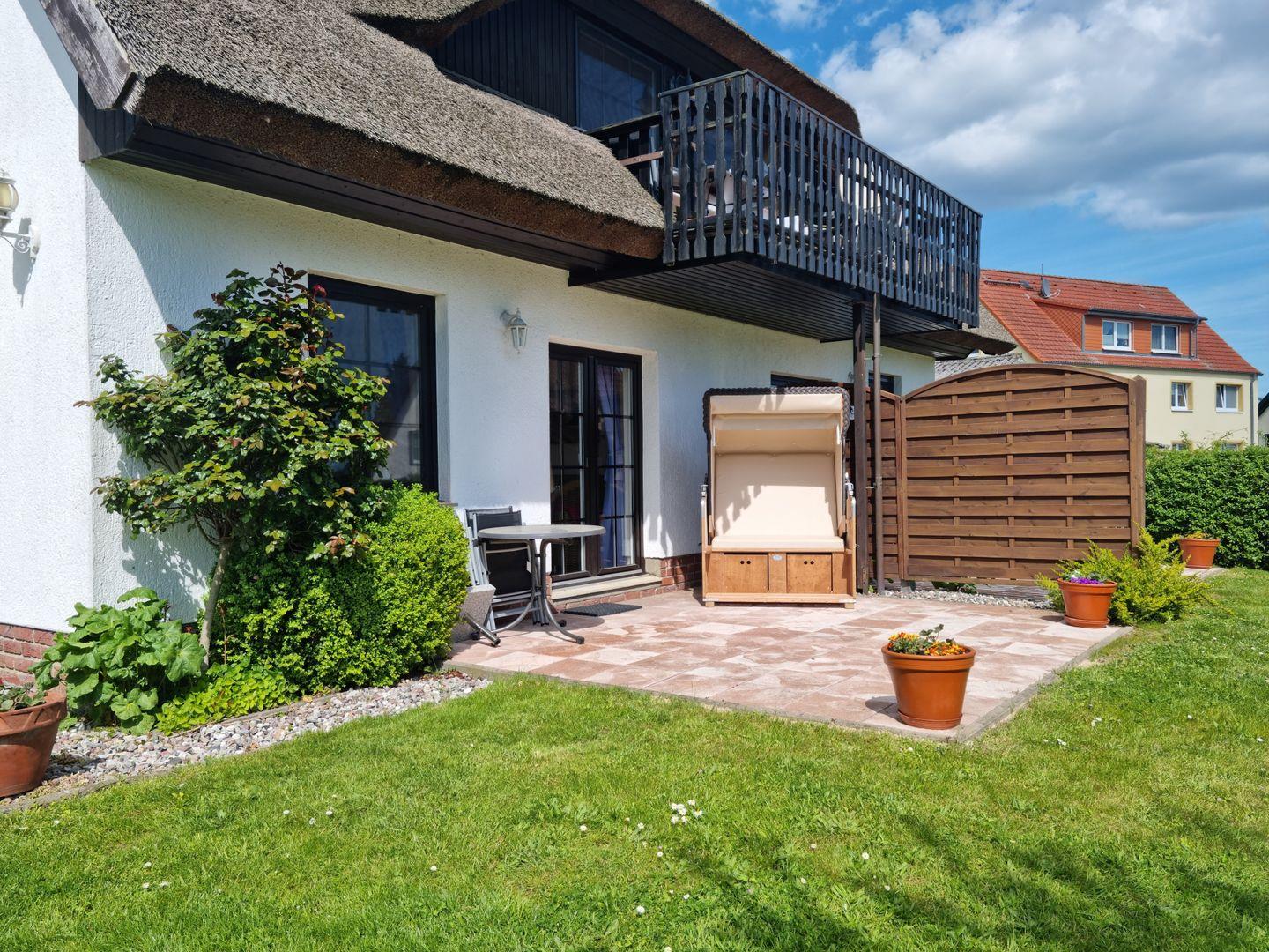 * Terrasse mit Strandkorb und Gartenmöbeln