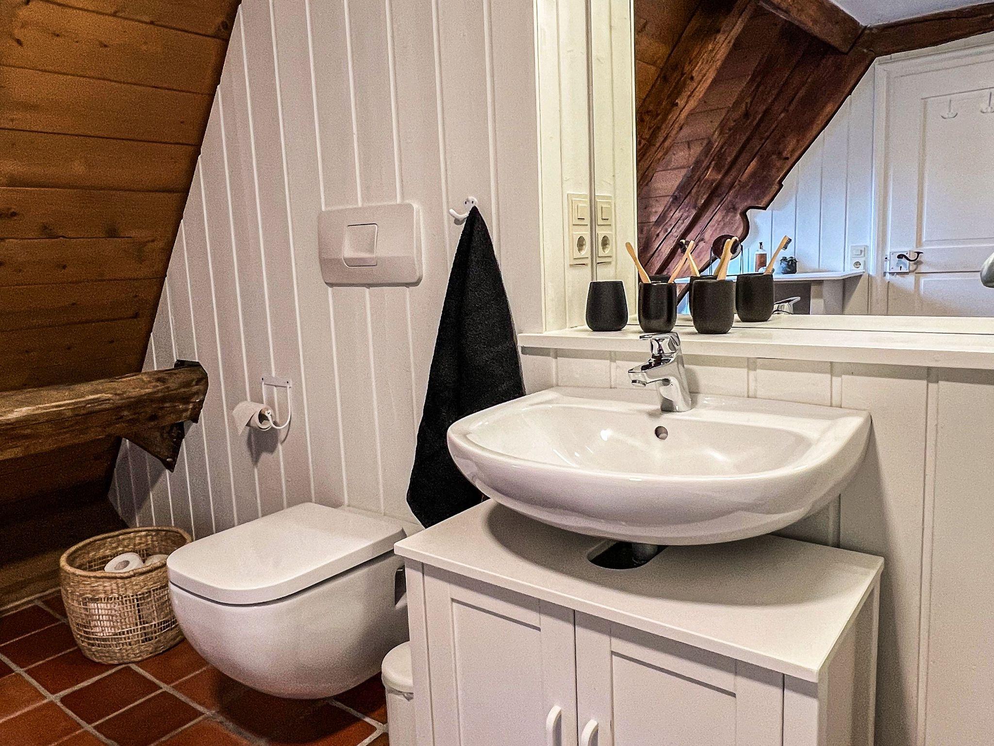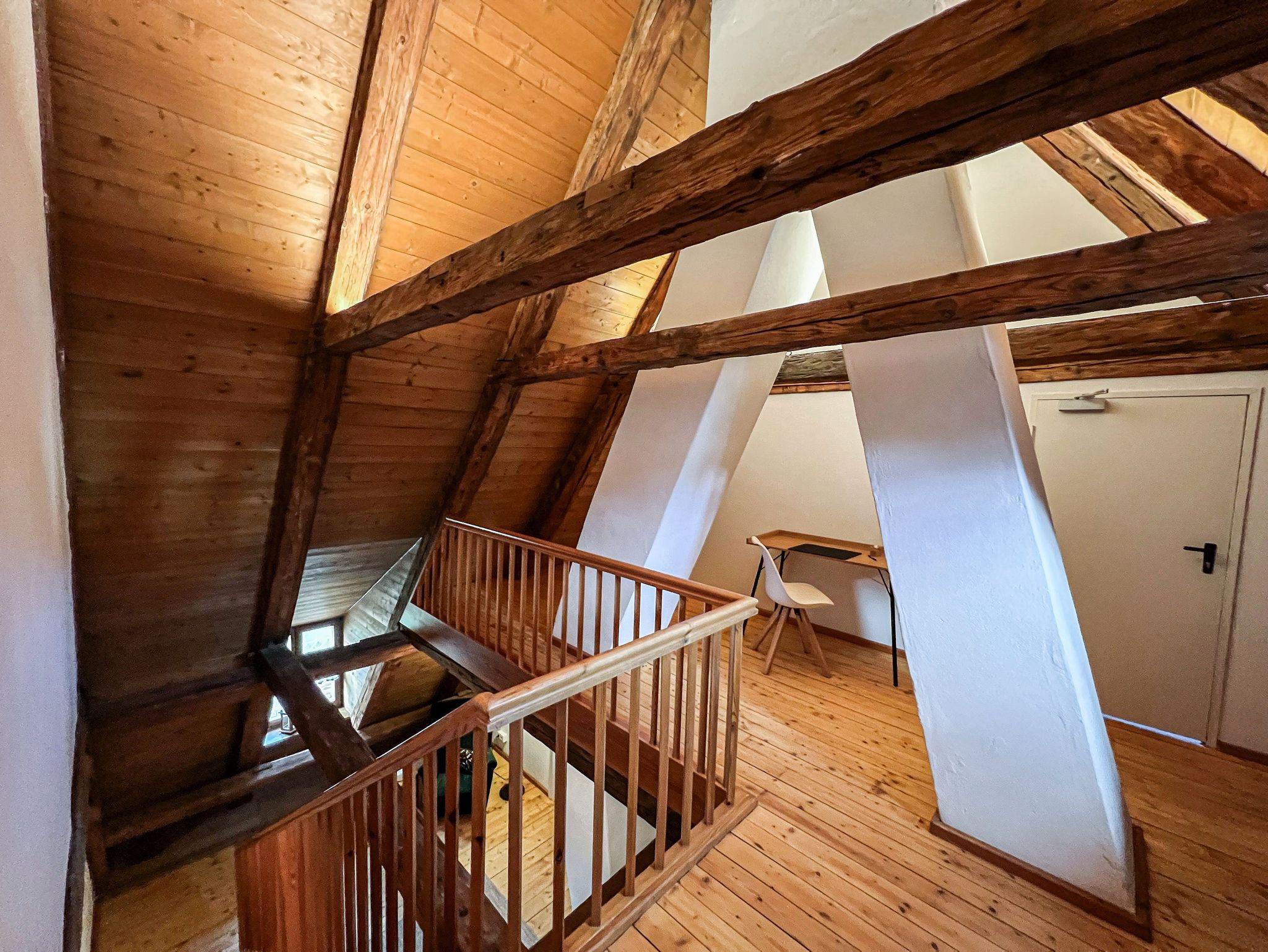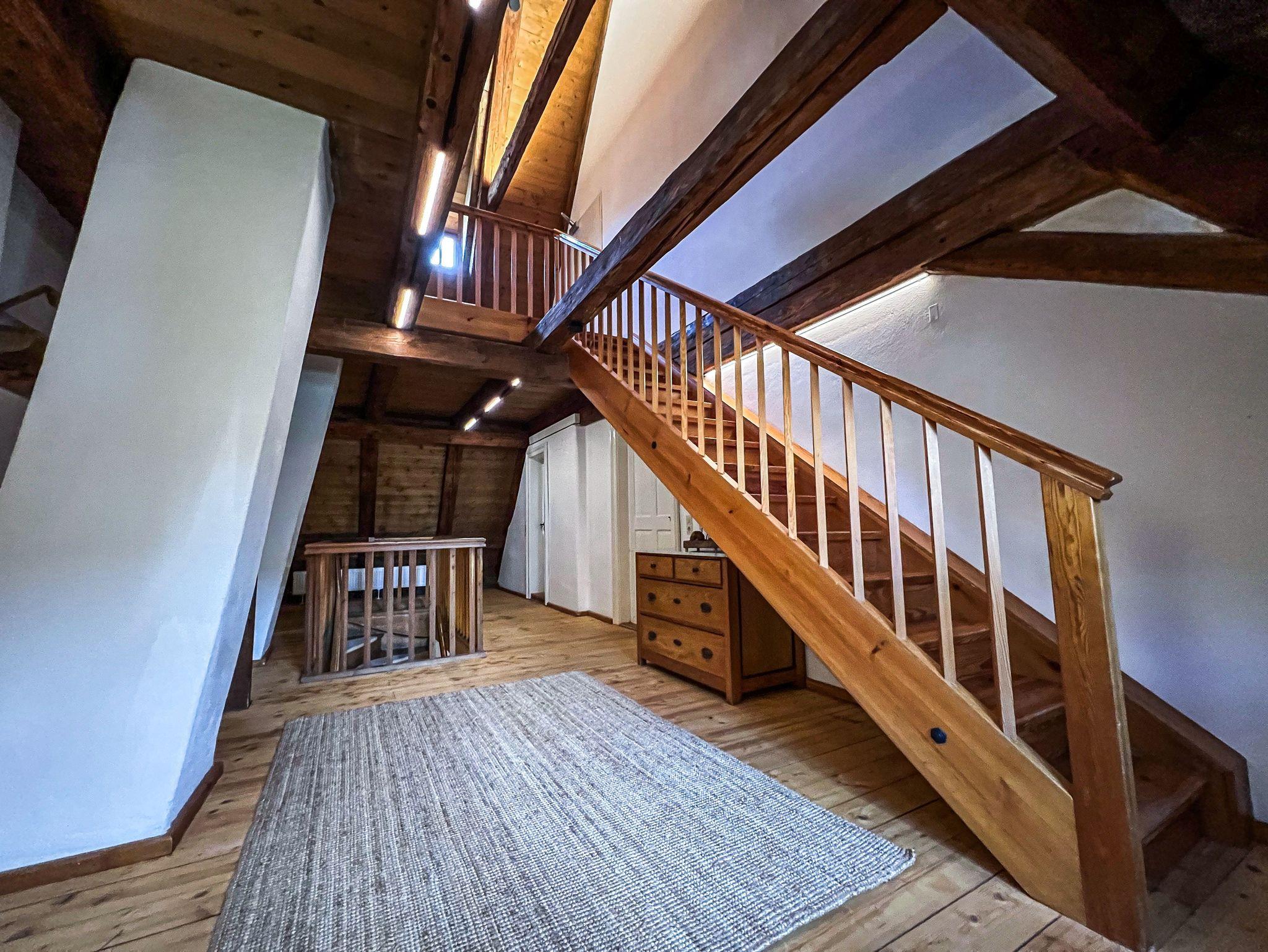 Der Eingang zur Unterkunft befindet sich im Erdgeschoss. Die Wohnung selbst erstreckt sich über Ober- und Dachgeschoss.