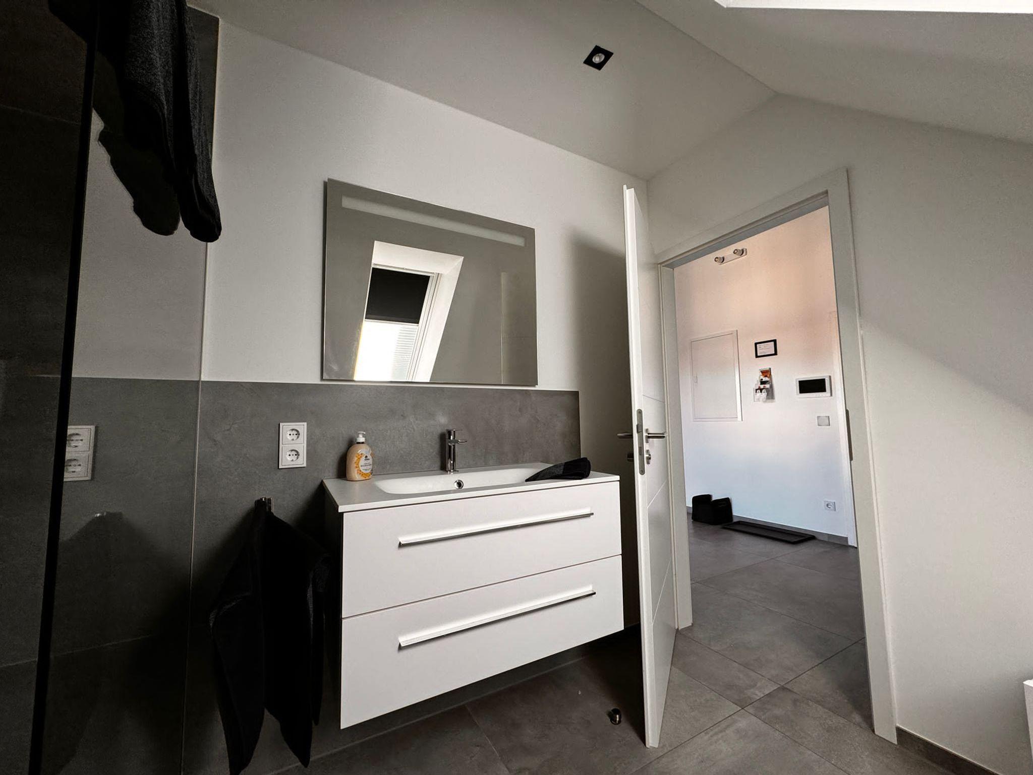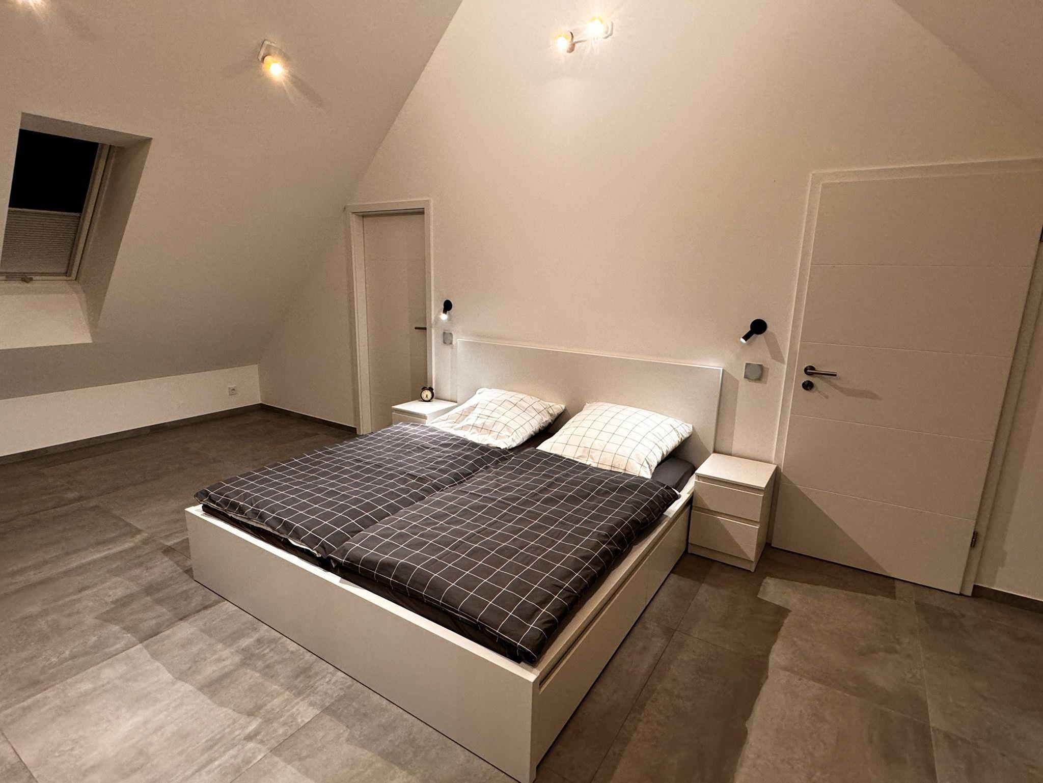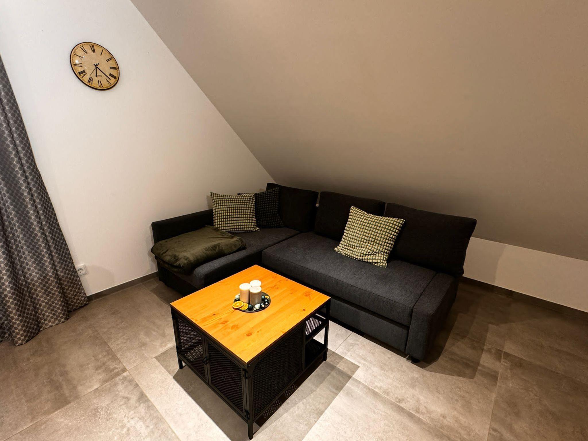 Die moderne Ferienwohnung im 2. Stock eines Zweifamilienhauses ist durchgehend mit Fliesen und Fußbodenheizung ausgestattet. Zur Verfügung stehen ein 1.80 x 2.00m großes Doppelbett, sowie eine Couch mit Ausziehfunktion. In der Fernsehecke können Sie es sich bei einem spannenden Krimi oder einer unterhaltsamen Fernsehshow über Satelliten ? TV gemütlich machen. Eine kleine Auswahl an Büchern und Zeitschriften haben wir für Sie bereitgelegt.