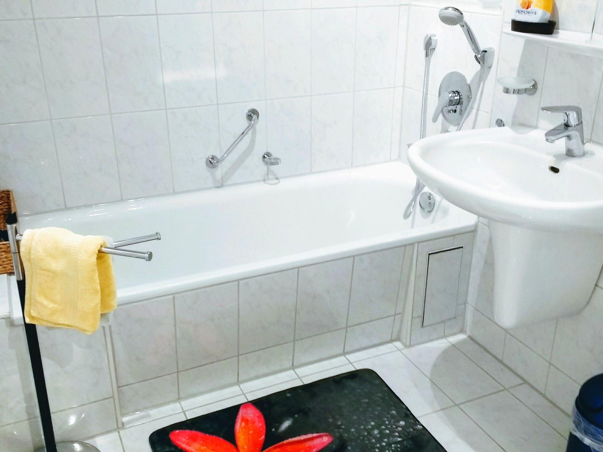 Das Bad (5 qm) ist mit Badewanne, Fön und Handtücher ausgestattet. Ferner erhalten Sie die Bettwäsche (incl. 1x wöchentlicher Wechsel) gestellt.