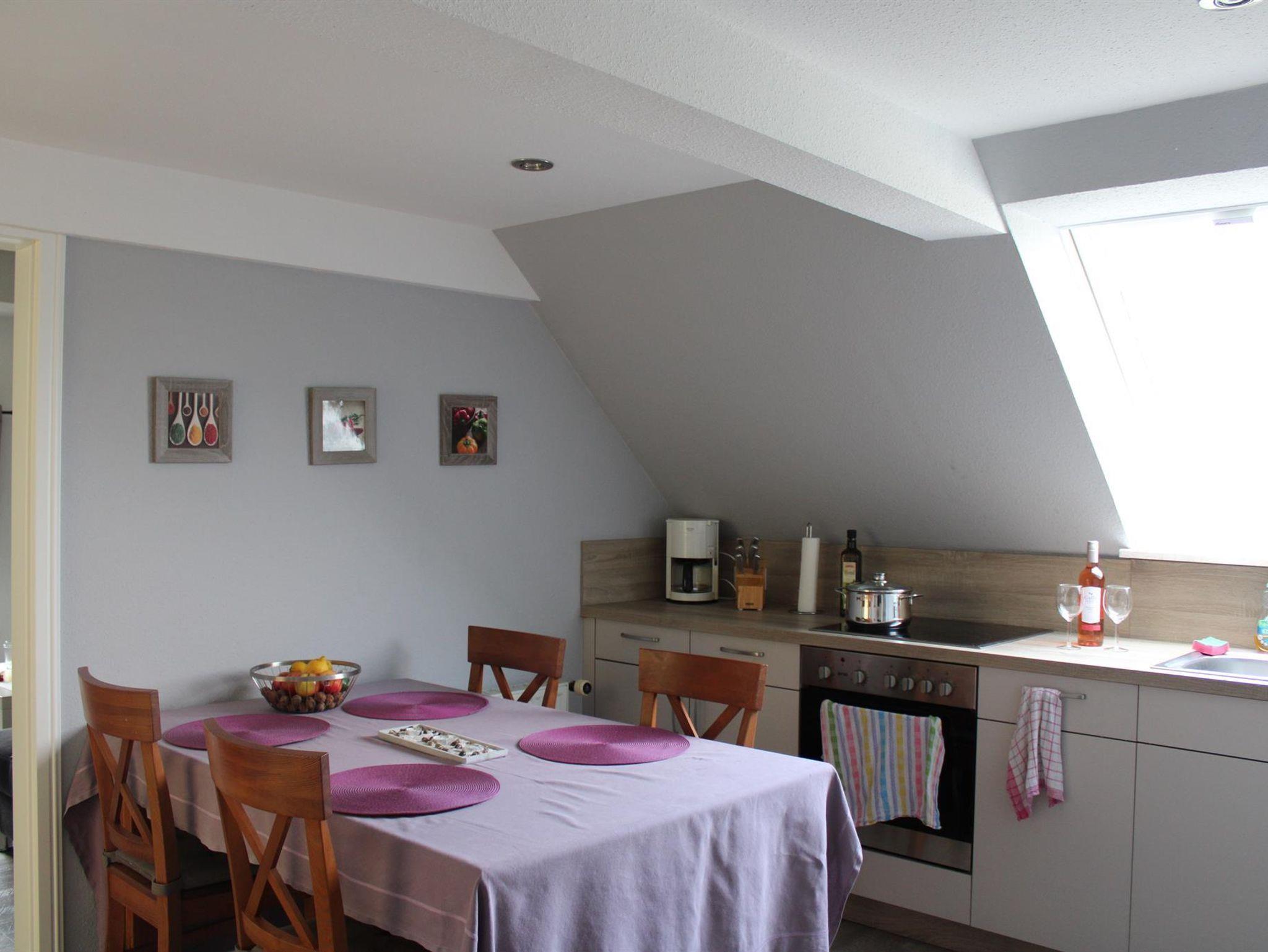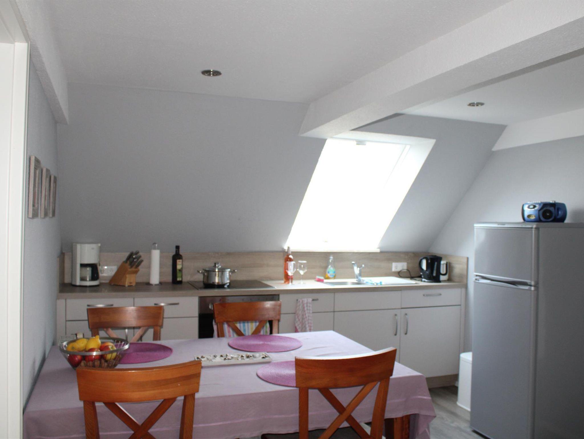 - 1 komplett eingerichte offene Küche mit Mikrowelle, Kühlschrank mit Gefrierfach und Geschirrspüler und Essecke