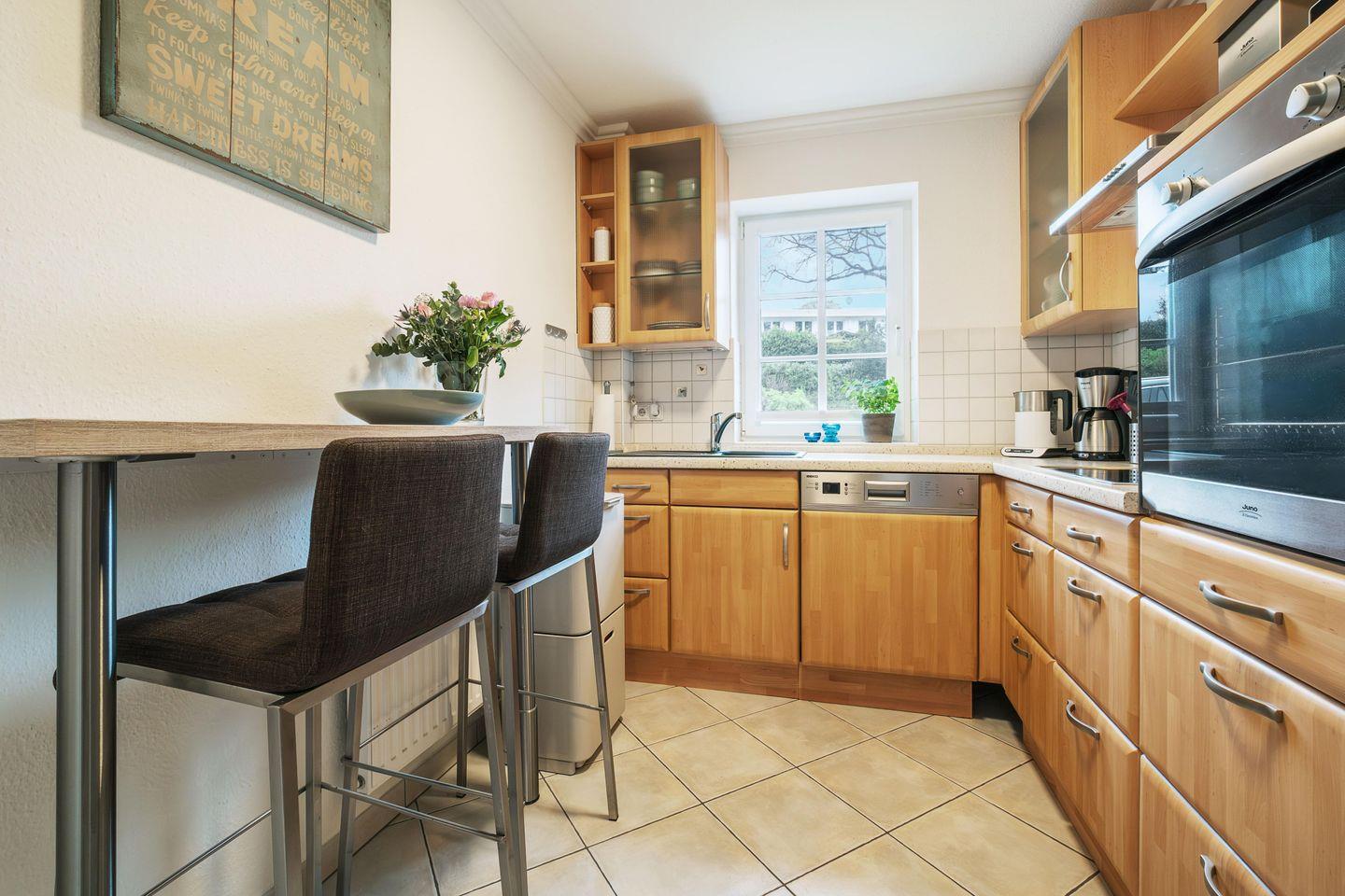 Der großzügige Wohn-/Essbereich mit Schlafcouch (140 x 200 cm), Smart TV und dem großen Esstisch für 4 Personen ist der Mittelpunkt der Wohnung. Hier ist Platz für gemütliche Stunden und gemeinsame Mahlzeiten, die in der voll ausgestatteten Küche zubereitet werden können. Von hier aus geht es auch auf die Sonnenterrasse und in den eigenen Garten.
