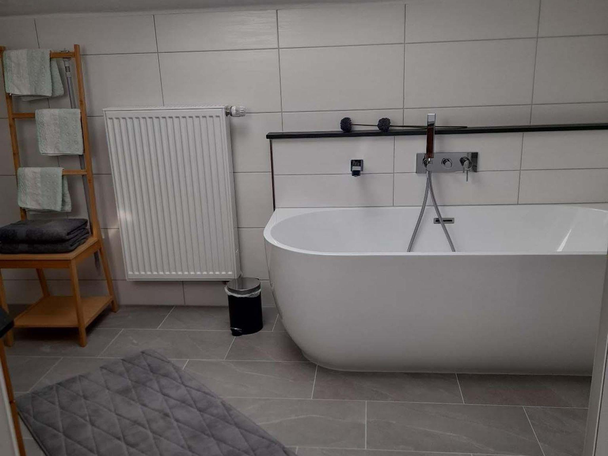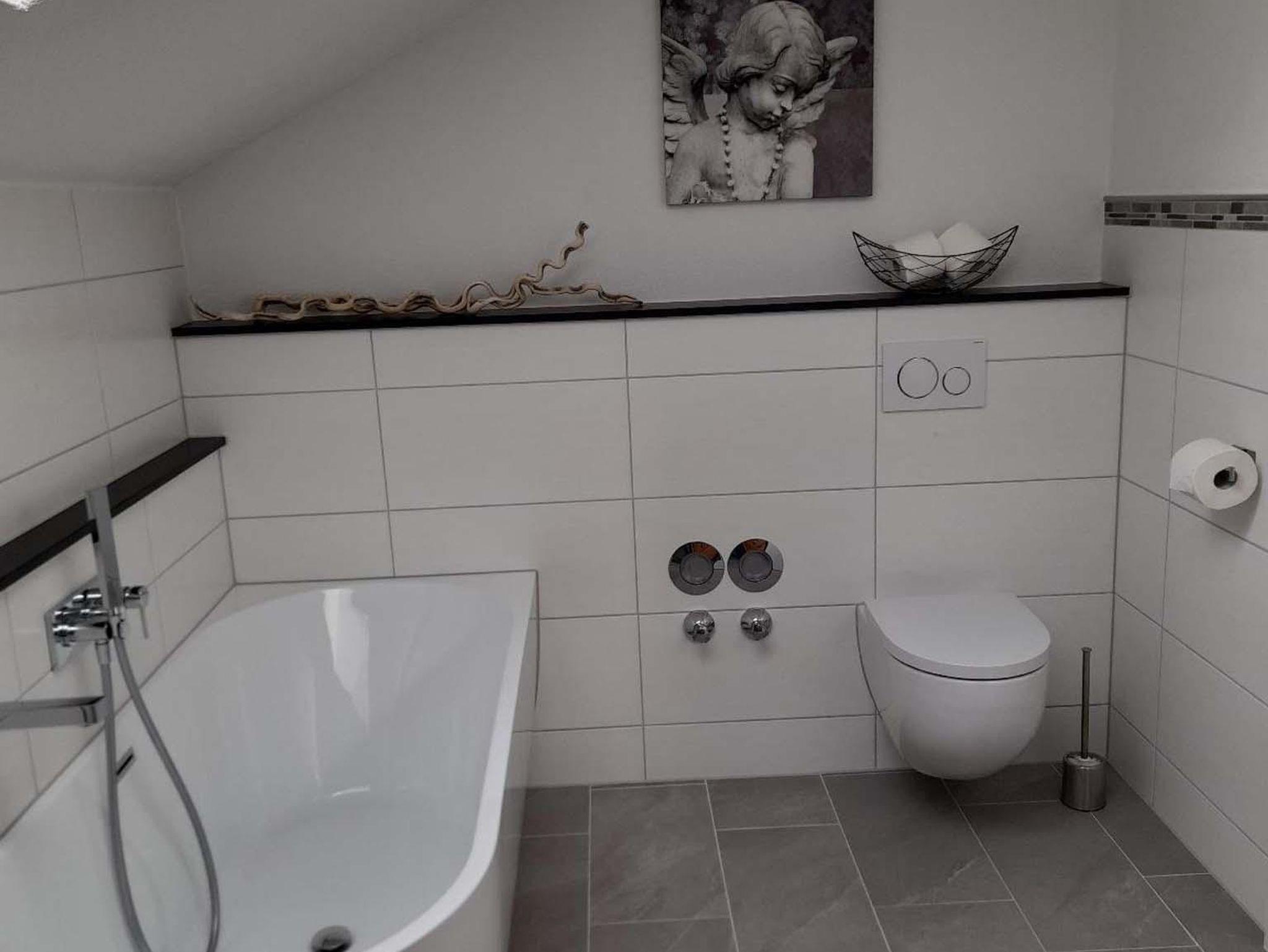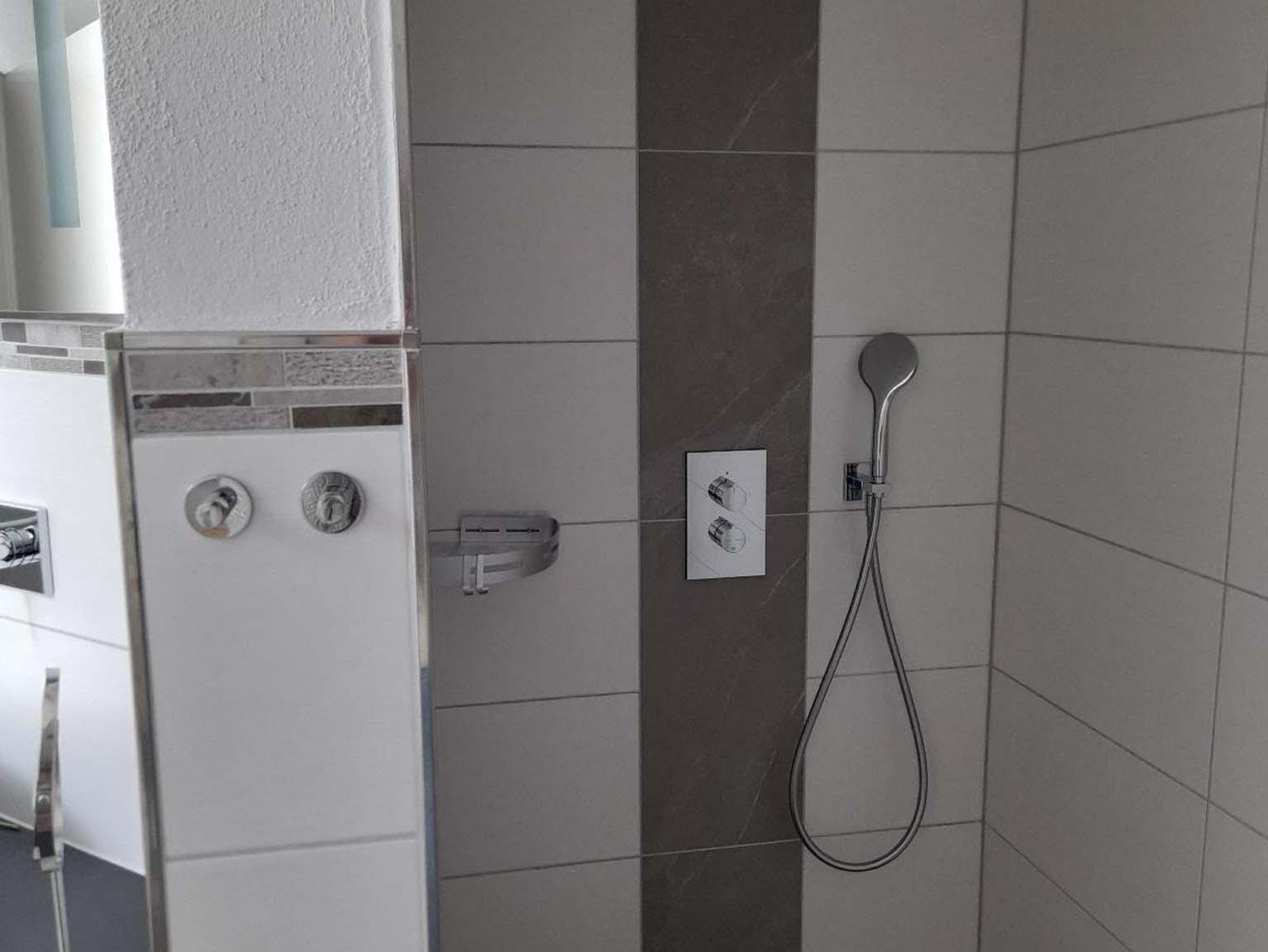 Das geräumige Badezimmer mit ebenerdiger Dusche und Regenbrause, Badewanne, großem Spiegel, Hand- und Badetücher runden das Gesamtbild ab.