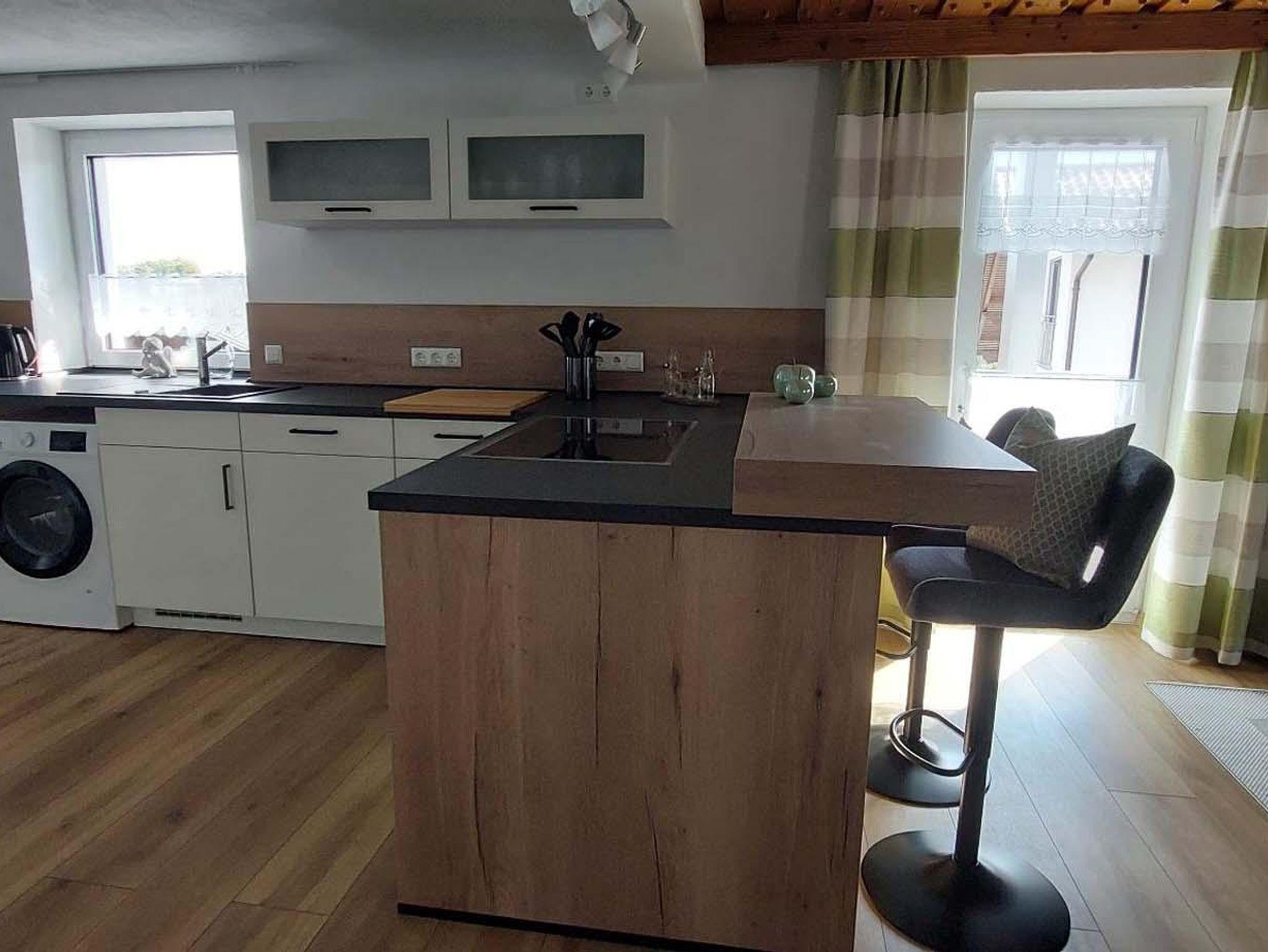 Das gemütliche Wohnzimmer mit großer Couch und Flachbildschirm Sat-TV lädt zum Verweilen ein. Der komplett ausgestattete offene Küchenbereich mit Tresen und Barhocker, Geschirrspüler, Kühlschrank, Gefrierschrank, E-Herd, Backofen, Mikrowelle, Wasserkocher, Kaffeevollautomat und Toaster lässt keine Wünsche offen.