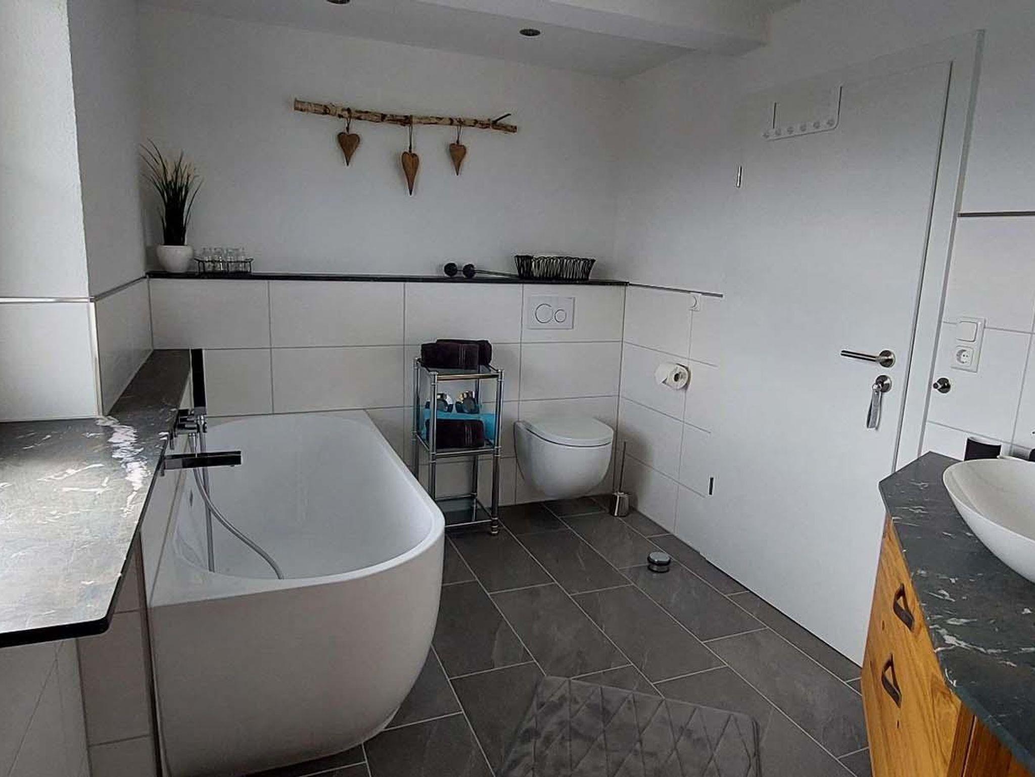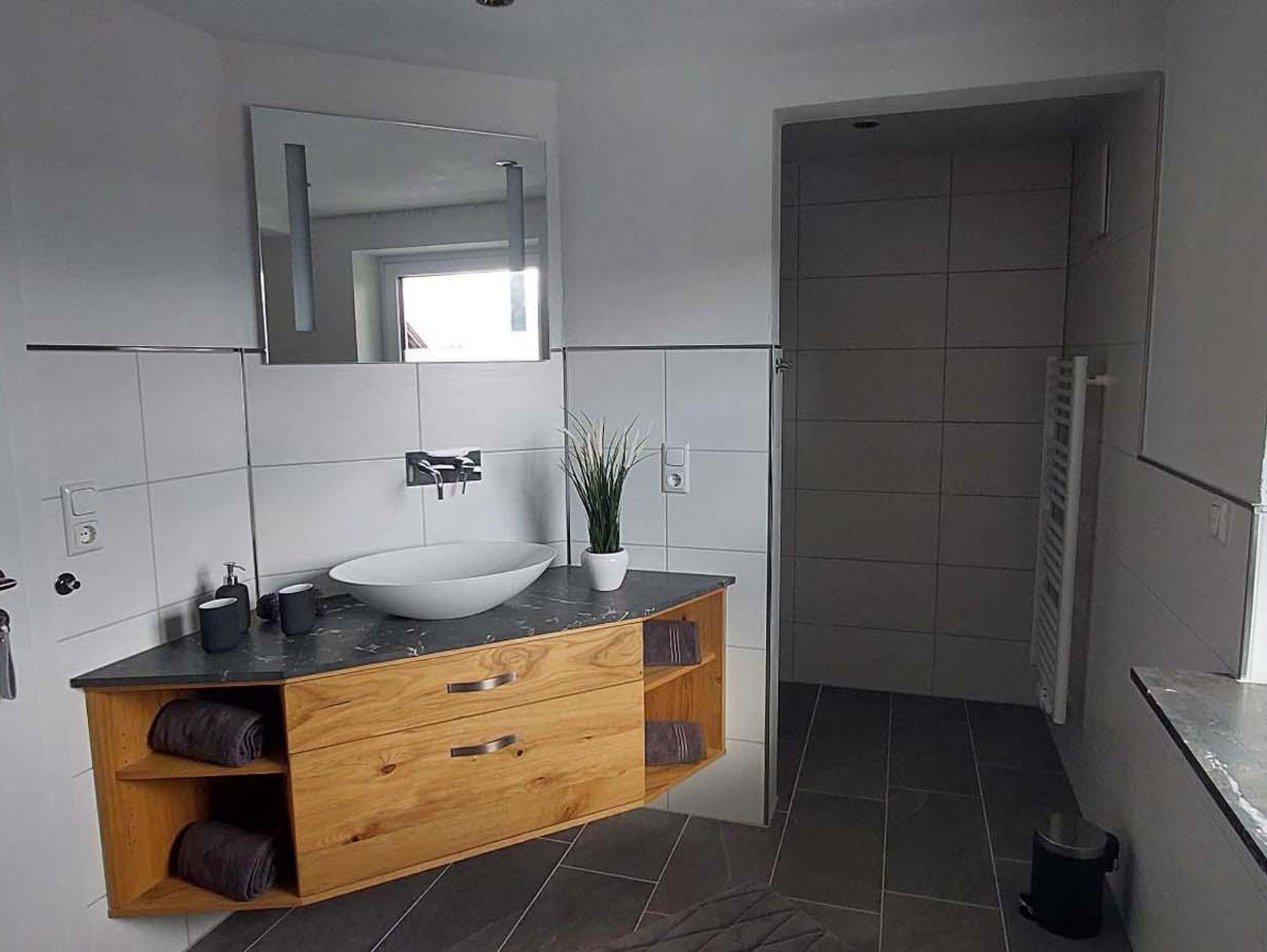 Das geräumige Badezimmer mit ebenerdiger Dusche und Regenbrause, Badewanne, großem Spiegel, Hand- und Badetücher runden das Gesamtbild ab.