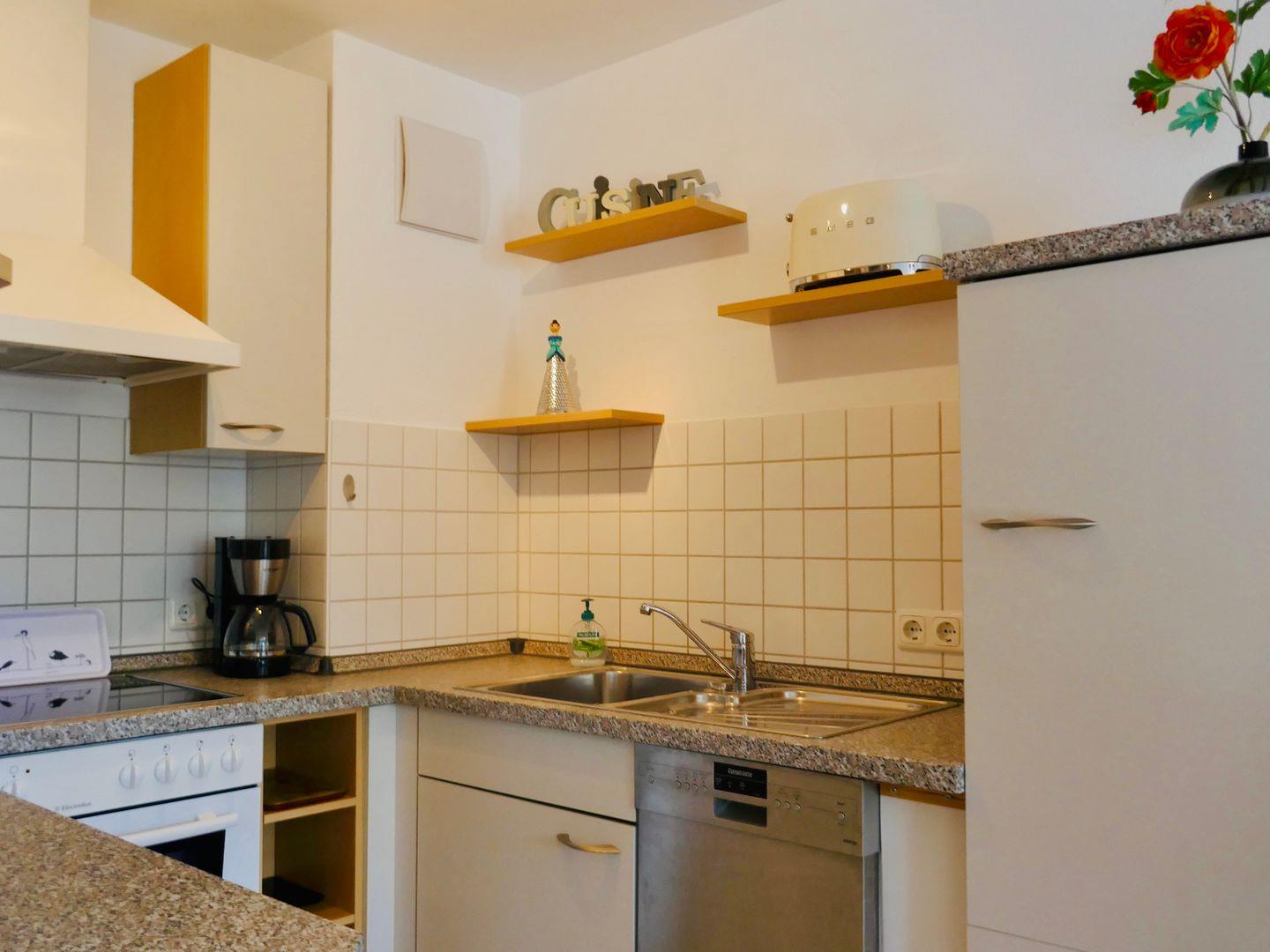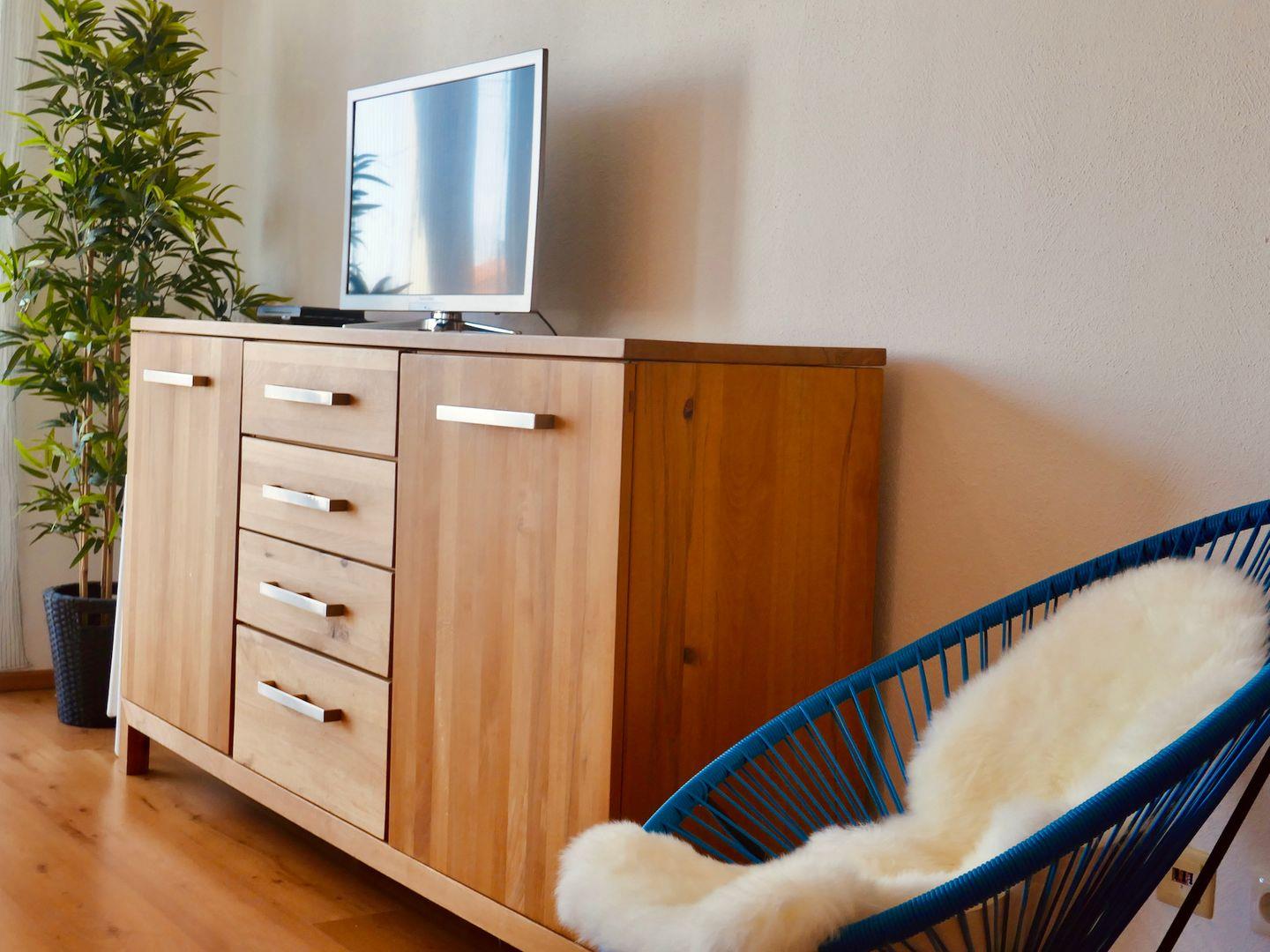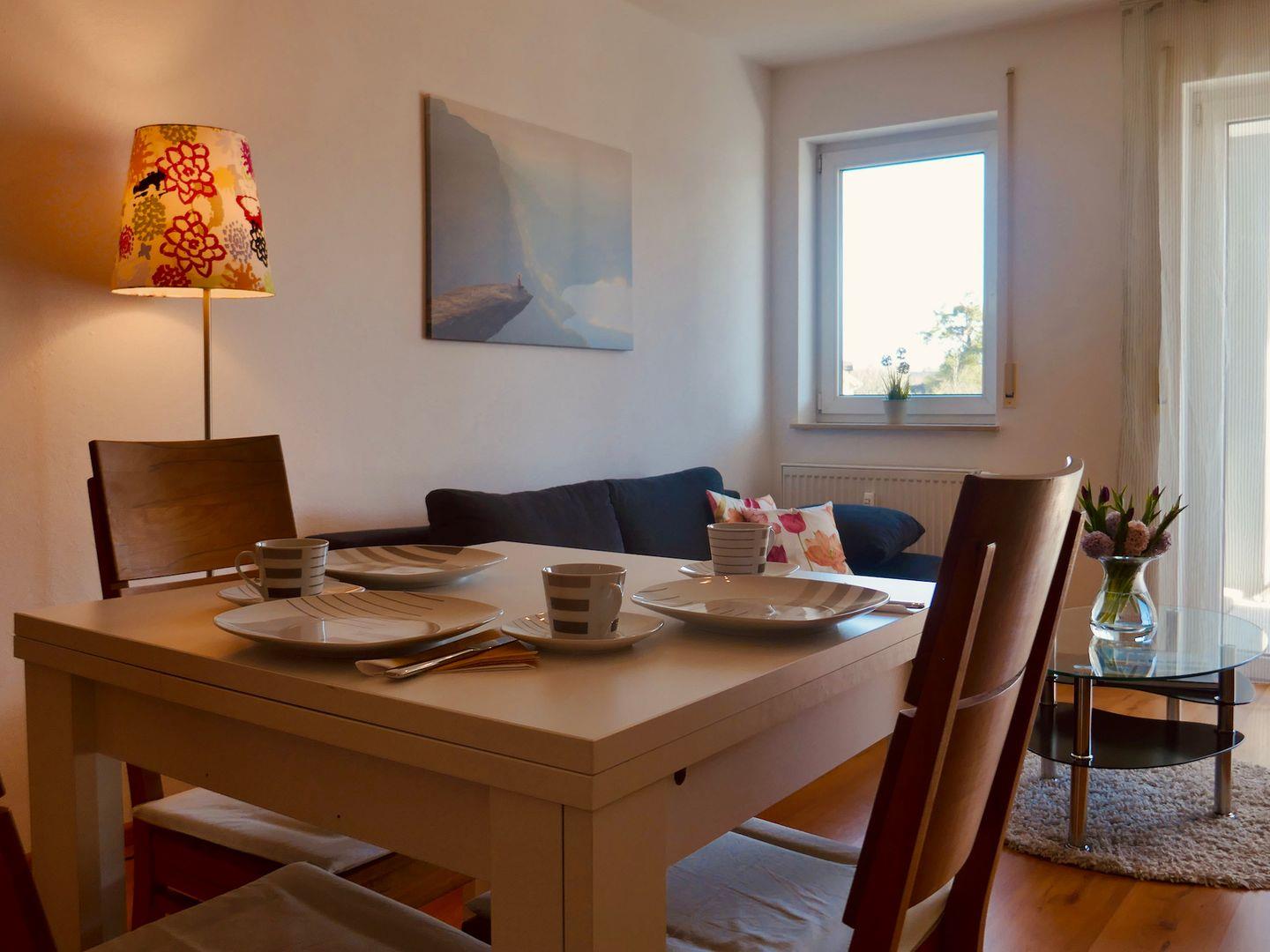 Vom Schlaf- und Wohnzimmer haben Sie direkten Zugang zum überdachten großen Südbalkon, auf dem Sie ruhige Sommernachmittage und laue Nächte genießen können. Auf der gemütlichen (ausziehbaren) Couch im Wohnzimmer, die bei Bedarf auch als zusätzliche Schlafgelegenheit nutzbar ist, können Sie Ihre Abende bei einem Glas Wein und stimmungsvoller Hintergrundmusik durch das Bluetooth fähige Radio ausklingen lassen. Die voll ausgestattete Küche und das Bad mit Badewanne und Dusche bieten alles was Sie für Ihren Aufenthalt benötigen.