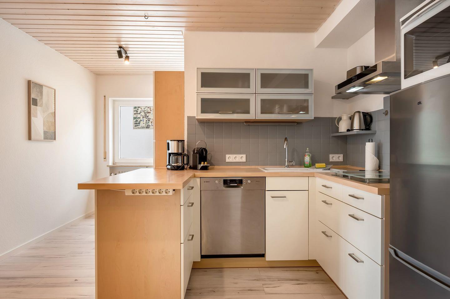 Die gut ausgestattete Küche im Eingangsbereich bietet alles, was Sie für die Selbstversorgung benötigen: Cerankochfeld, Backofen, Kühlschrank, Spülmaschine, Wasserkocher, Toaster sowie eine Kaffeemaschine und eine Nespresso-Espressomaschine. Geschirr, Besteck, Küchenutensilien, Geschirrhandtücher sowie eine praktische Erstausstattung mit Gewürzen und Reinigungsmitteln sind ebenfalls vorhanden. Im Waschraum findet sich eine Waschmaschine und Trockner zur gemeinsamen Nutzung mit der Ferienwohnung Morgensonne.