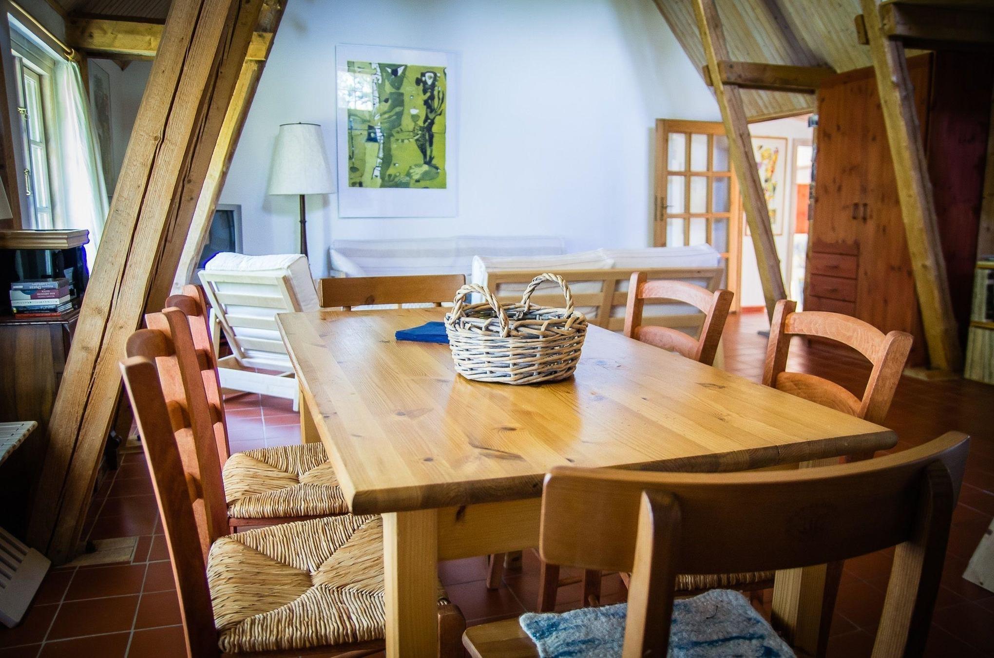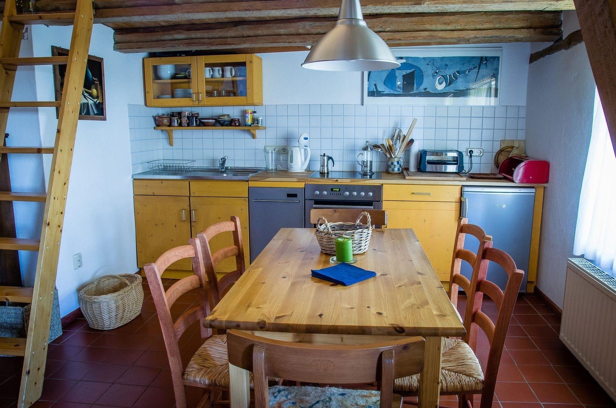 Die Ferienwohnung befindet sich in einer Haushälfte des einstigen Fischerkatens mit eigenem Eingang. Ein großzügiger Wohnloft mit Küchenzeile, Kaffeemaschine, Geschirrspüler, CD-Player, USB-Anschluss, Radio und reichlich interessante Bücher sowie einer großen Sitzgruppe ist modern gestaltet unter Bewahrung der alten Bauweise. Das WLAN ist ans Glasfasernetz angeschlossen zuverlässig schnell (50/10 Mbit down/upload). Wer beruflich etwas machen muss, kann also auch Videokonferenzen ohne Probleme abhalten.
