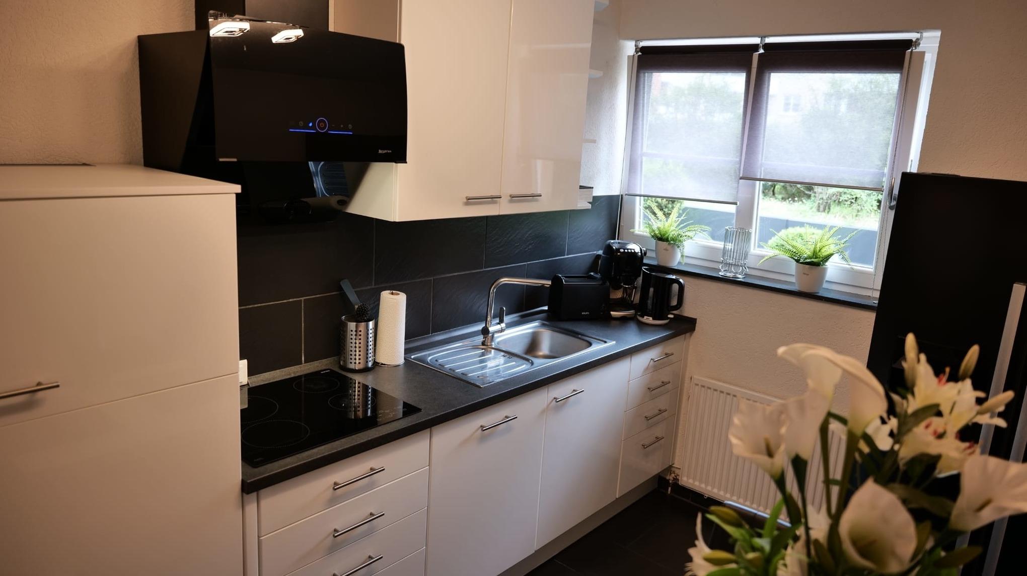 Im Wohnzimmer könnt ihr es euch auf der großen Sofalandschaft gemütlich machen und entweder die Ruhe mit Blick auf den Kamin genießen, oder euch von dem 75 Zoll Smart-TV entertainen lassen. Dem Livingroom angeschlossen ist die hochwertige Designerküche mit Markengeräten und einem Side-by-Side Kühlschrank inkl. Gefrierkombi, und ein Gäste-WC.