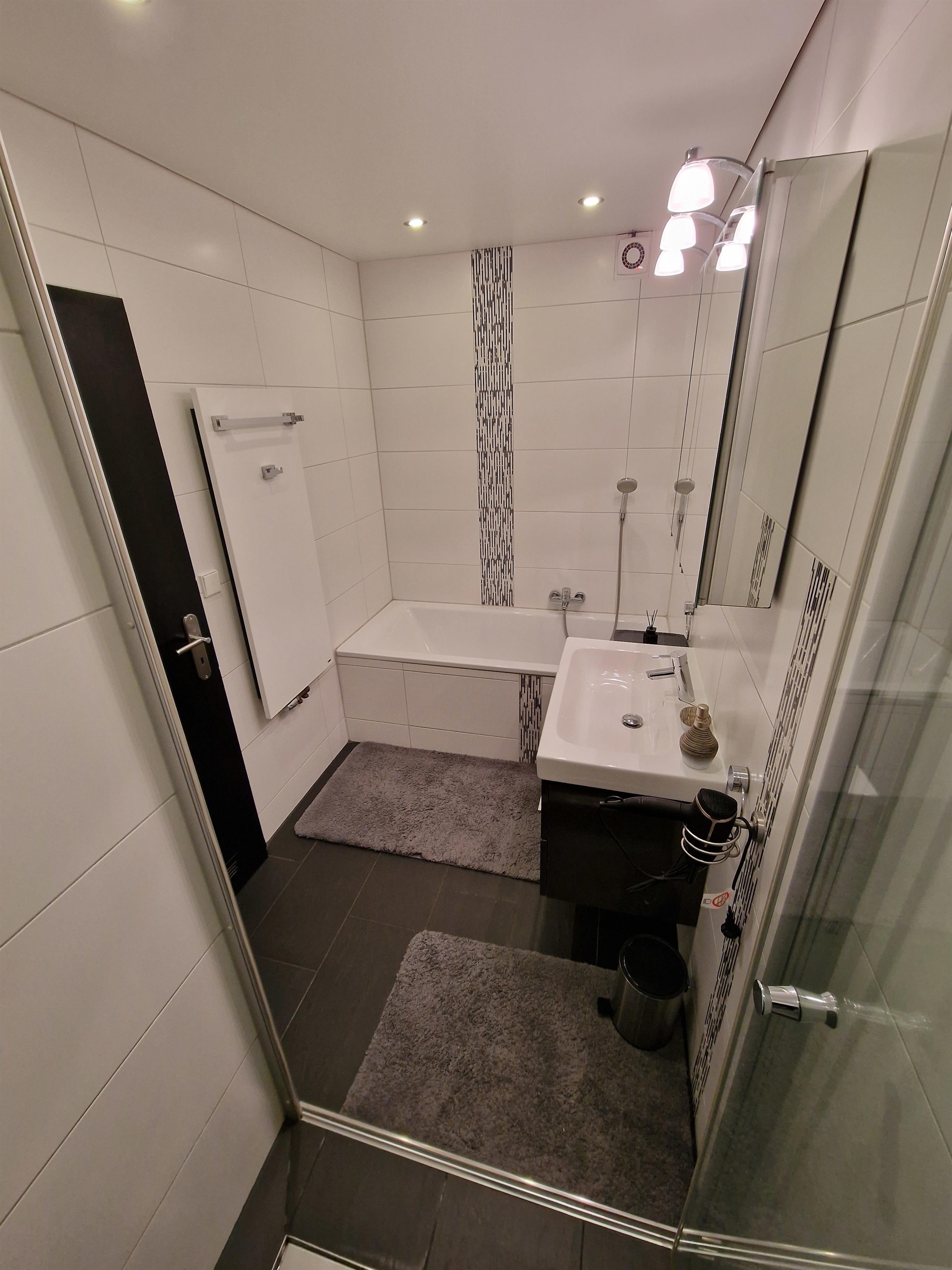 Eine Treppe führt Sie in das Obergeschoss, wo sich 2 Schlafräume befinden. Ebenfalls finden Sie hier das stilvoll geflieste Badezimmer mit wohltuender Badewanne und Regendusche sowie ein separates WC und Ankleidezimmer.
