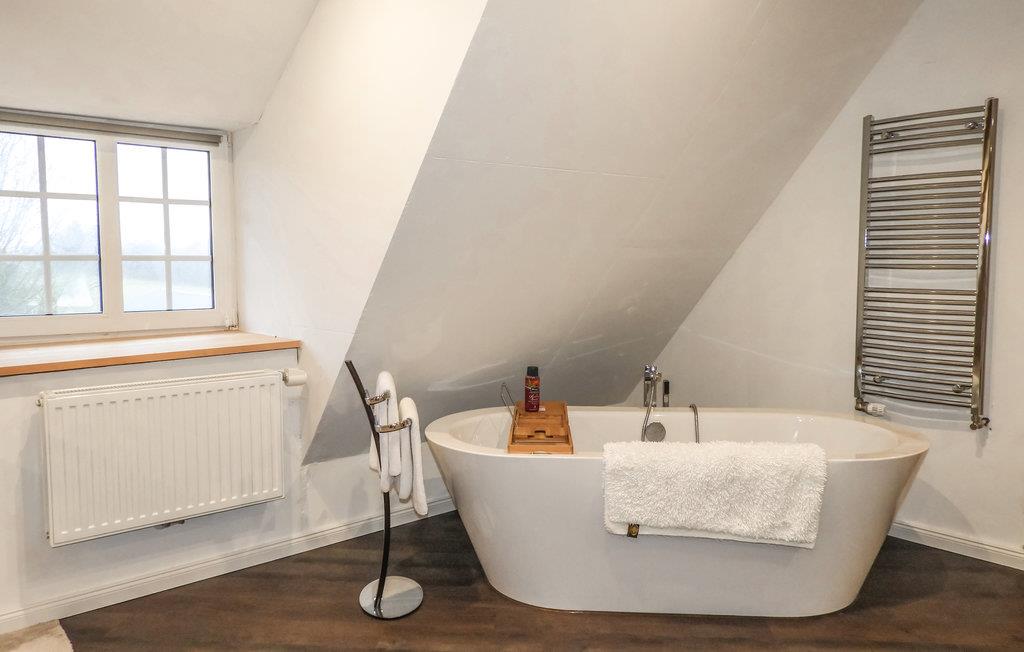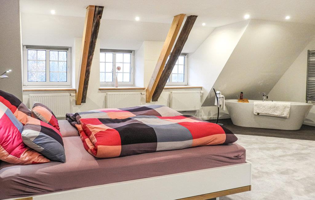 Im ersten Stock ist das Highlight dieses Hauses das 52m² große Schlafzimmer mit einer freistehenden Badewanne. Das Reetdach sorgt gerade hier für ein angenehmes Wohnklima bei jedem Wetter. Ein WC zusätzlich befindet sich auch auf dieser Etage.