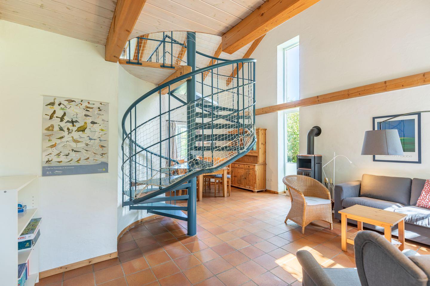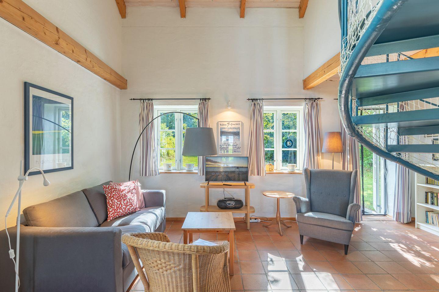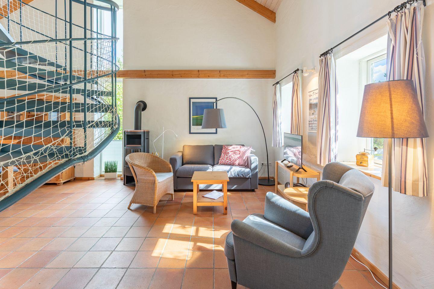 Die Ferienunterkunft empfängt Sie mit einem großzügigen Wohnraum mit hohen Decken. Im Wohnzimmer können Sie es sich auch in der kalten Jahreszeit vor dem prasselndem Feuer im Kaminofen oder dem internetfähigen TV gemütlich machen. Am großen Esstisch finden Sie genügend Platz für Essen und Spiele. Die Küche ist mit allem Notwendigen eingerichtet: Herd mit Ceranfeld, Backofen, Geschirrspülmaschine, Kühlschrank mit Gefrierfach, Toaster, Kaffeemaschine (Filter) und Wasserkocher. In dem Duschbad steht eine Waschmaschine für Sie bereit.