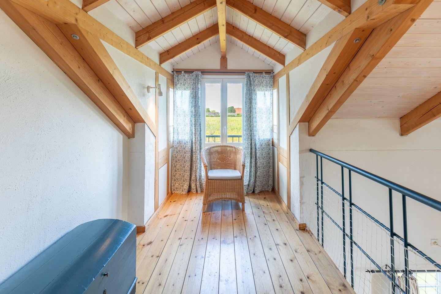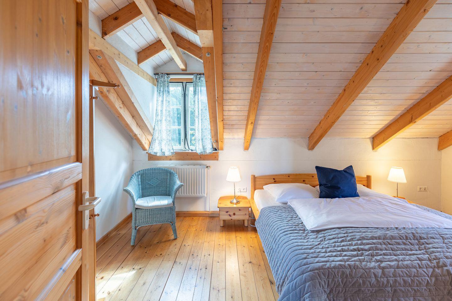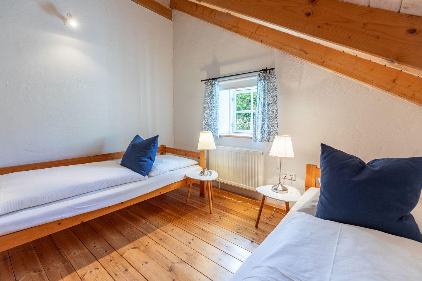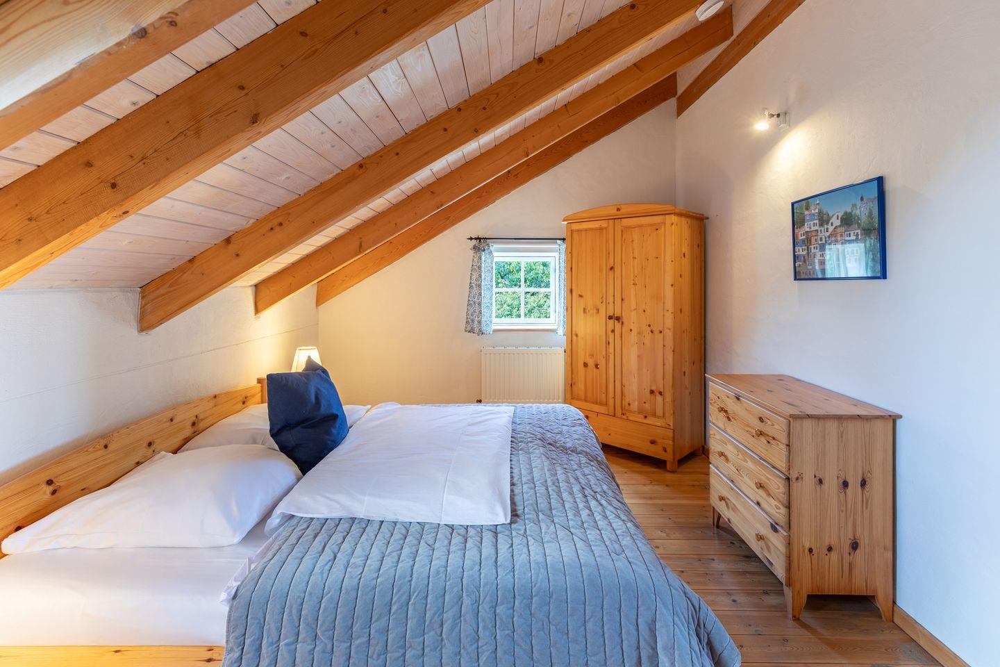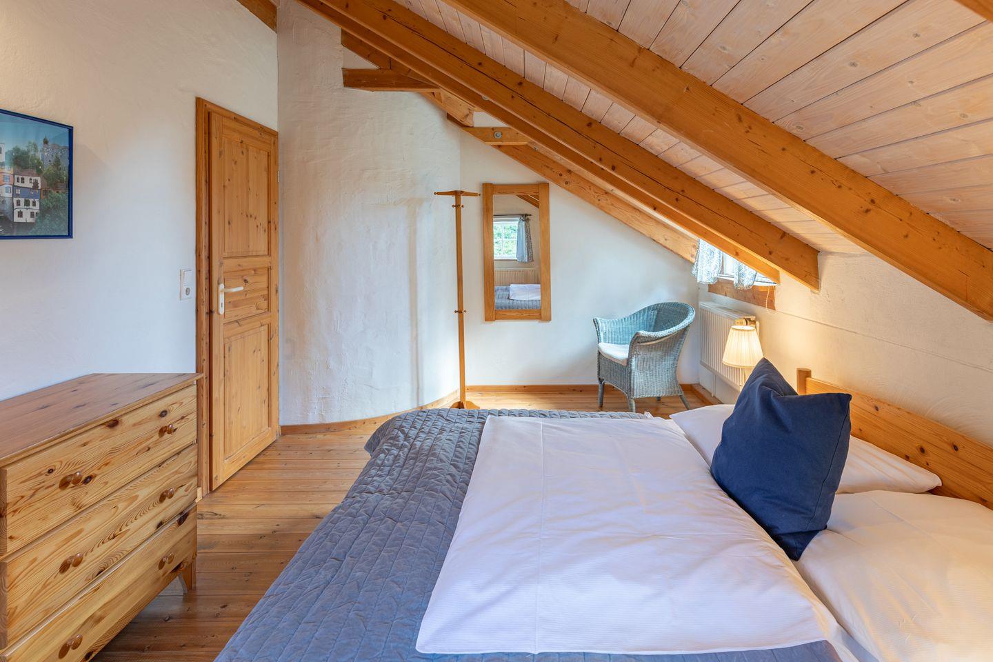 Über eine Wendeltreppe (Treppensicherung vorhanden) gelangen Sie in die beiden Schlafräume mit einem Doppelbett (180 x 200) und zwei Einzelbetten.