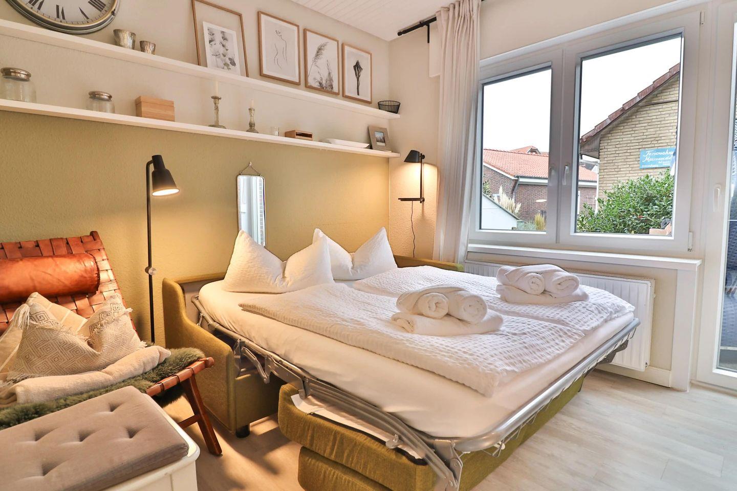 Im Schlafzimmer befindet sich ein bequemes Boxspringbett mit Tonnentaschenfederkern (180 x 200 cm) und ein LCD-TV (32 Zoll) sowie ein Tresor.